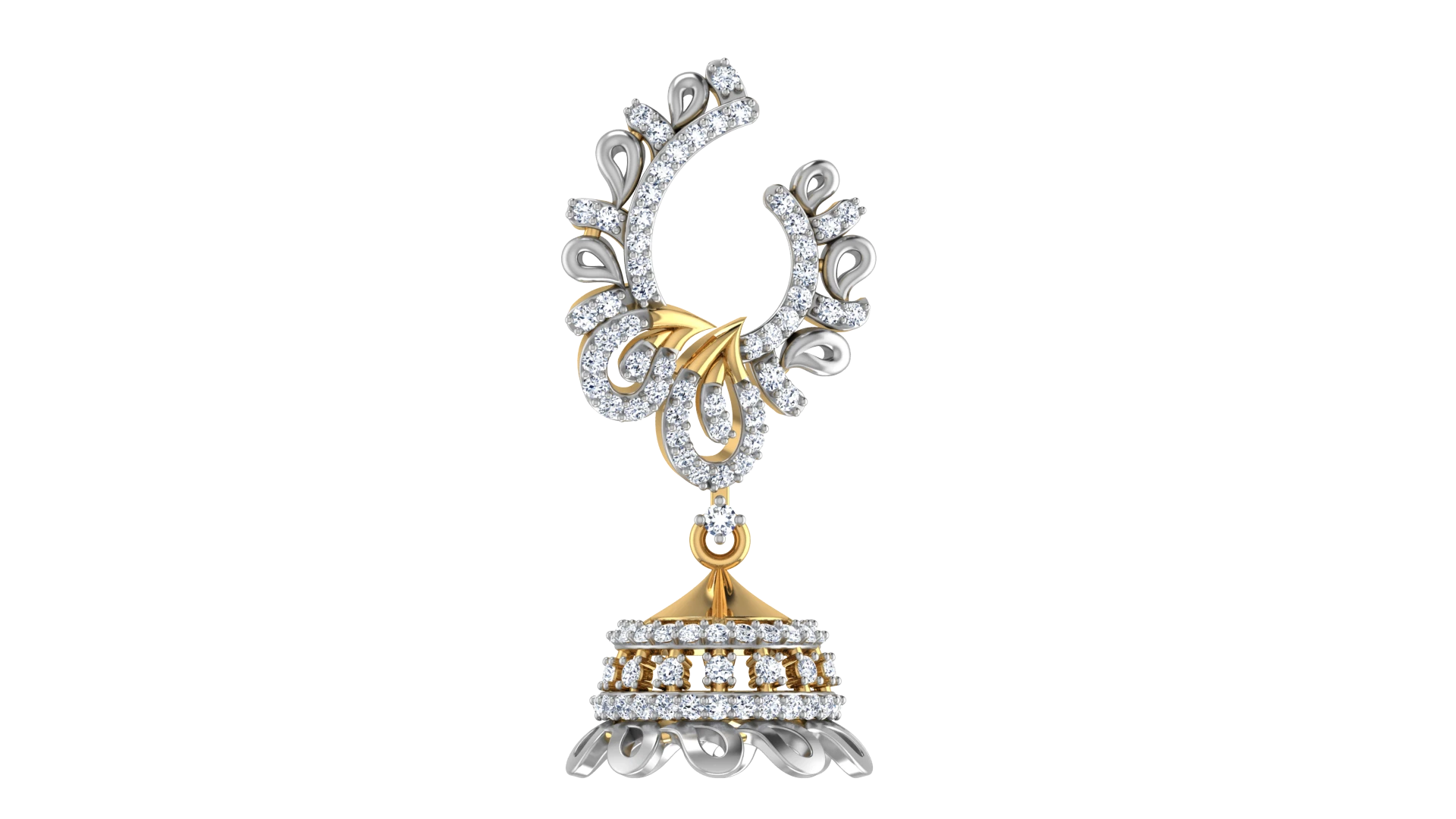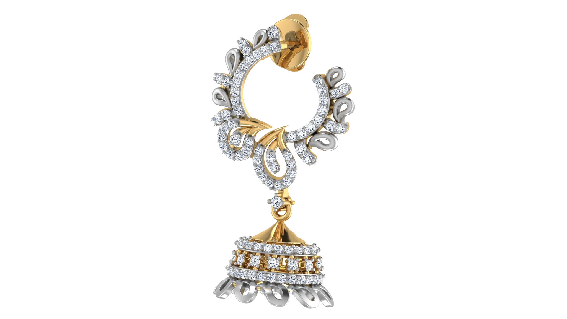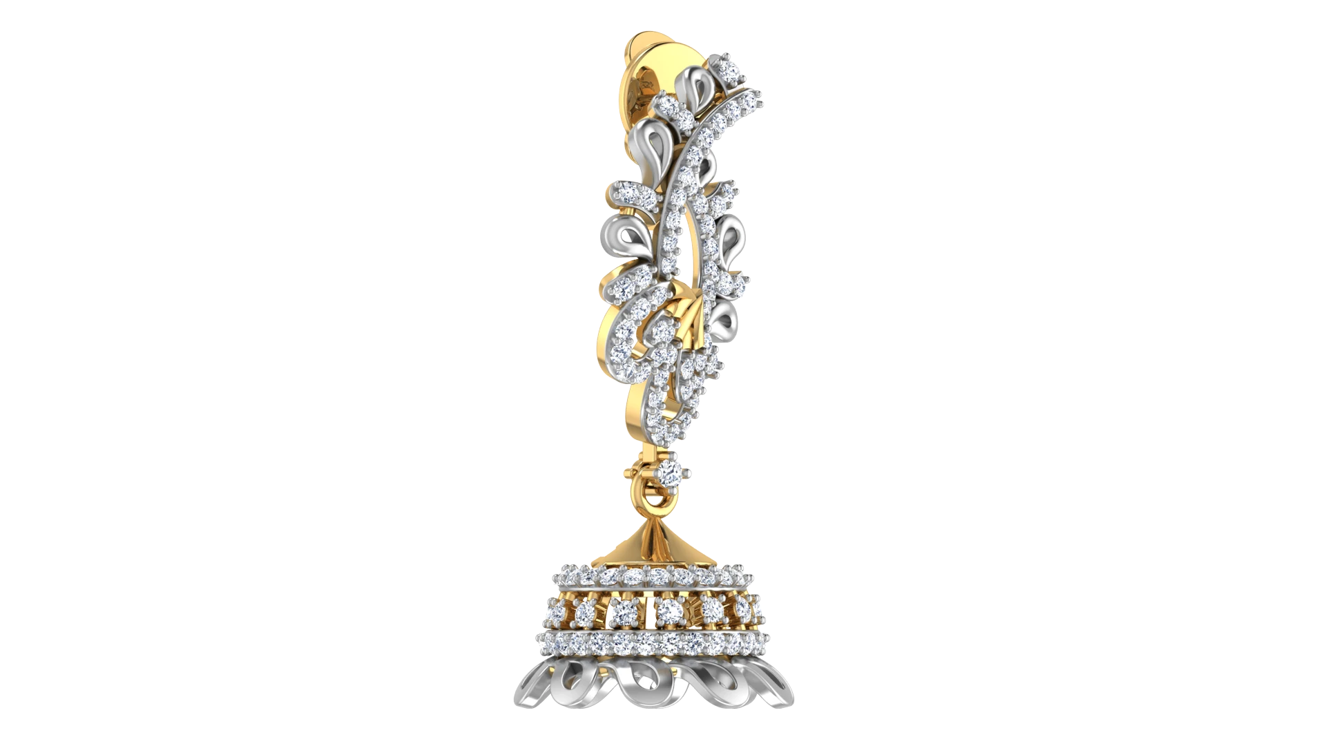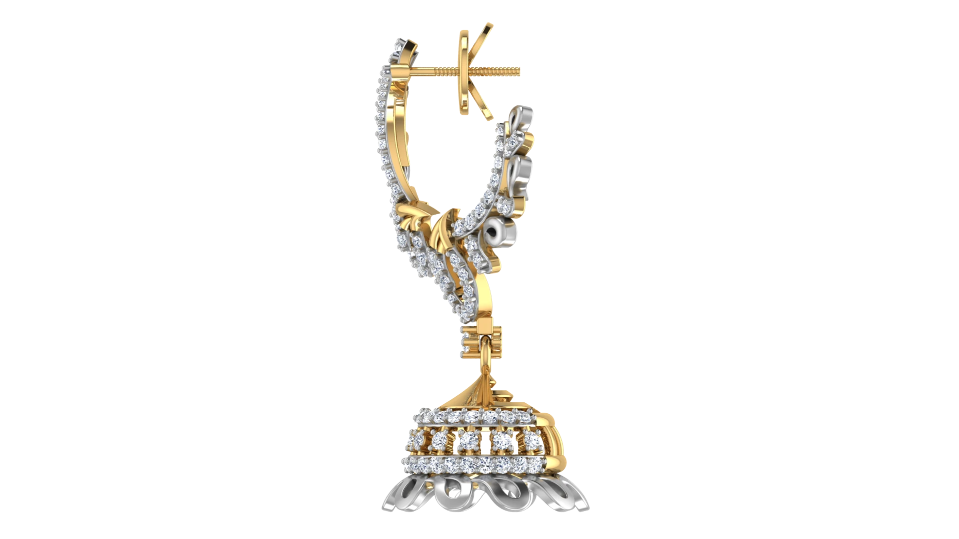 A vintage look with diamonds placed in a symmetrical design on traditional gold jhumkas.