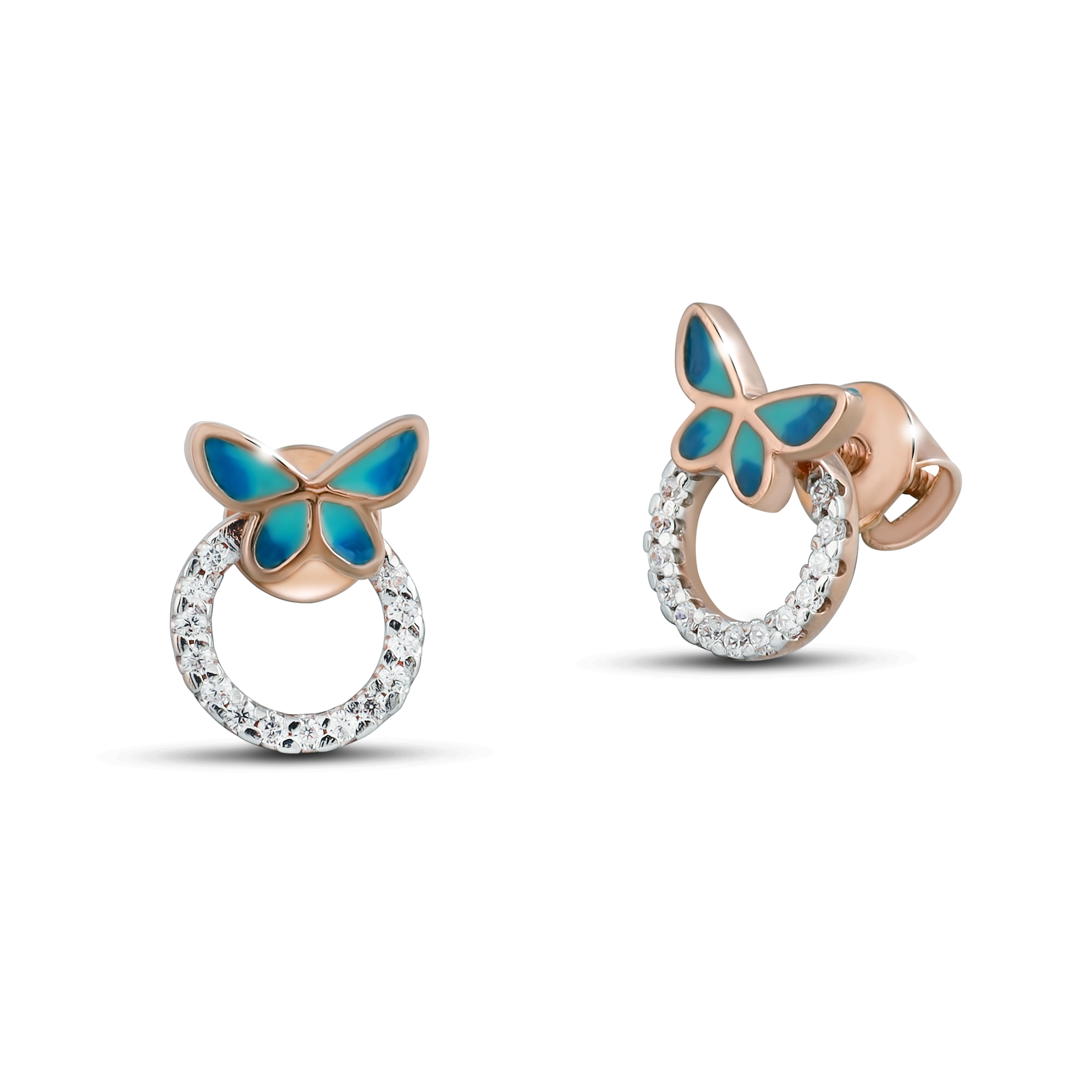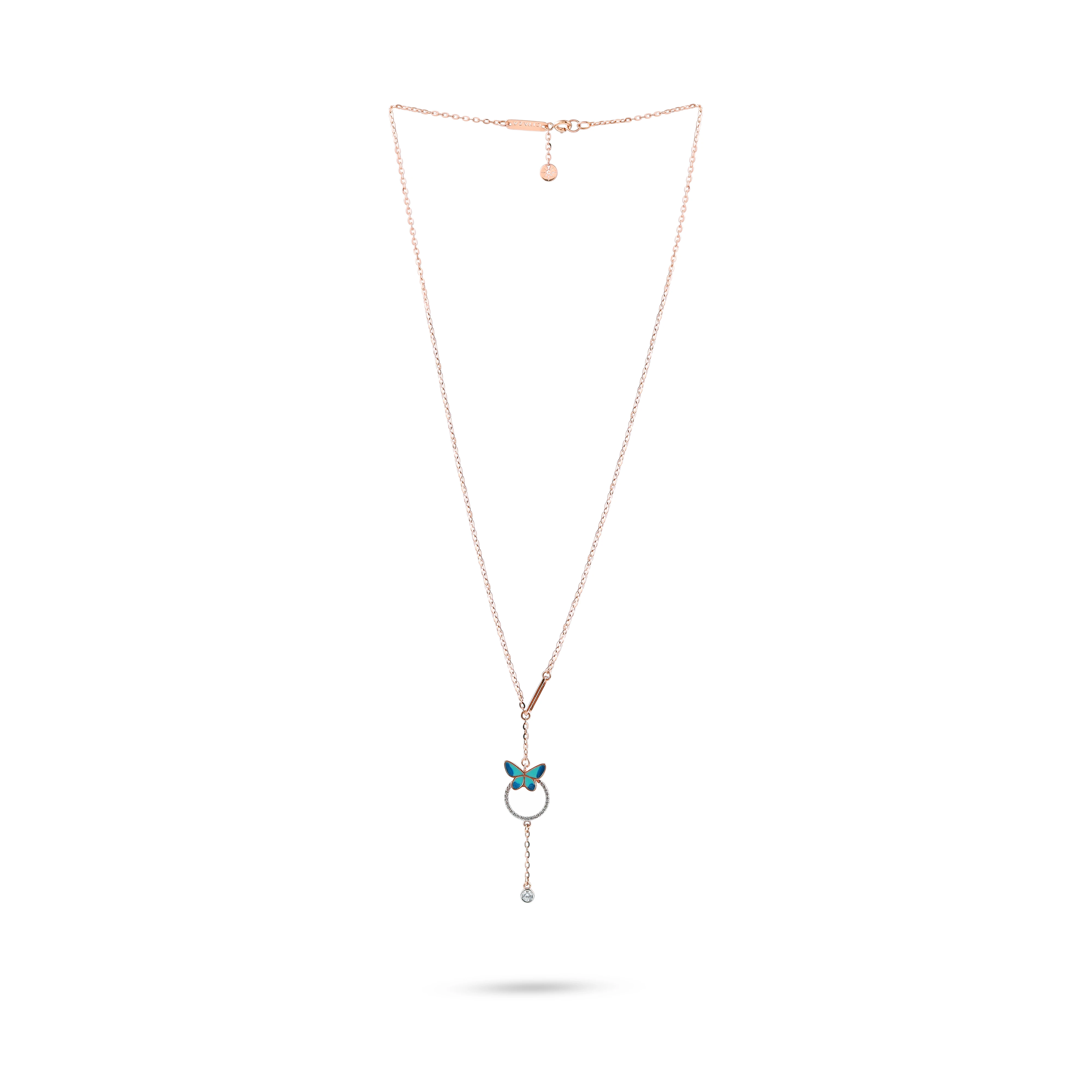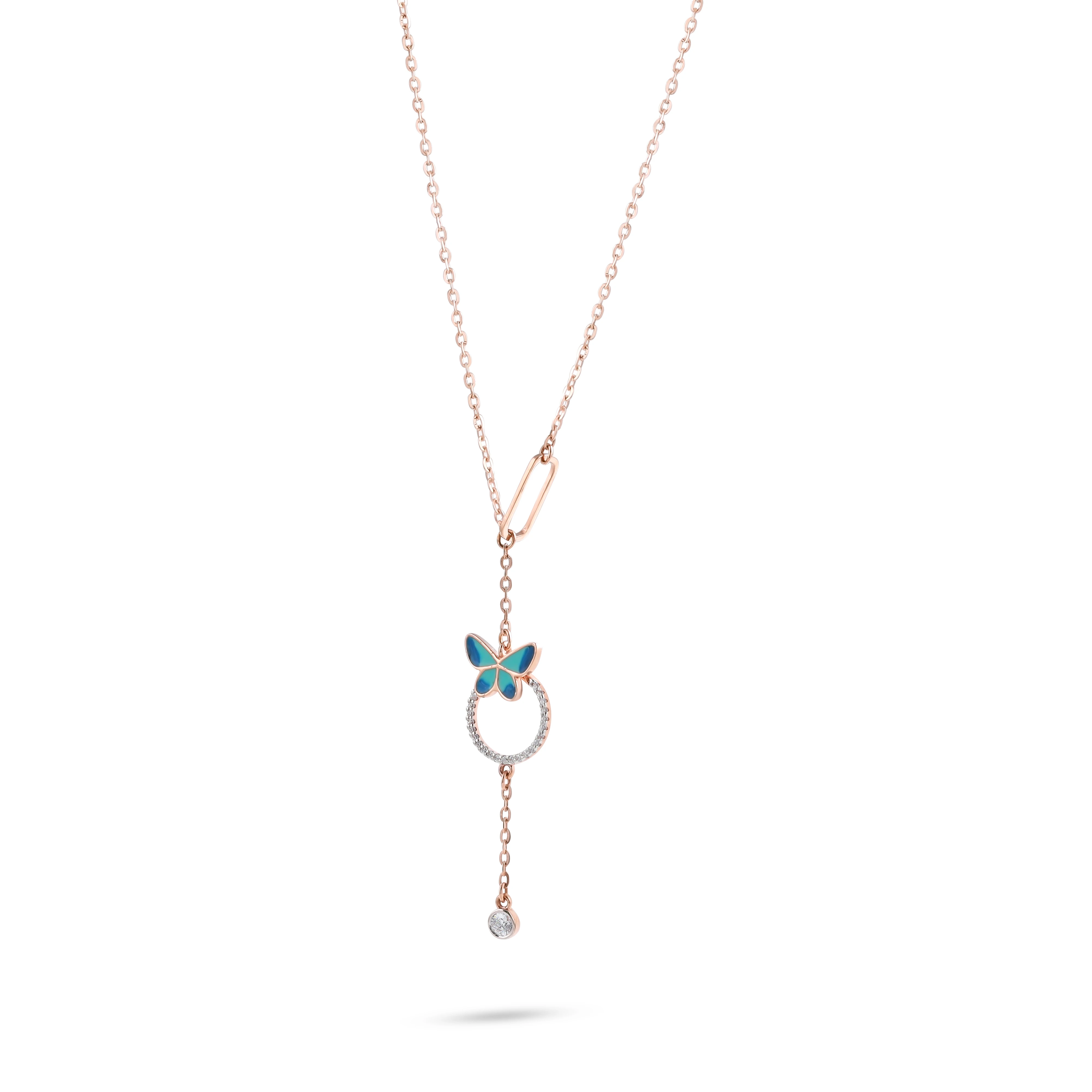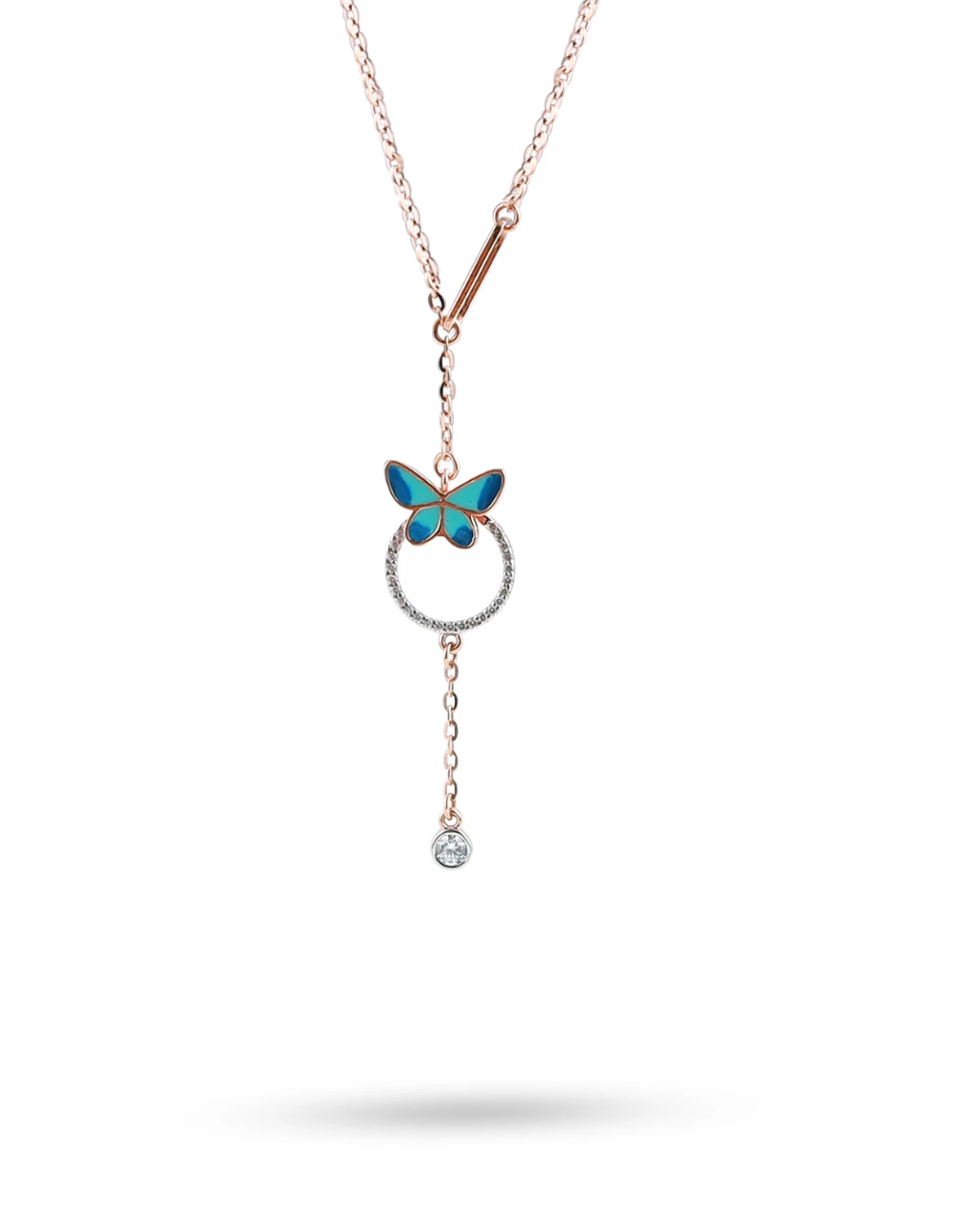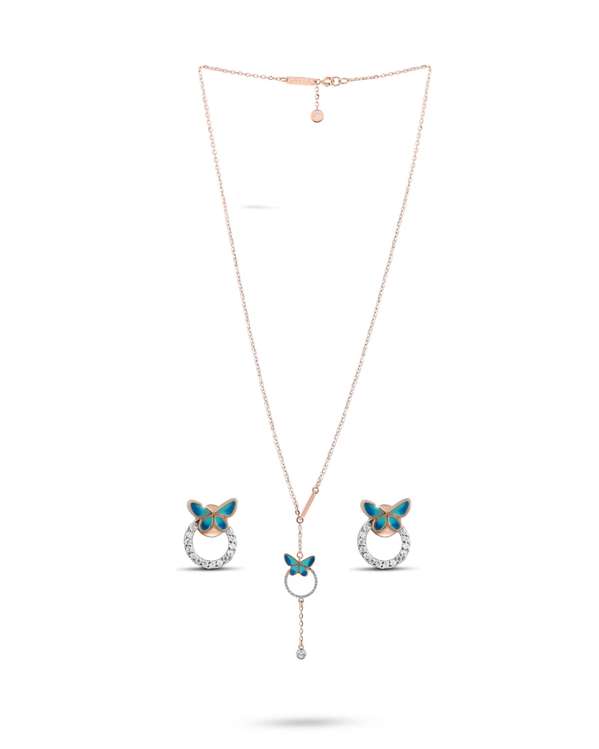 A delicate and elegant jewelry set, featuring a rose gold necklace and matching earrings. The design is centered around a butterfly motif, where the wings are crafted with vibrant shades of blue and teal enamel, creating a striking contrast against the sparkling white stones that form circular elements.