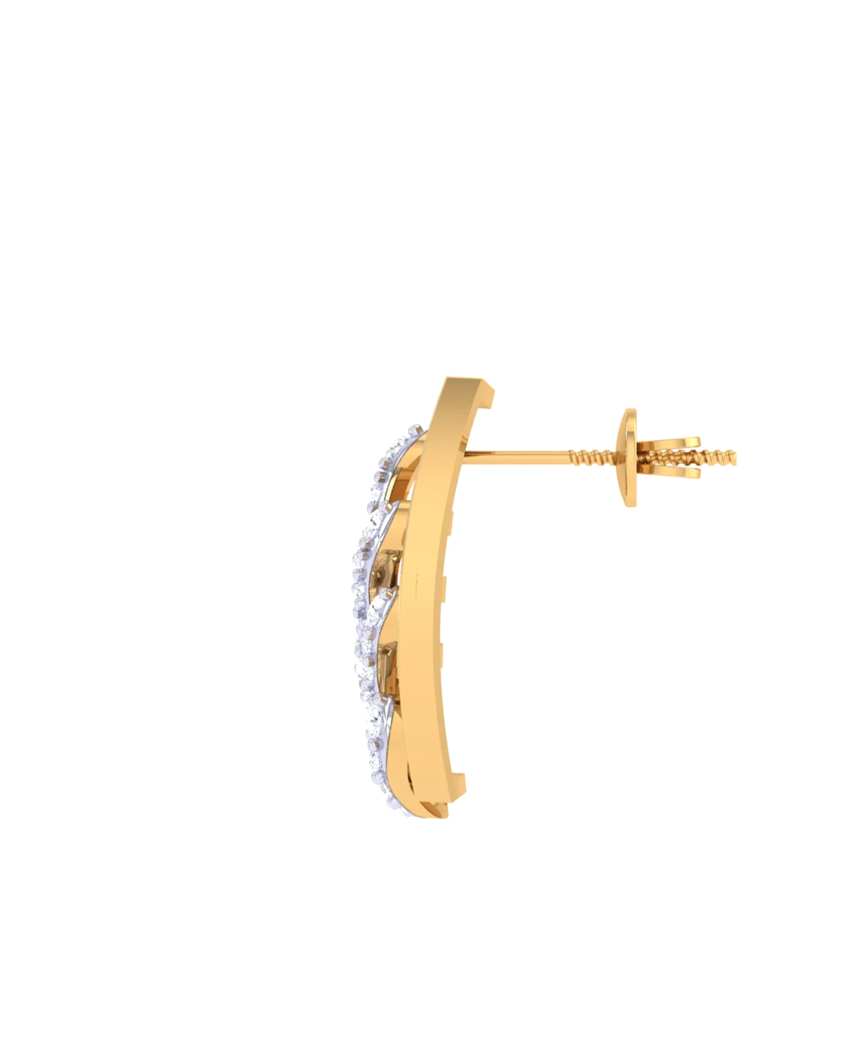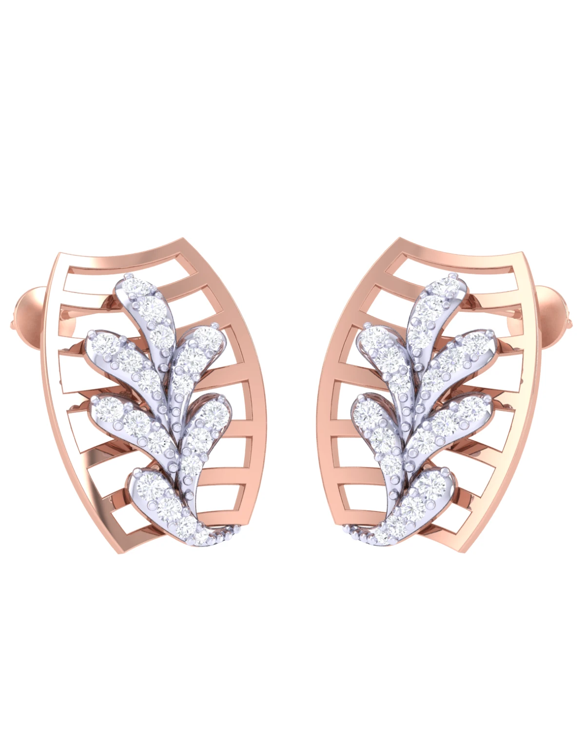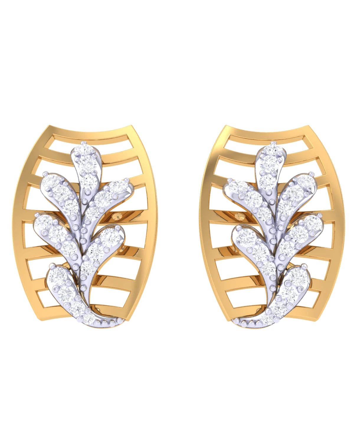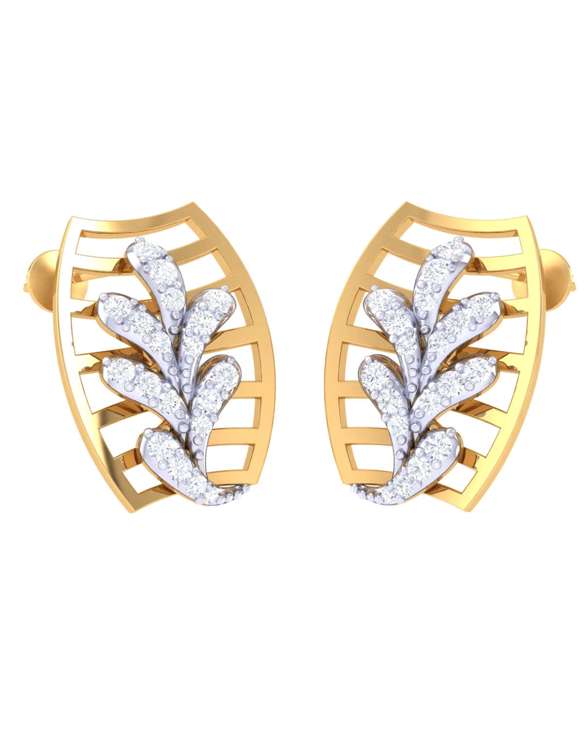 These 18k lab-grown diamond earrings are stud-style with a leaf-inspired design. Each earring features a vertical, shield-shaped frame in 18k gold, with horizontal gold bars creating a ladder-like structure.