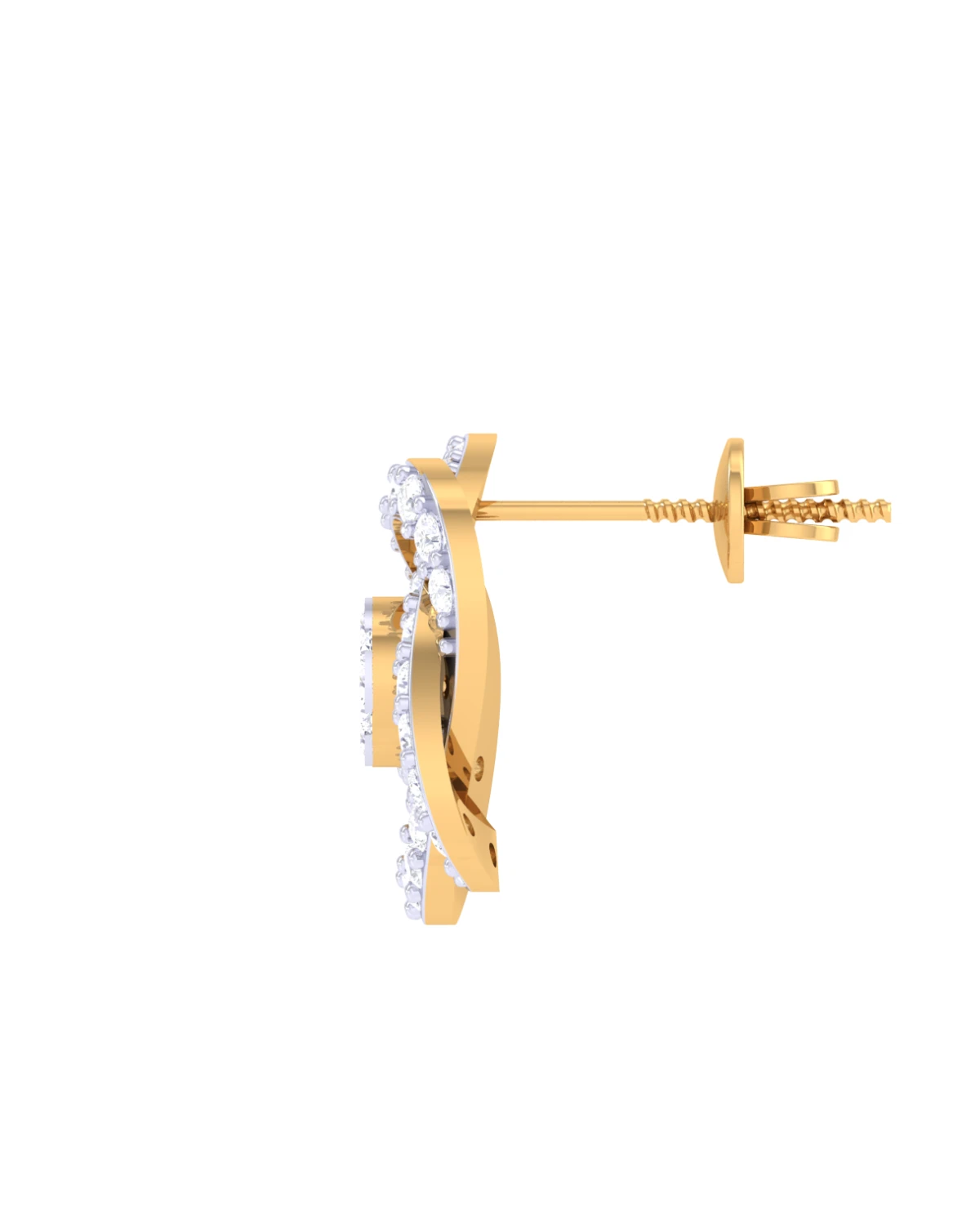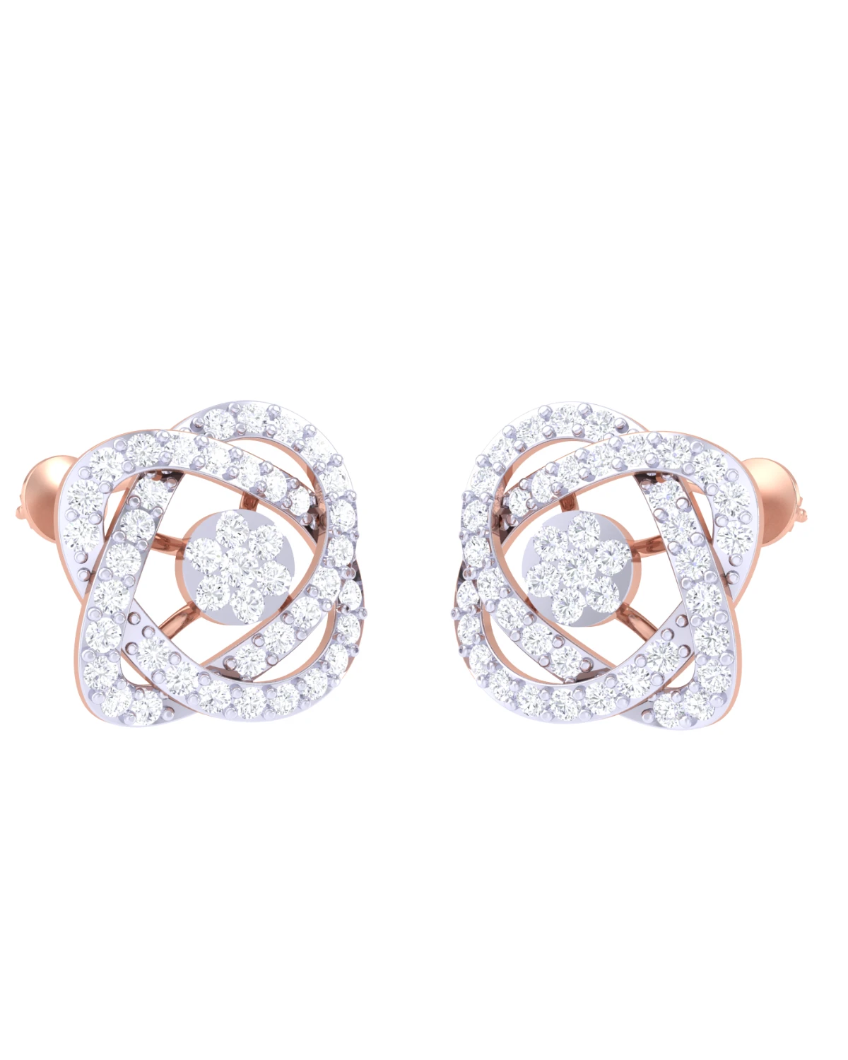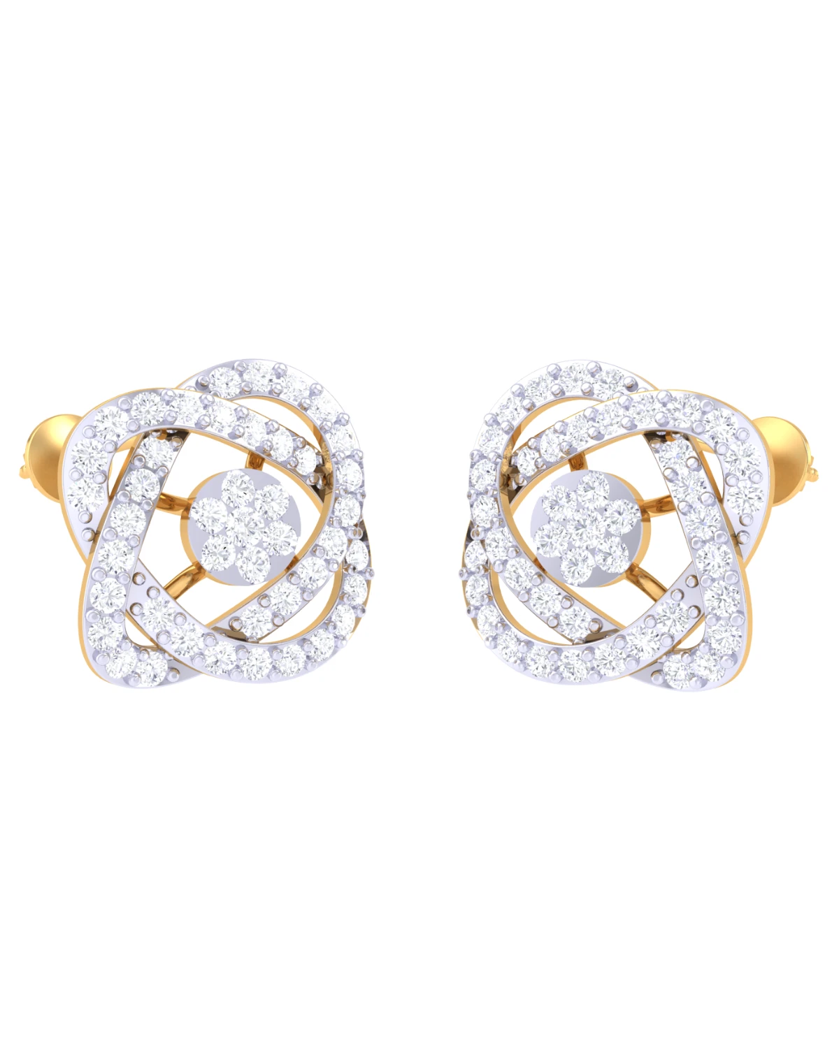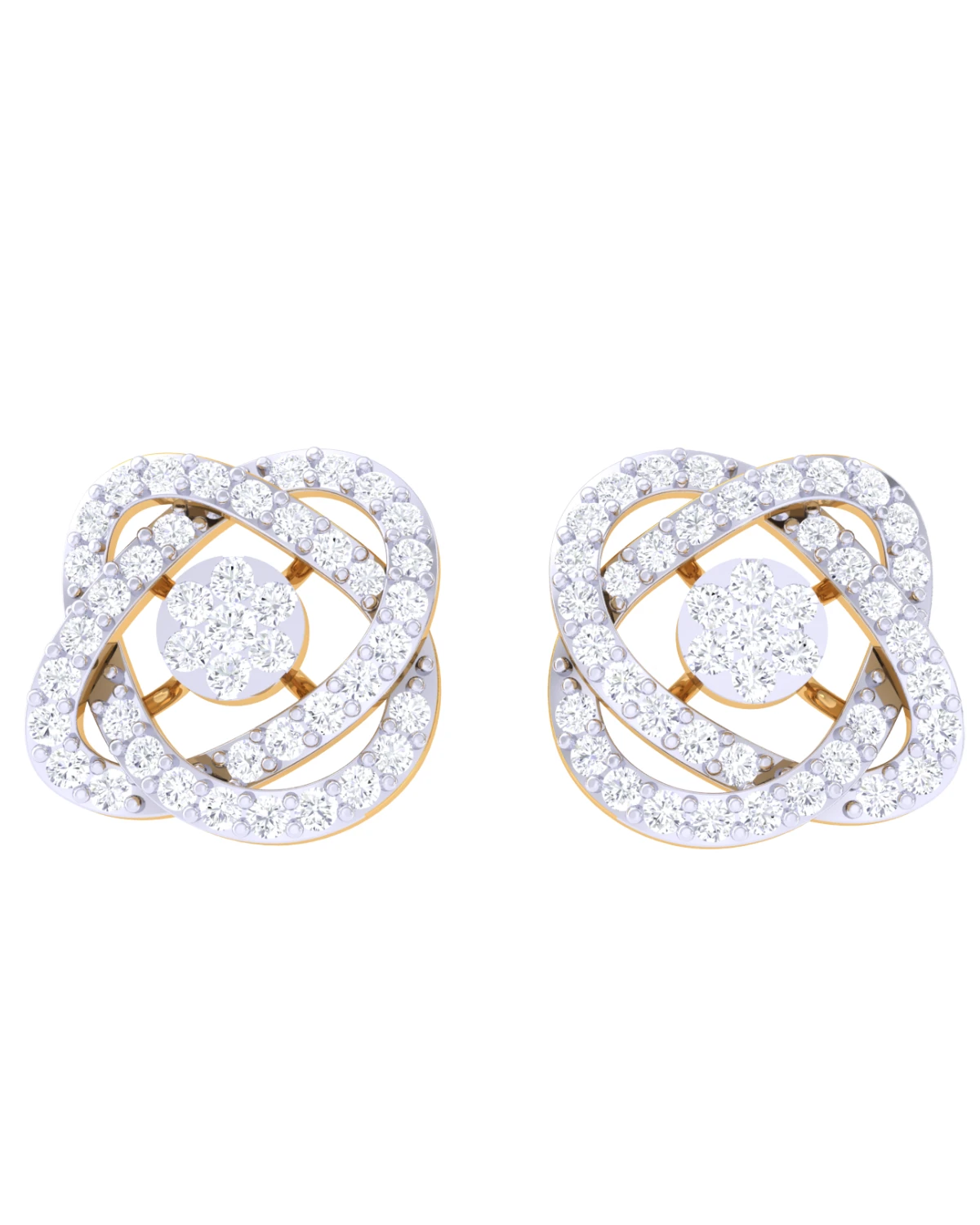 These 18k lab-grown diamond earrings feature a compact, knot-like design with a blend of yellow gold. Each earring has a central round cluster of small, round-cut lab-grown diamonds, surrounded by four overlapping, curved bands that form a clover or knot shape.