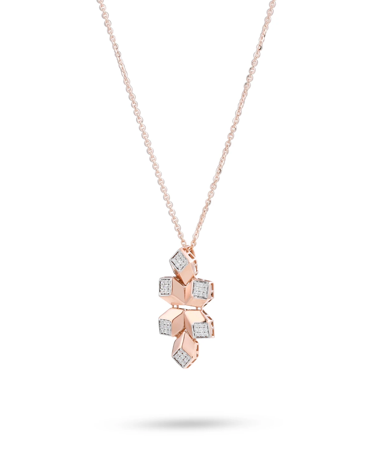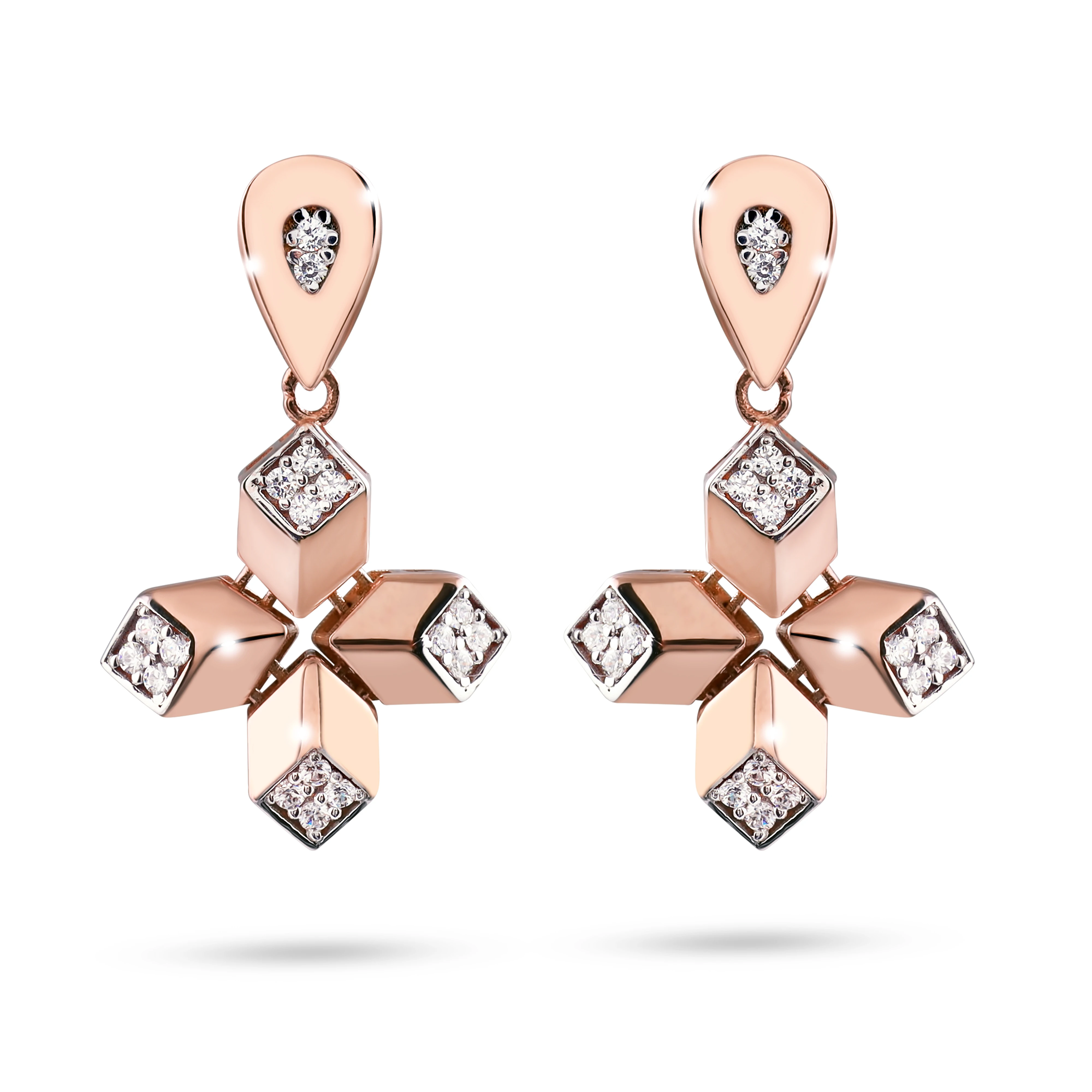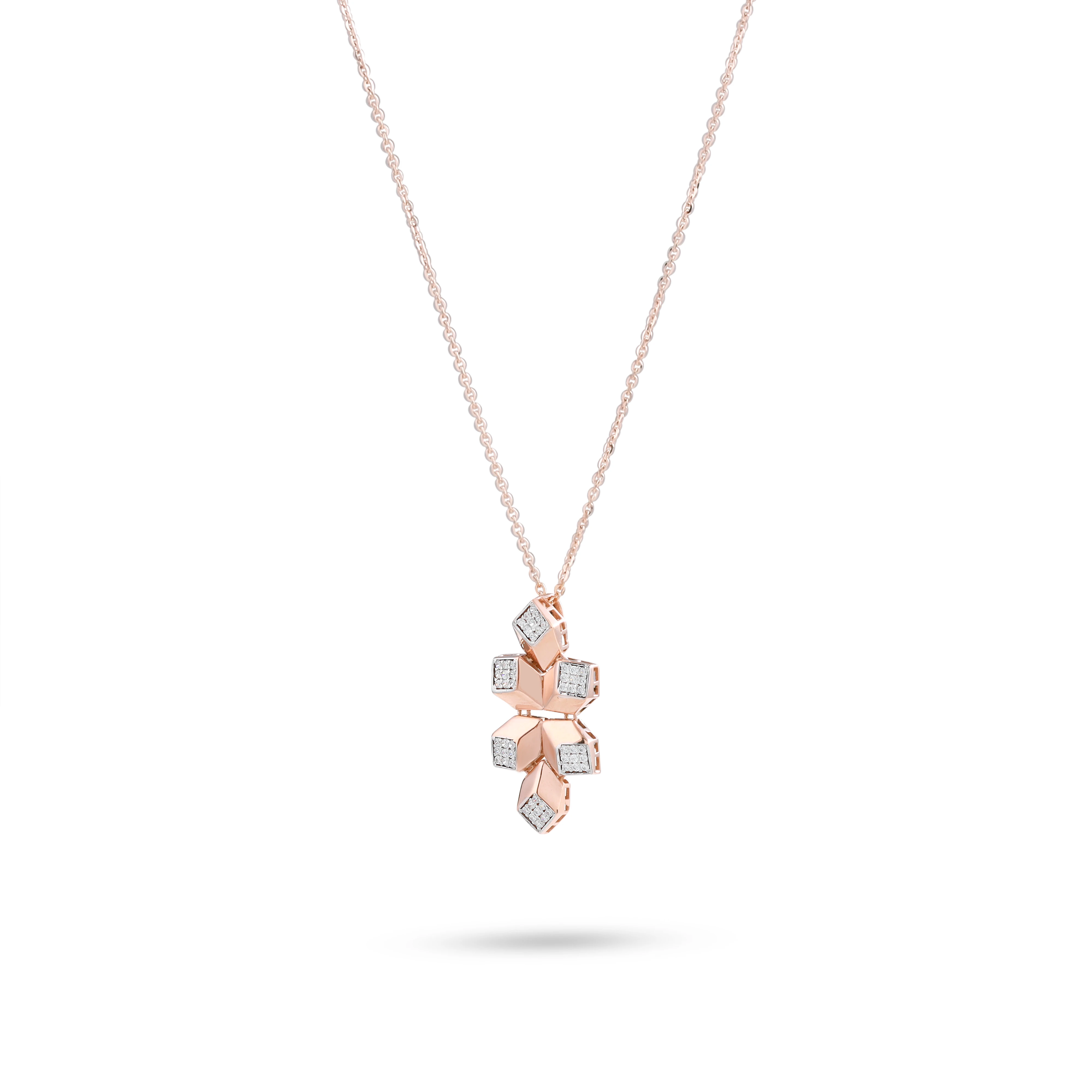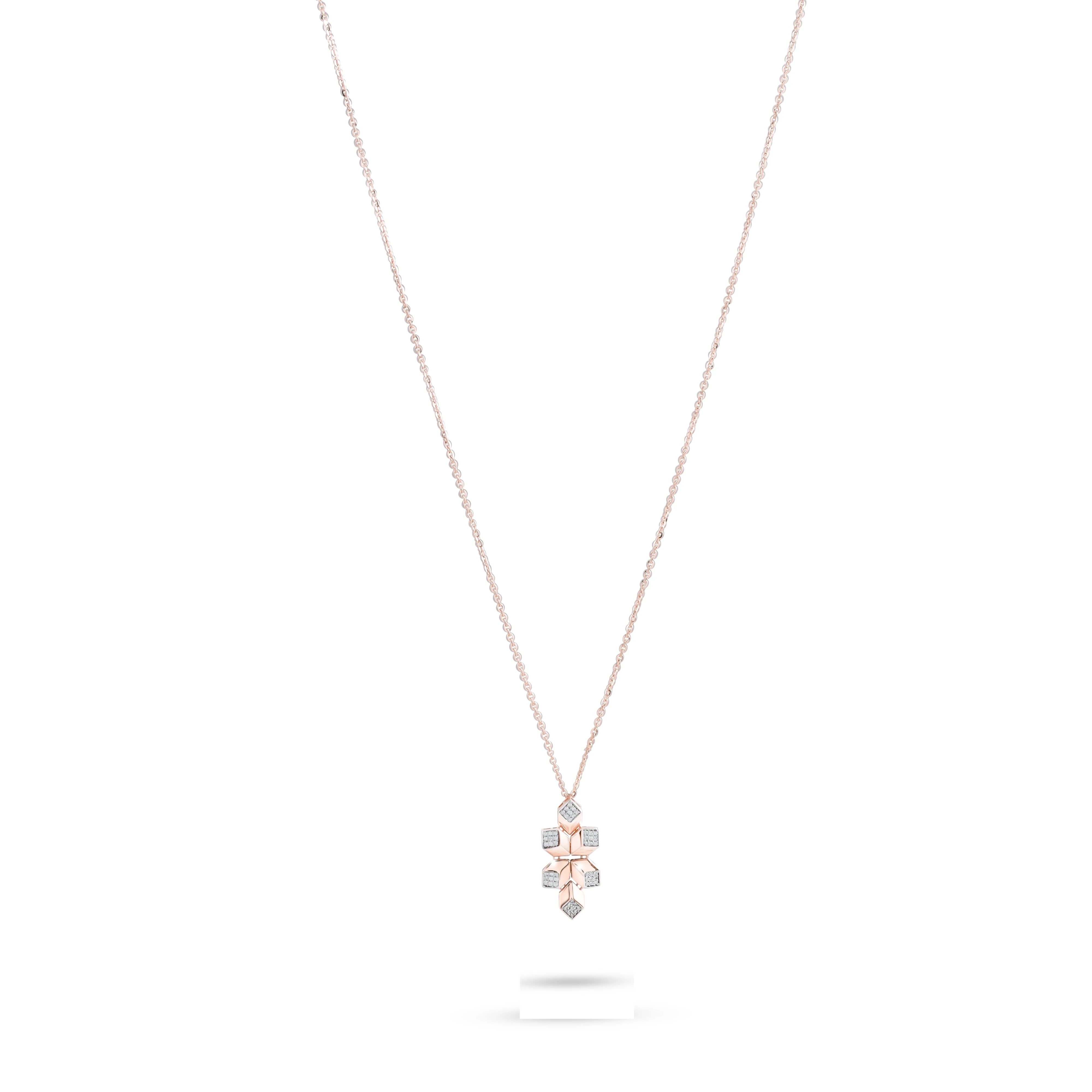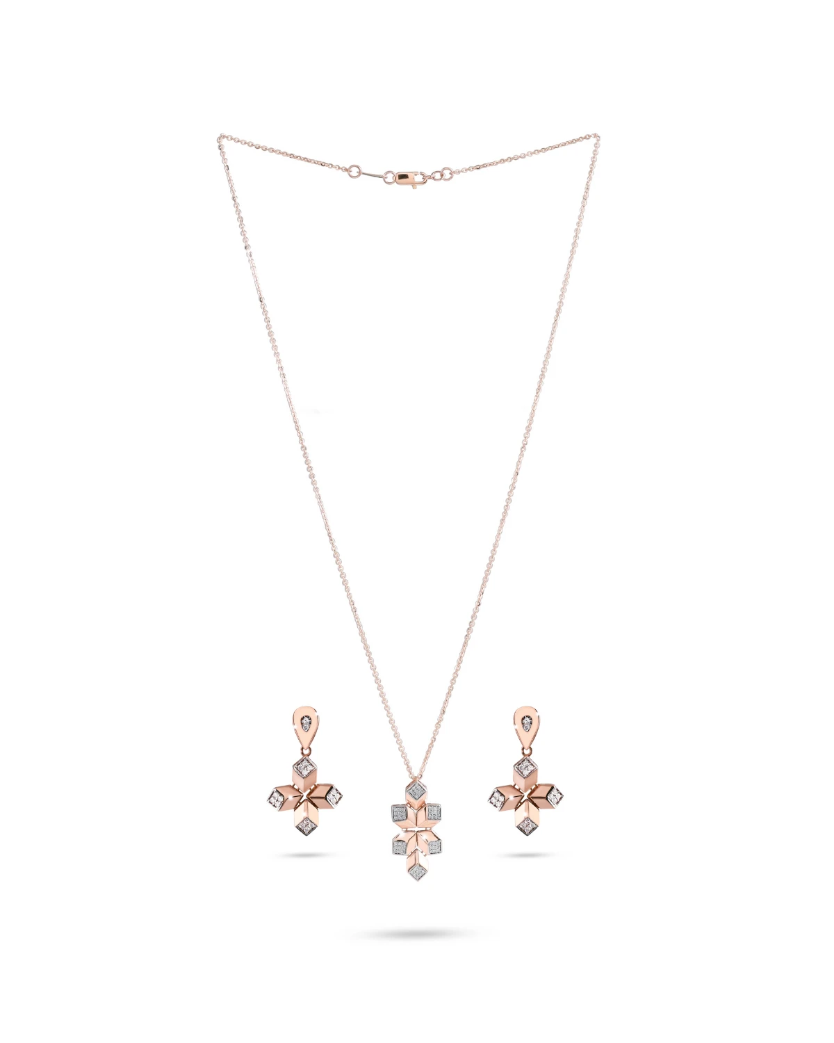 A contemporary rose gold jewelry set comprising a necklace and matching earrings, inspired by geometric floral motifs. The pendant and earrings share a distinctive star-like or floral shape, formed by angular petals with polished rose gold surfaces and diamond-shaped white stone accents at each tip.