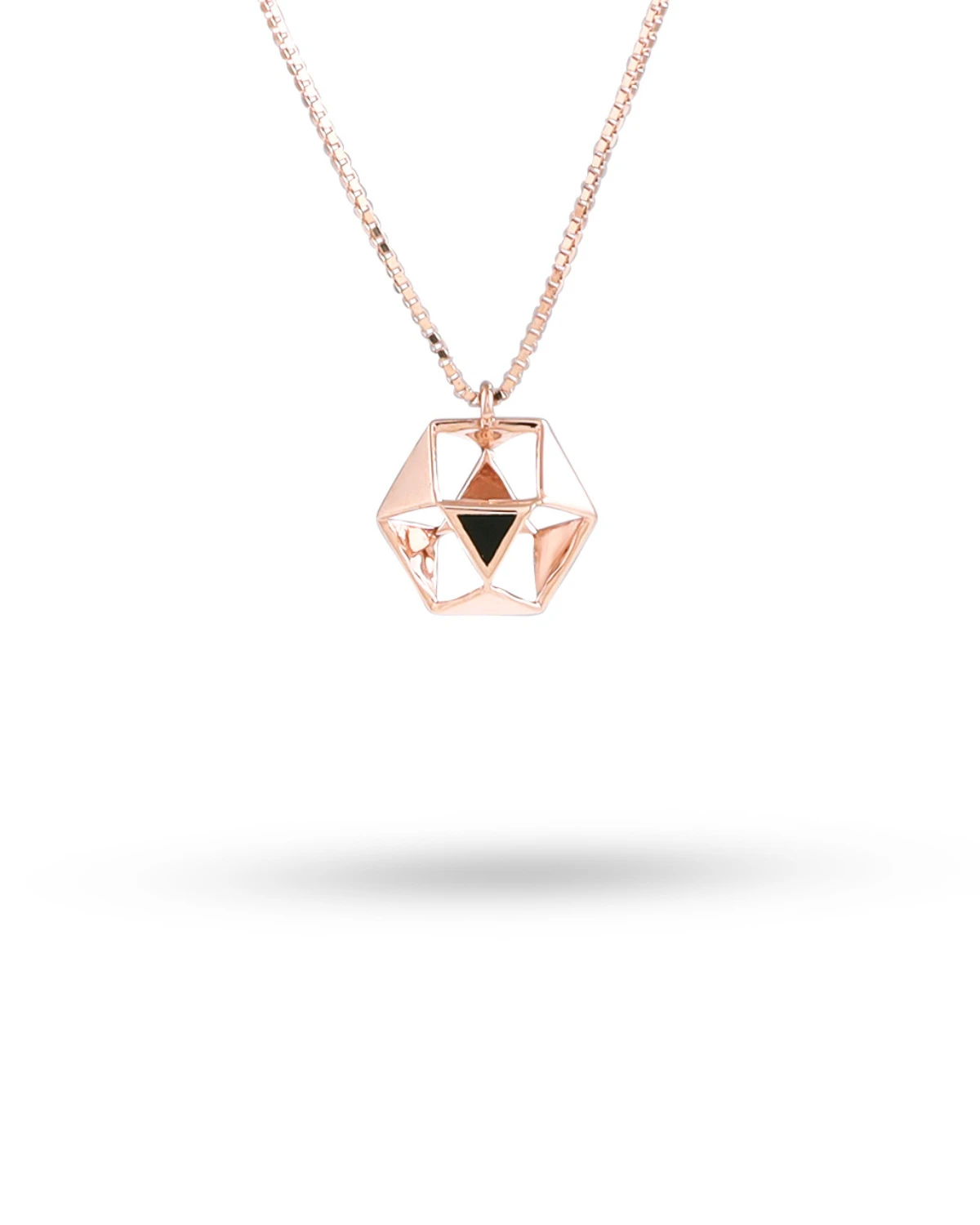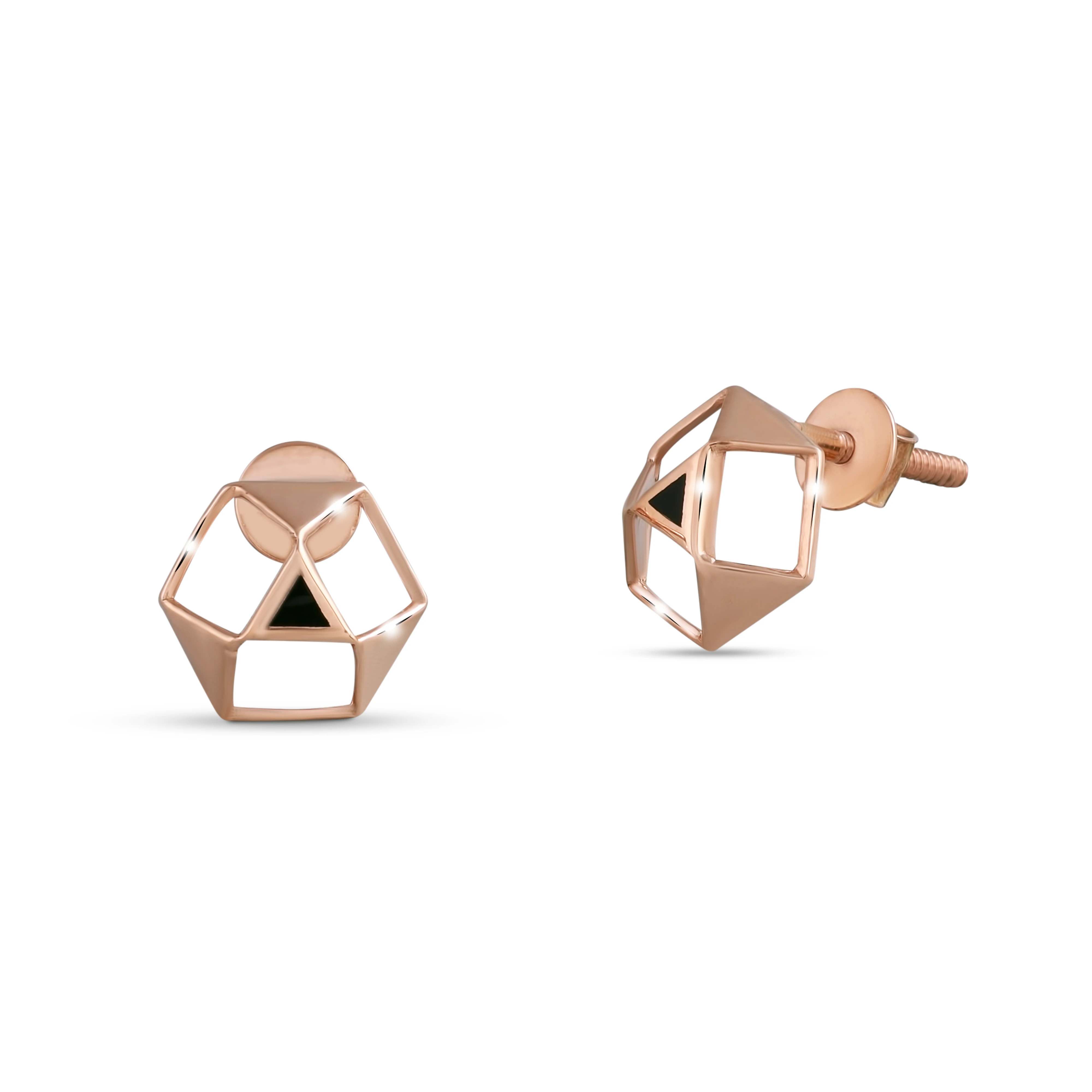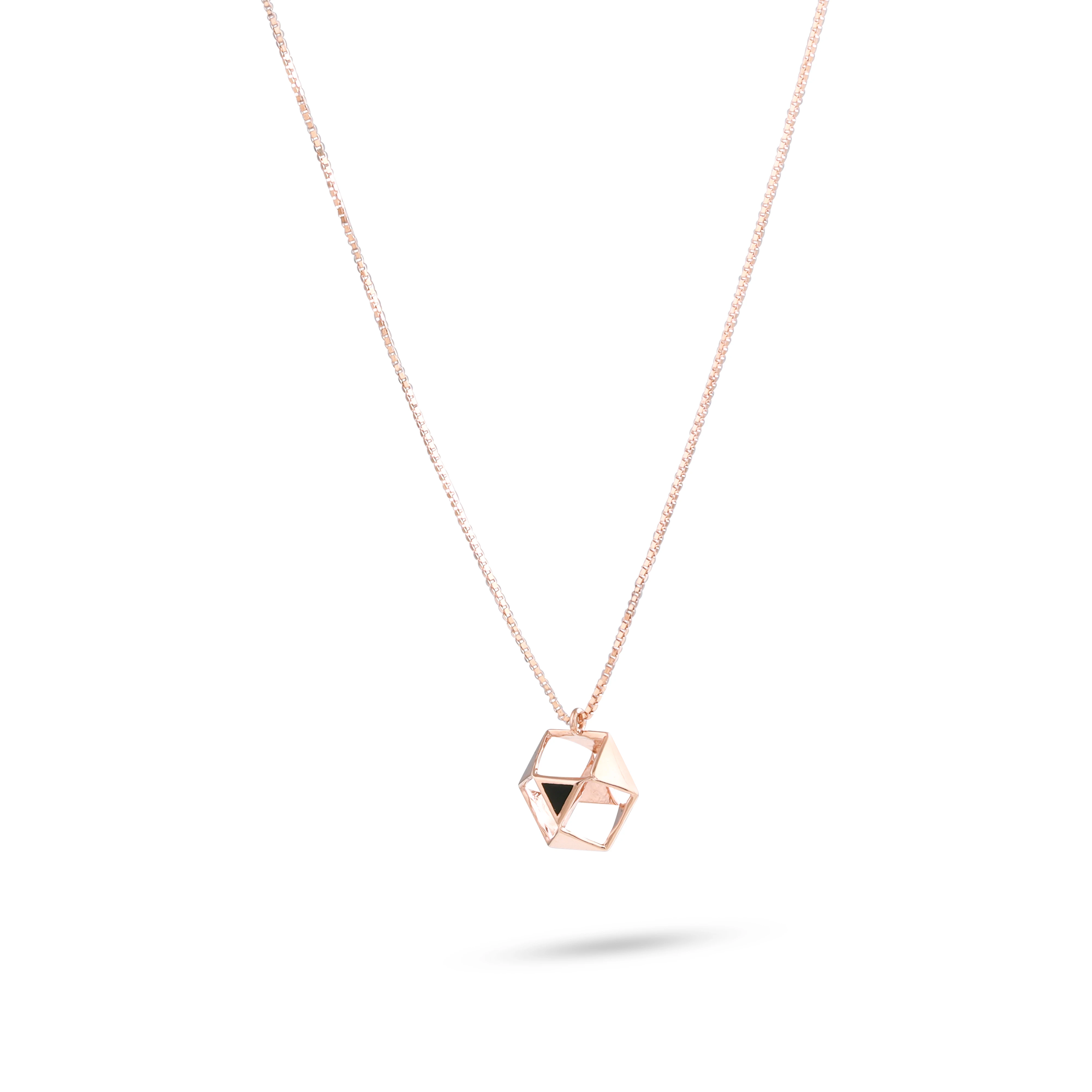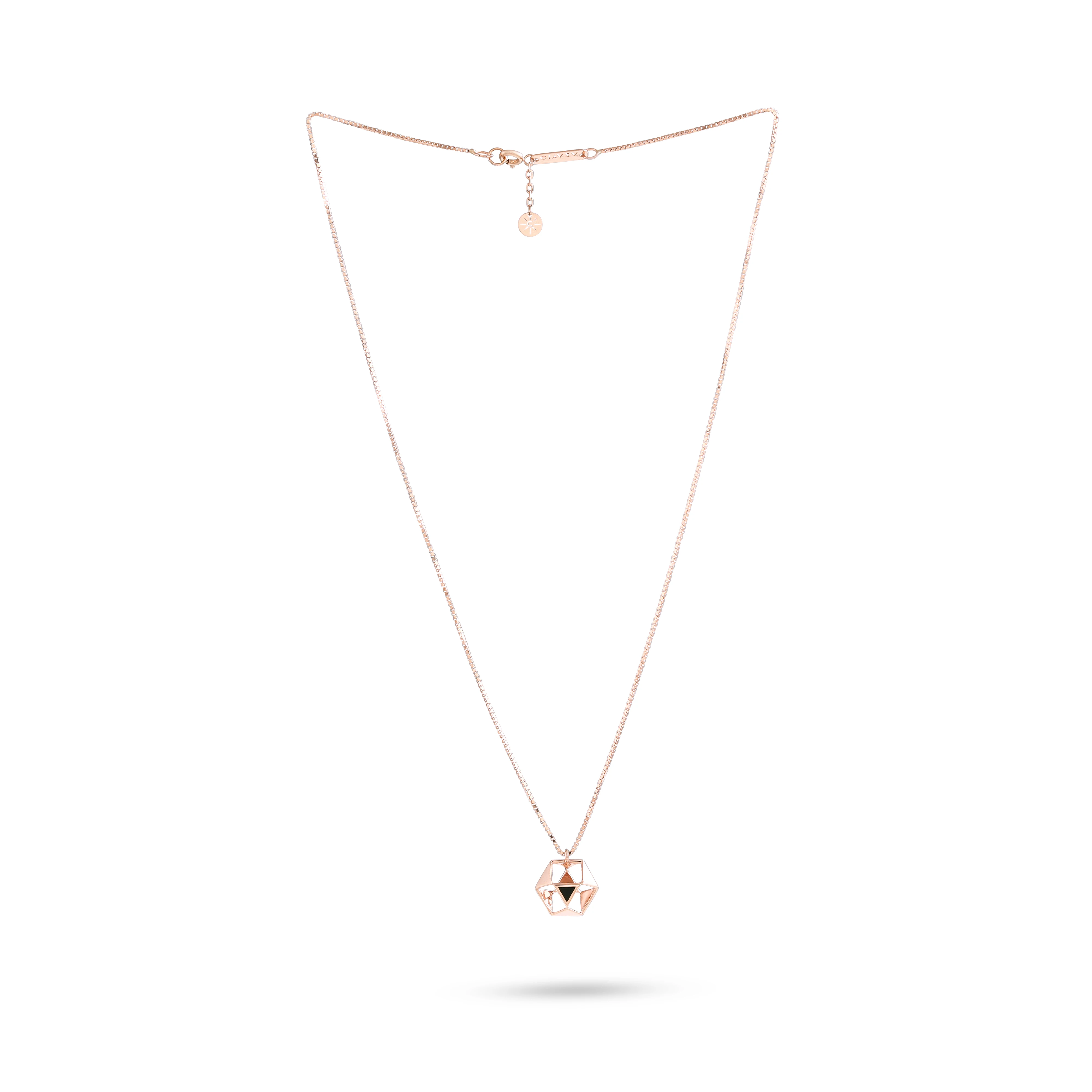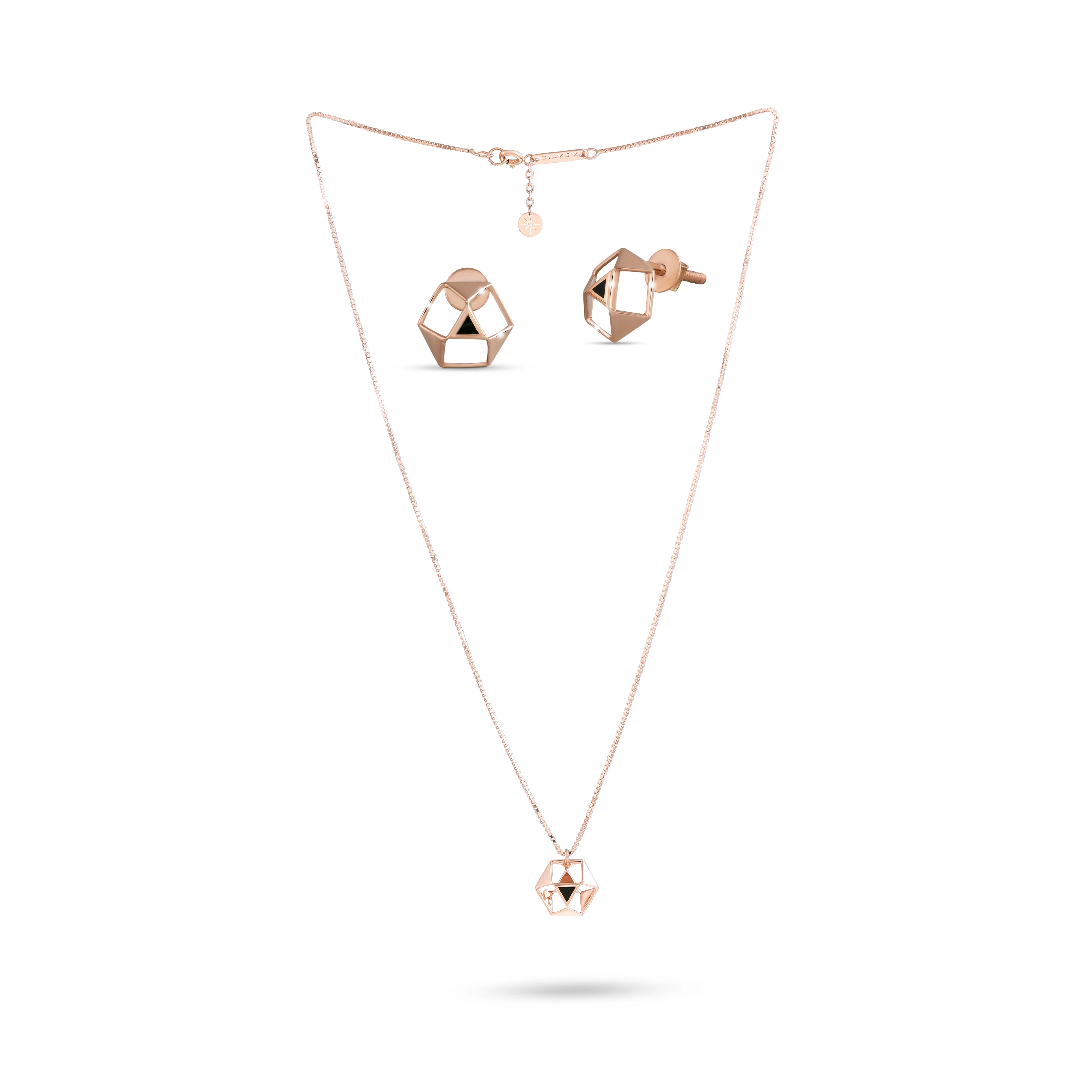 An elegant jewelry set consisting of a necklace and a pair of stud earrings. The pieces are crafted in a rose gold finish, featuring a distinctive geometric design. The necklace is suspended on a fine chain with an adjustable clasp and a small circular charm at the end.