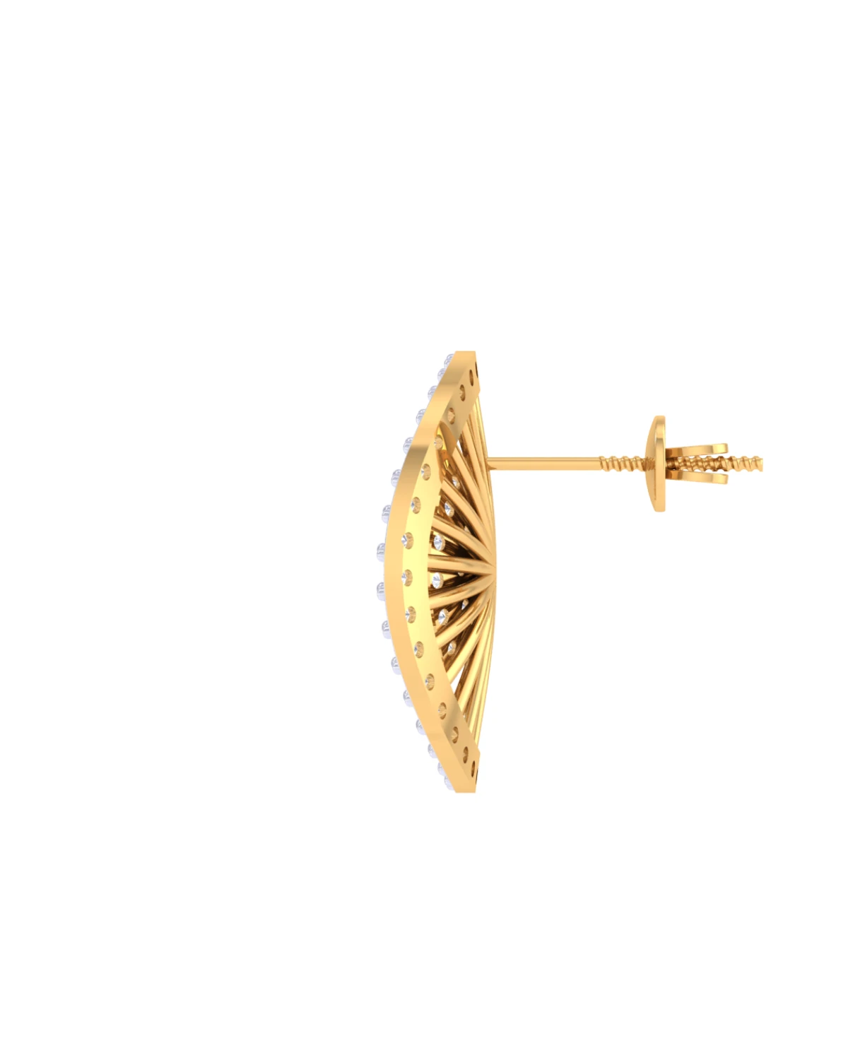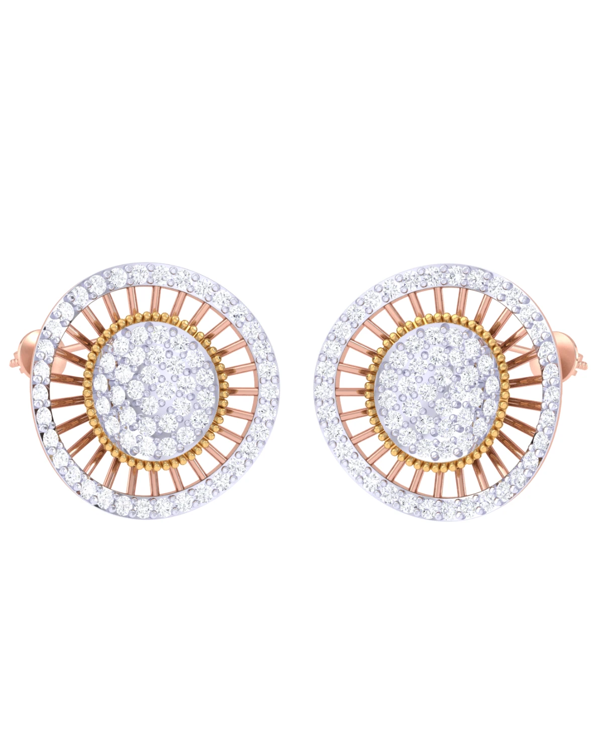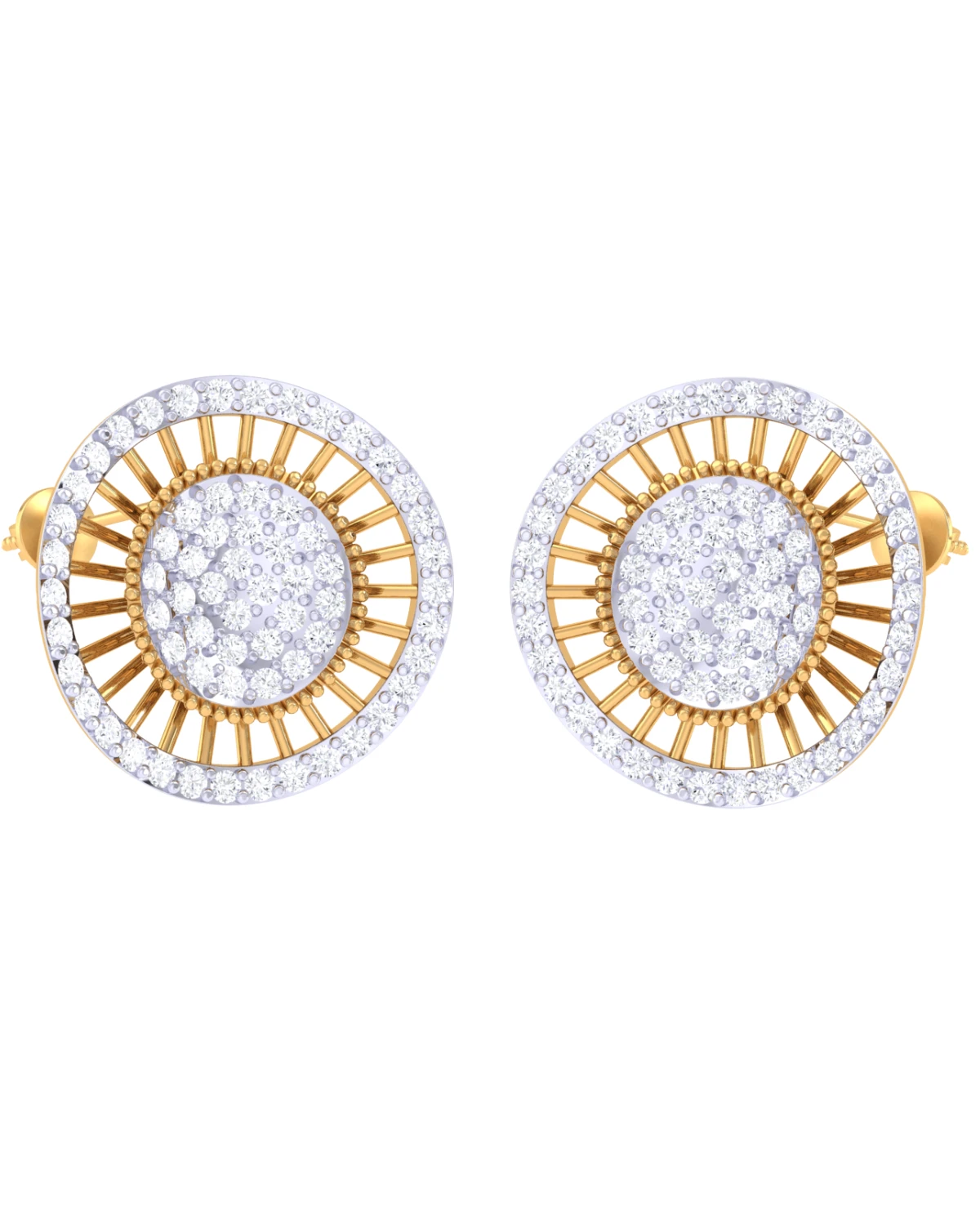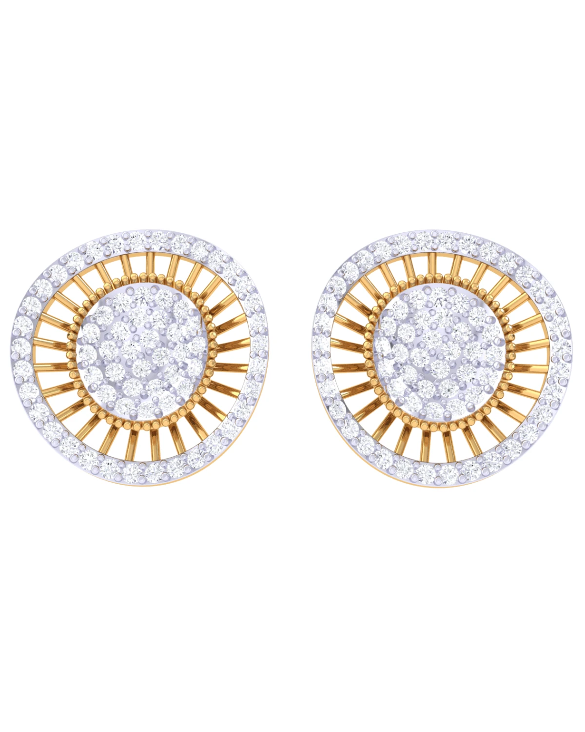 These 18k lab-grown diamond earrings are stud-style with a circular design. Each earring features a central cluster of small, round lab-grown diamonds set in a pave arrangement, creating a sparkling focal point.