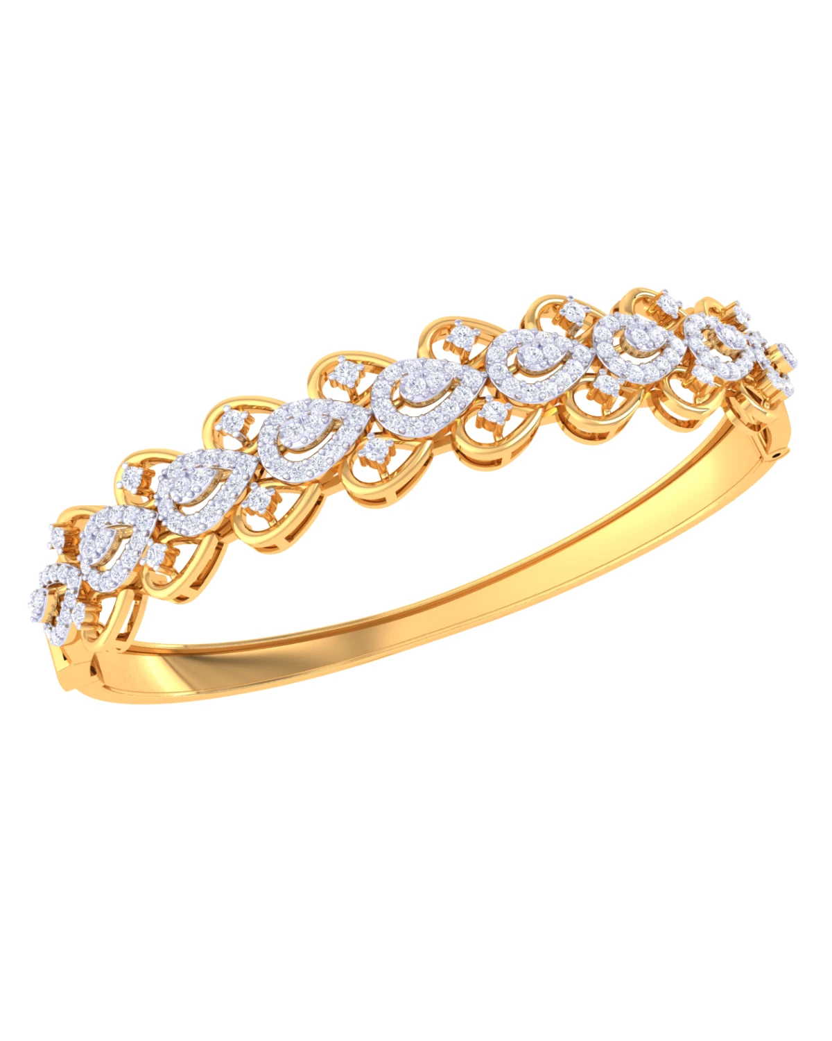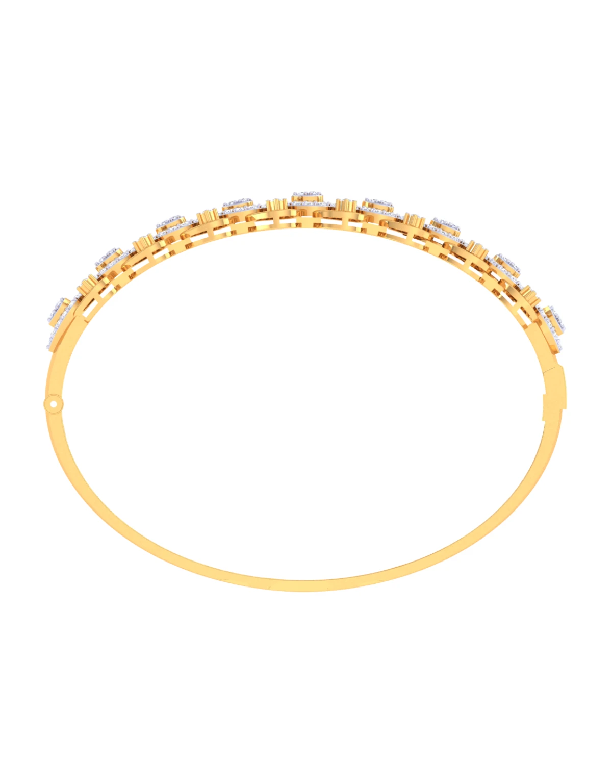 A bold cuff bracelet with diamond-encrusted gold lines exudes