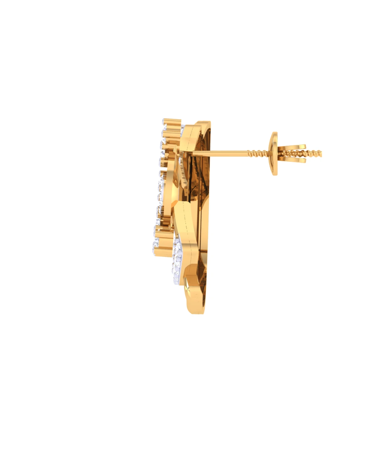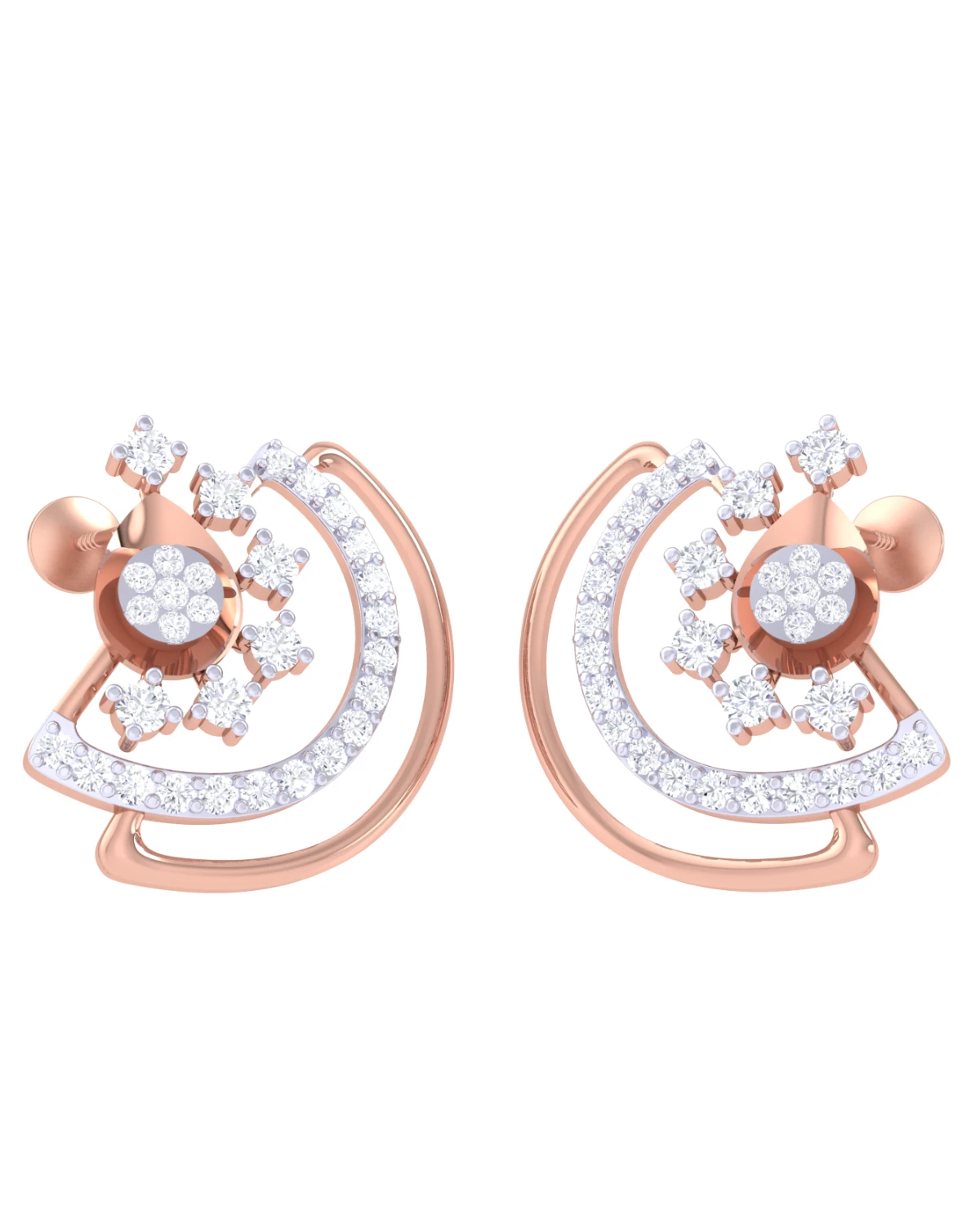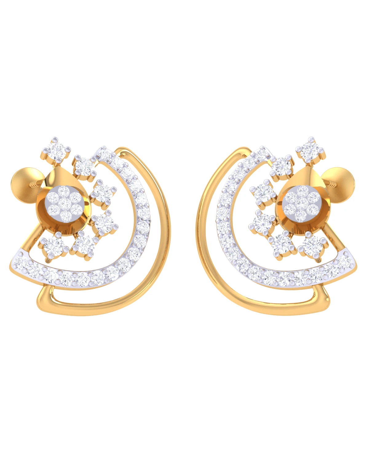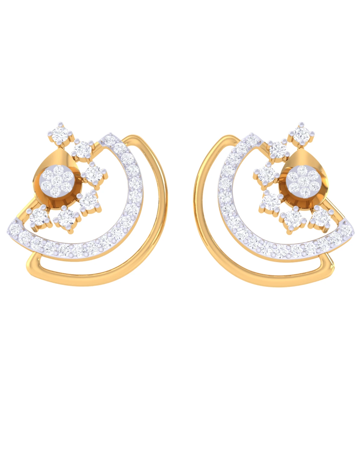 These 18k lab-grown diamond earrings are stud-style with a crescent-shaped design. Each earring features a semi-circle frame in 18k gold, encrusted with small, round lab-grown diamonds along its outer edge, creating a sparkling outline.