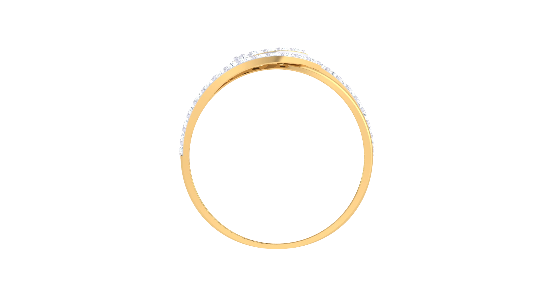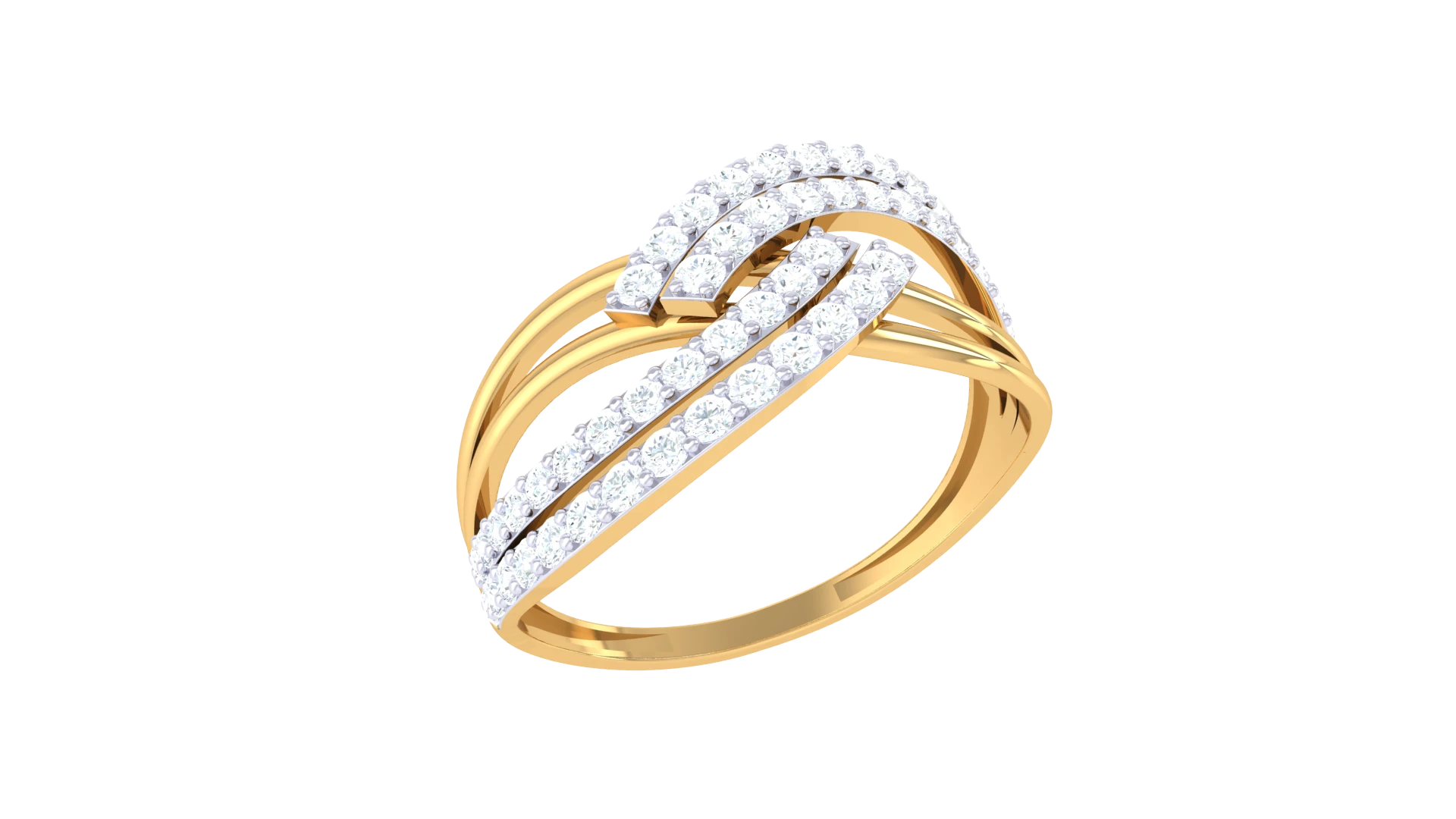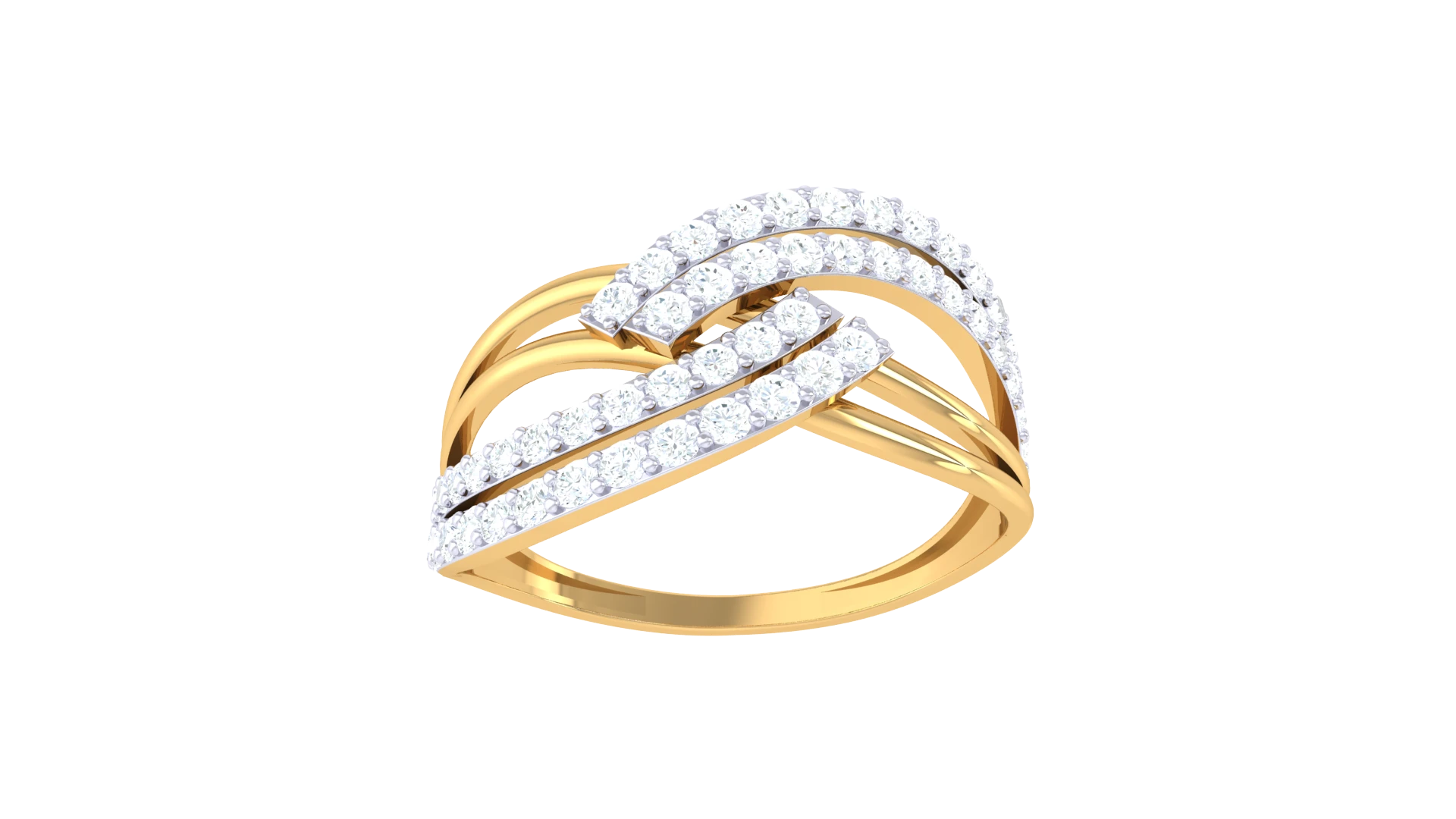 A gold ring featuring overlapping designs with diamond