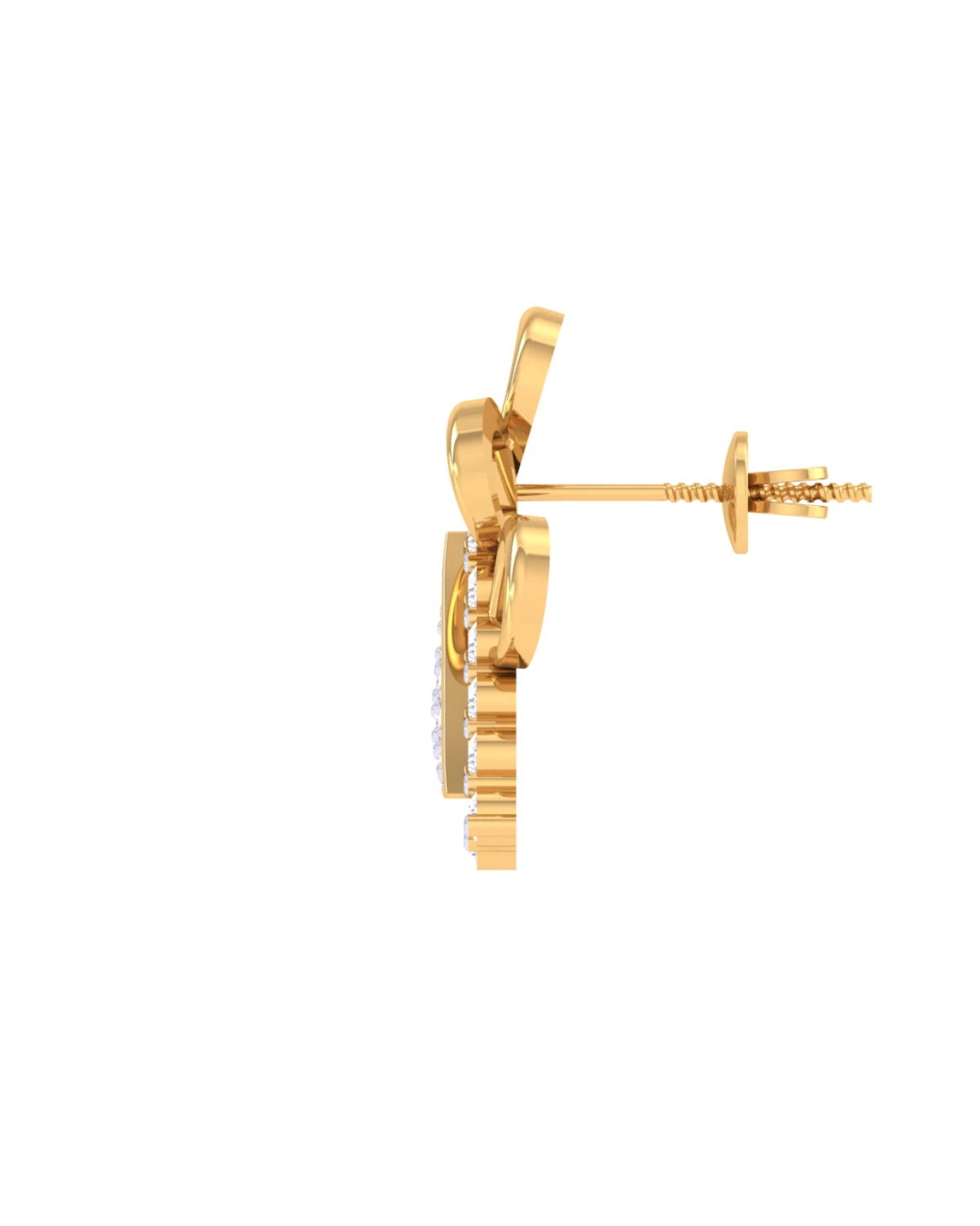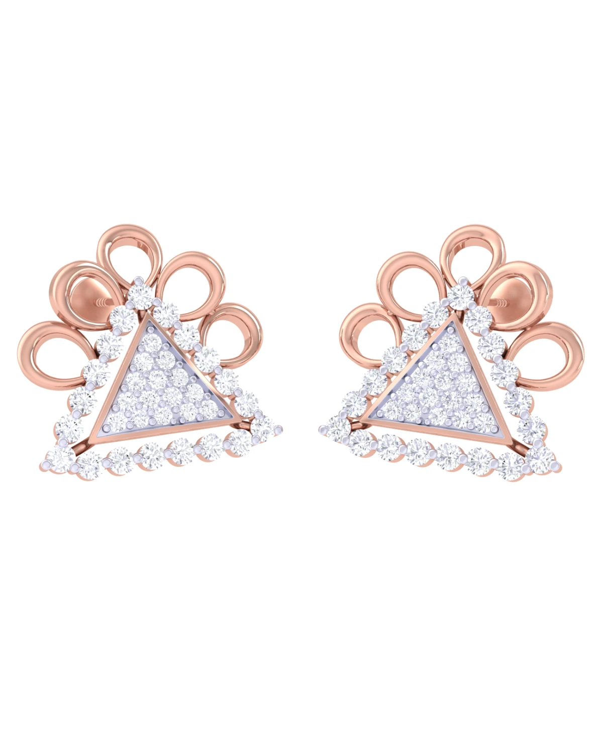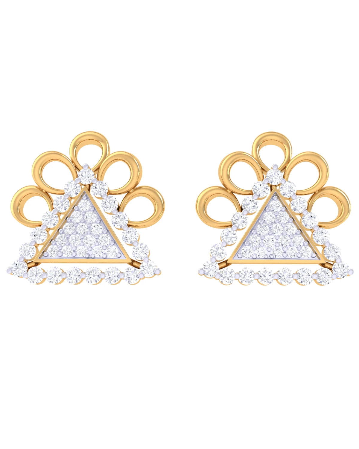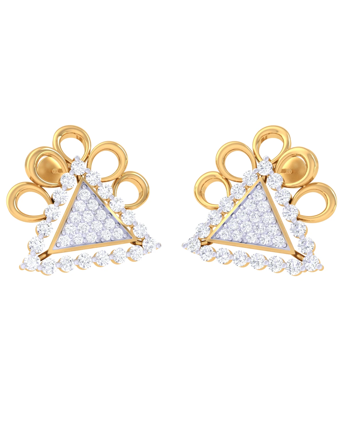 These 18k lab-grown diamond earrings are stud-style with a triangular design. Each earring features a central triangle filled with small, round lab-grown diamonds in a pave setting, creating a dazzling effect.