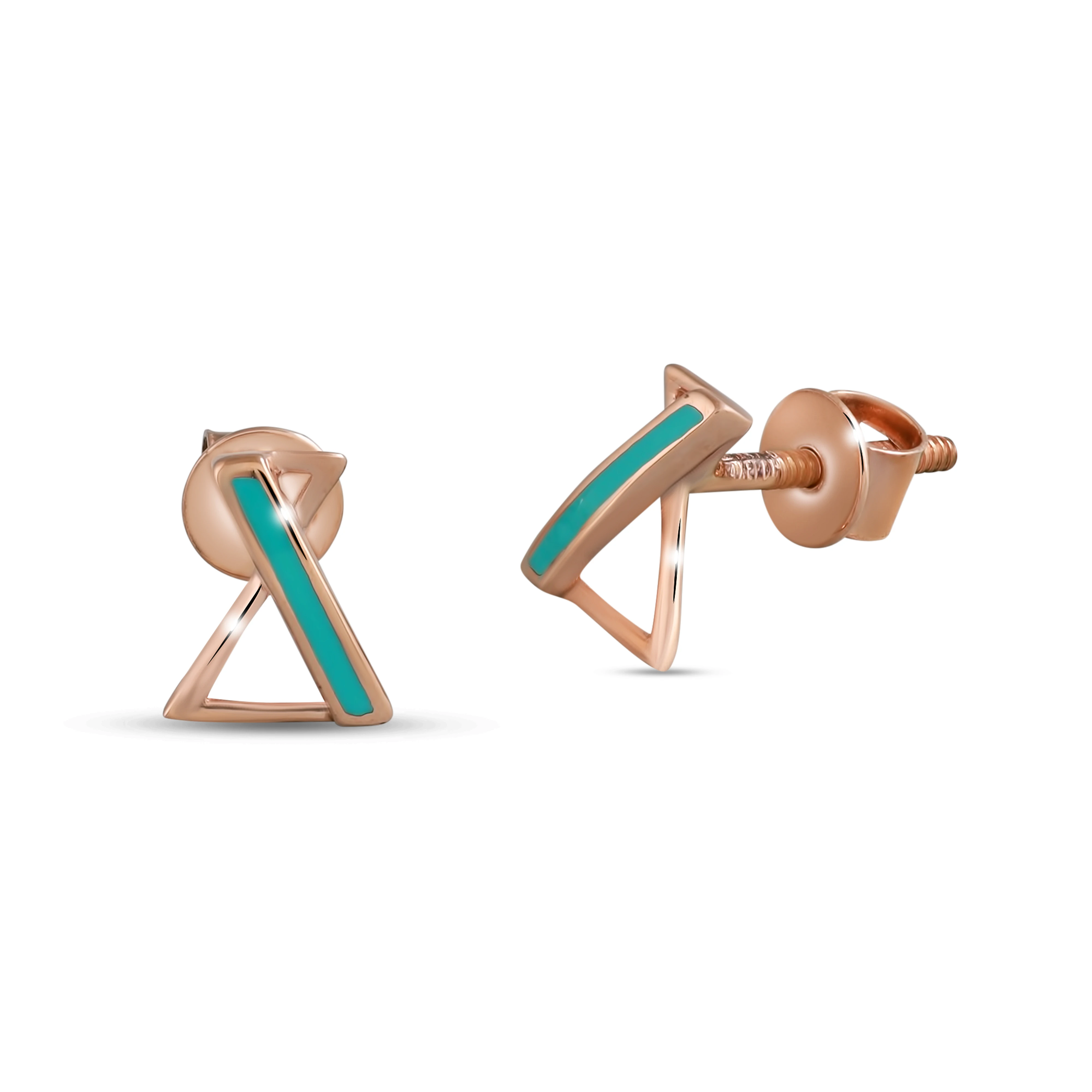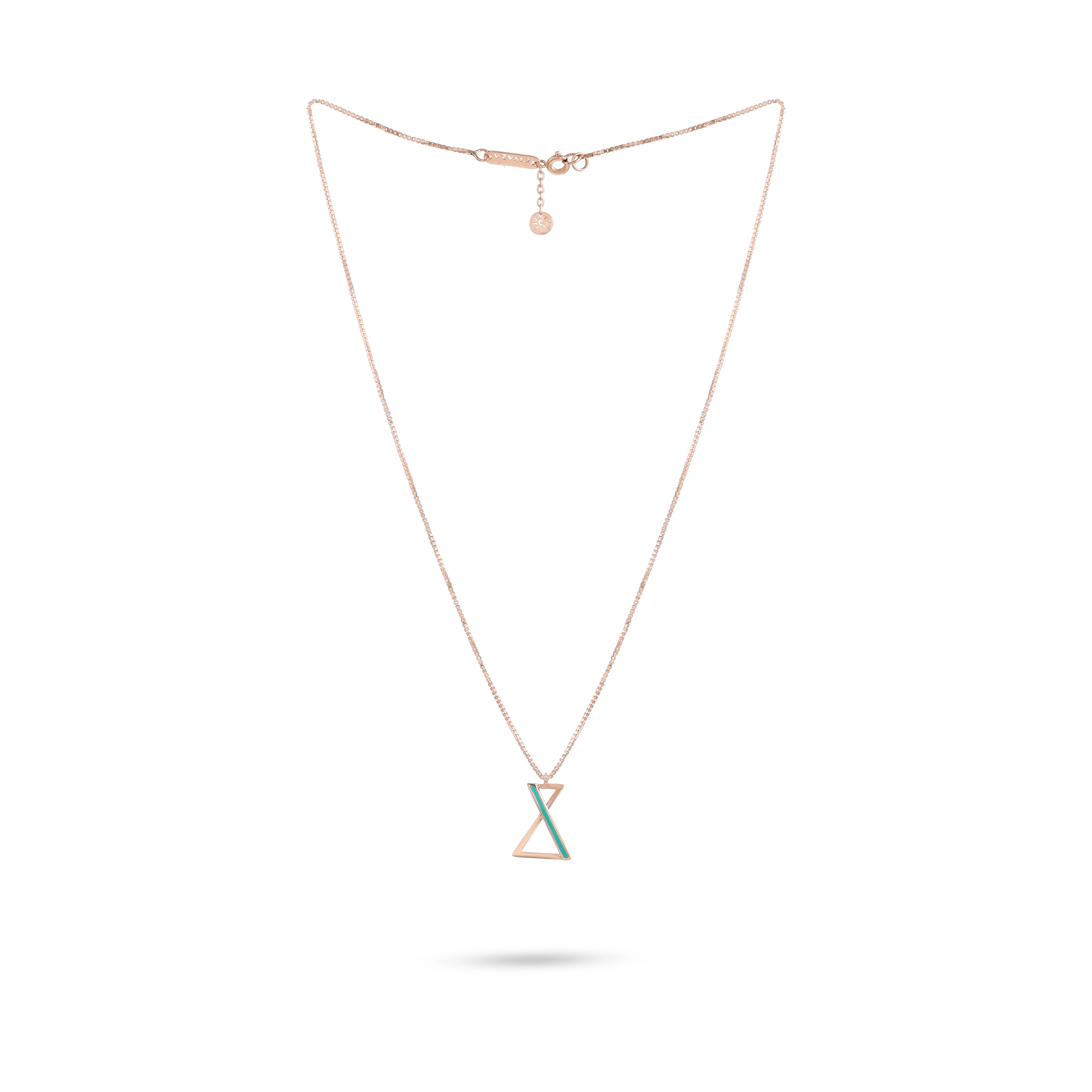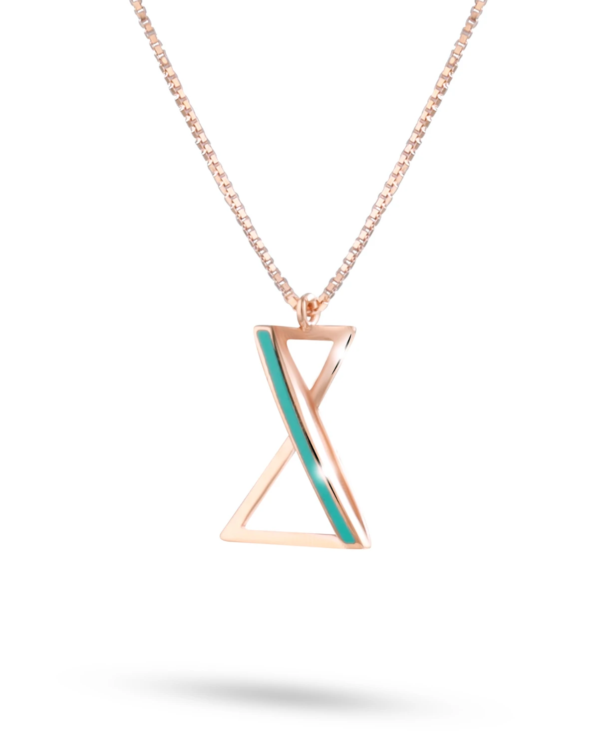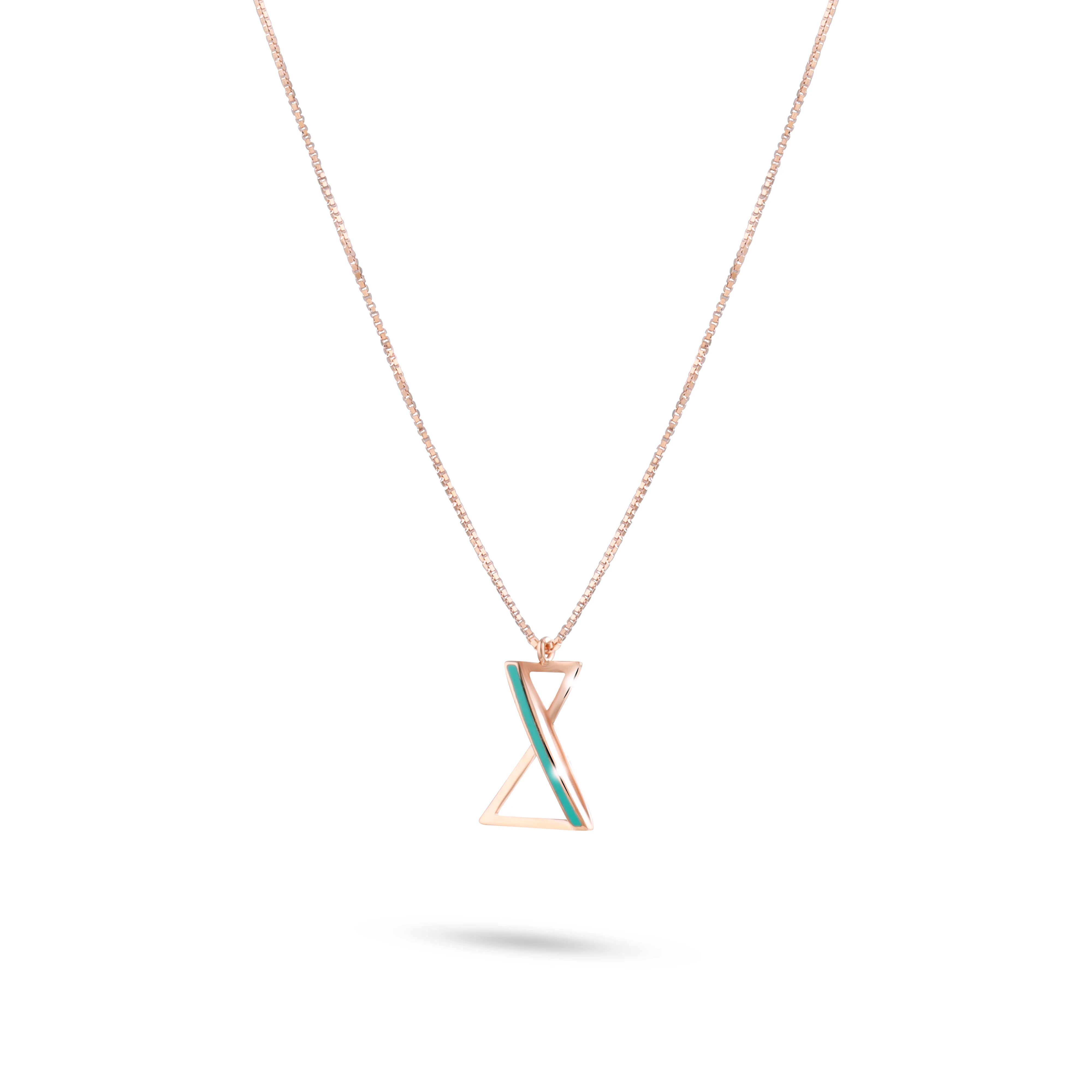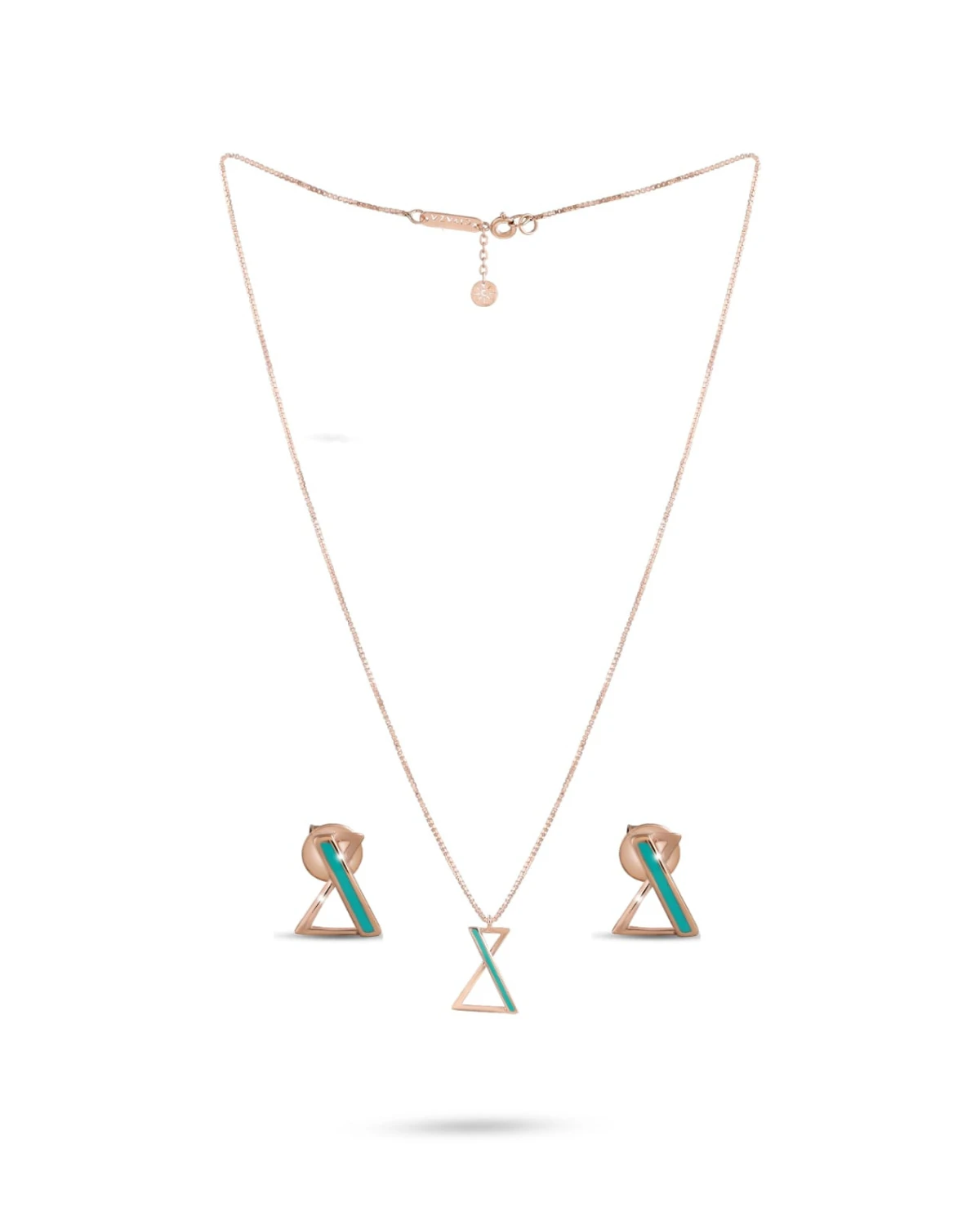 A sleek and modern jewelry set consisting of a necklace and a pair of stud earrings, designed in a unique hourglass-inspired motif. Crafted in rose gold, each piece incorporates a slim triangular frame intersected by a bold, turquoise-colored enamel stripe that adds a vibrant contrast.
