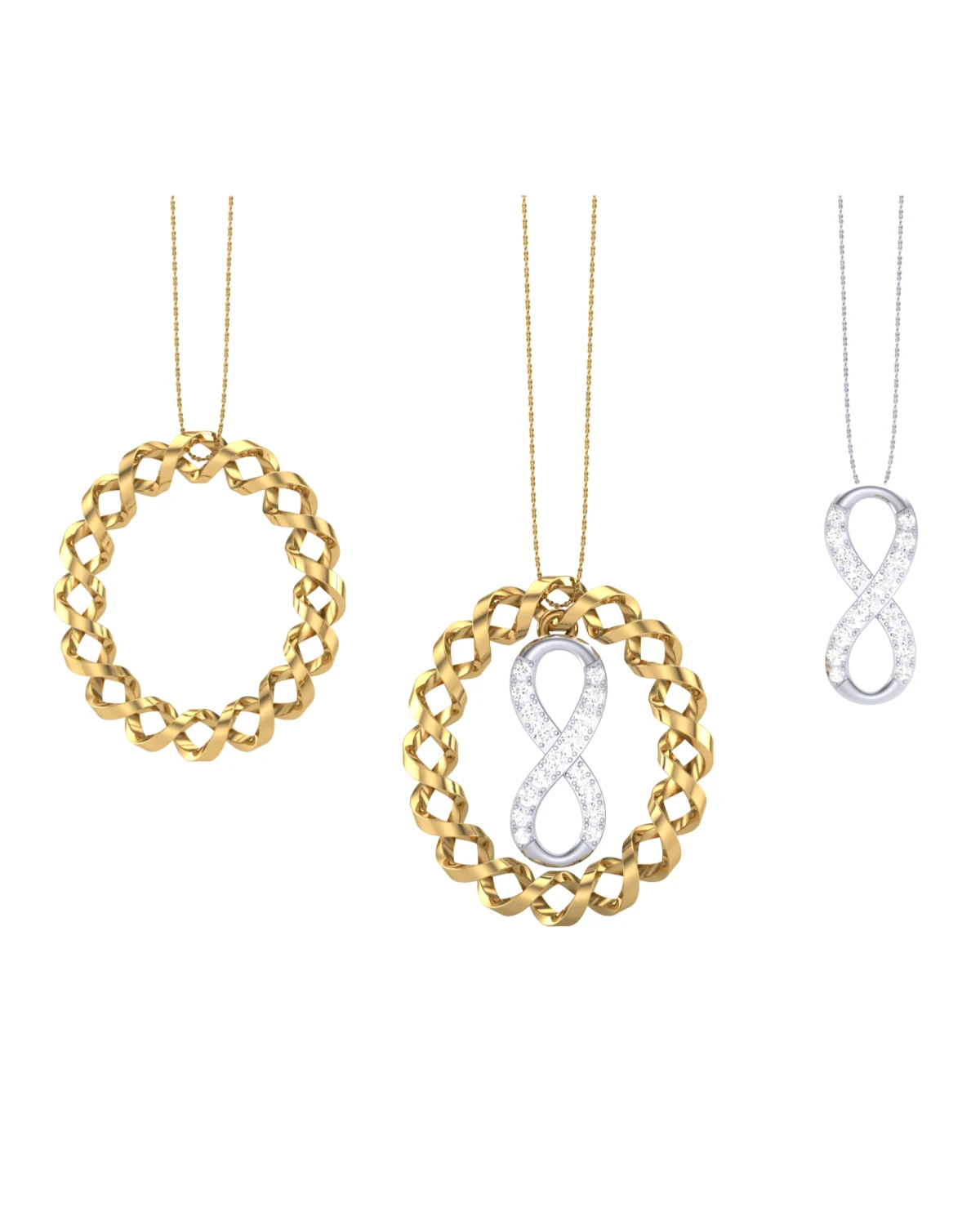 A versatile infinity design that can be worn as a single diamond infinity, a layered infinity with multiple diamonds, or as a combined pendant with a detachable gold accent.( Chain not included in This product )