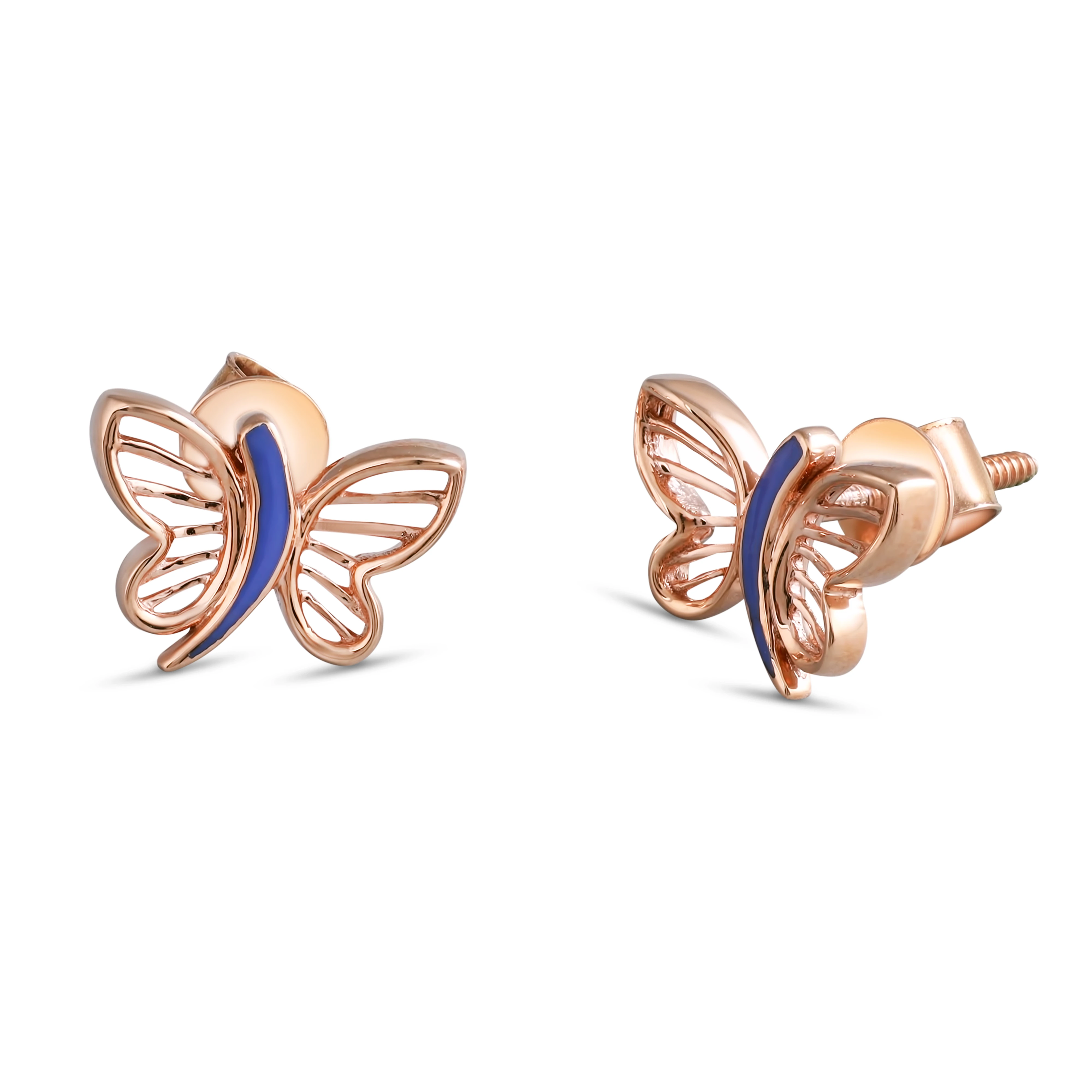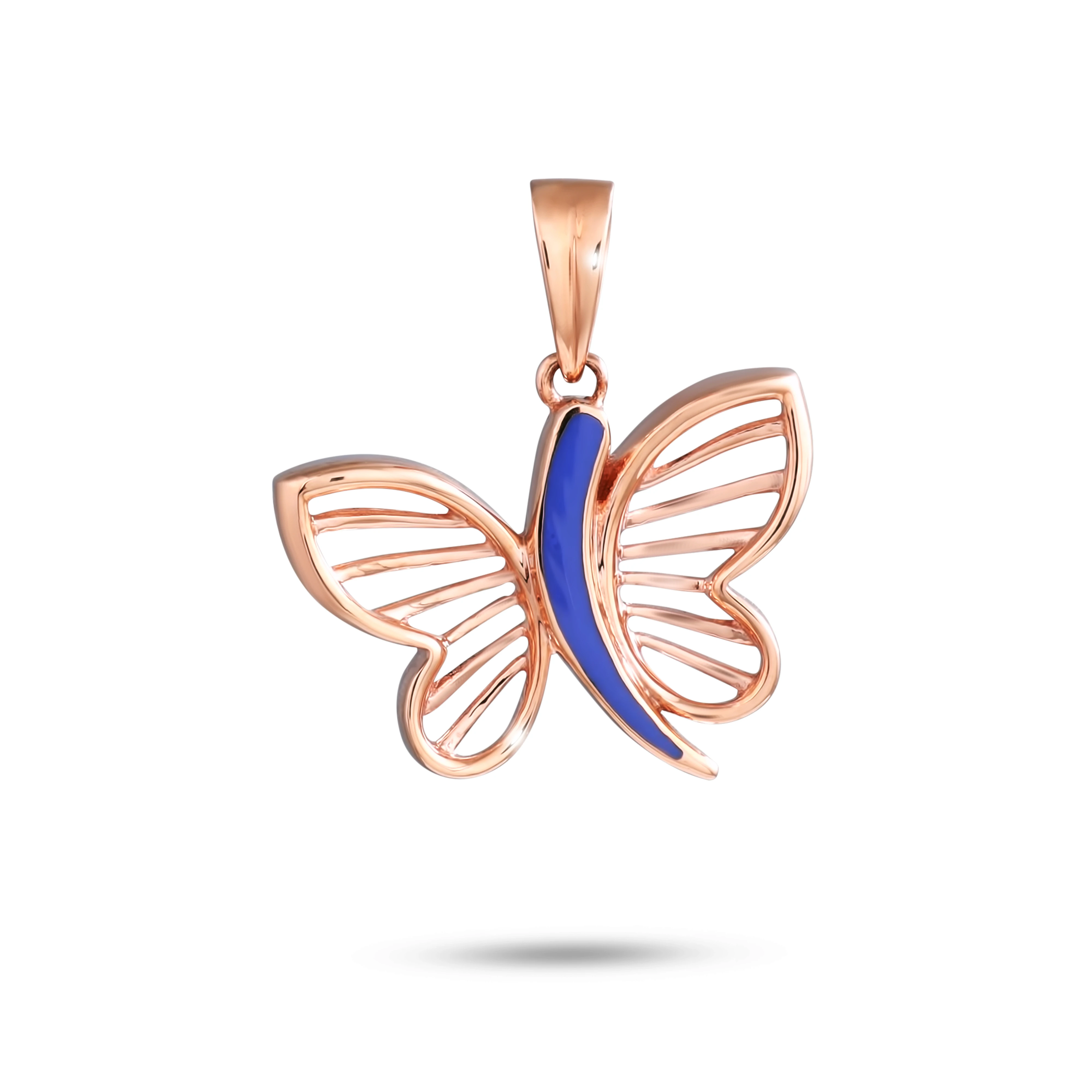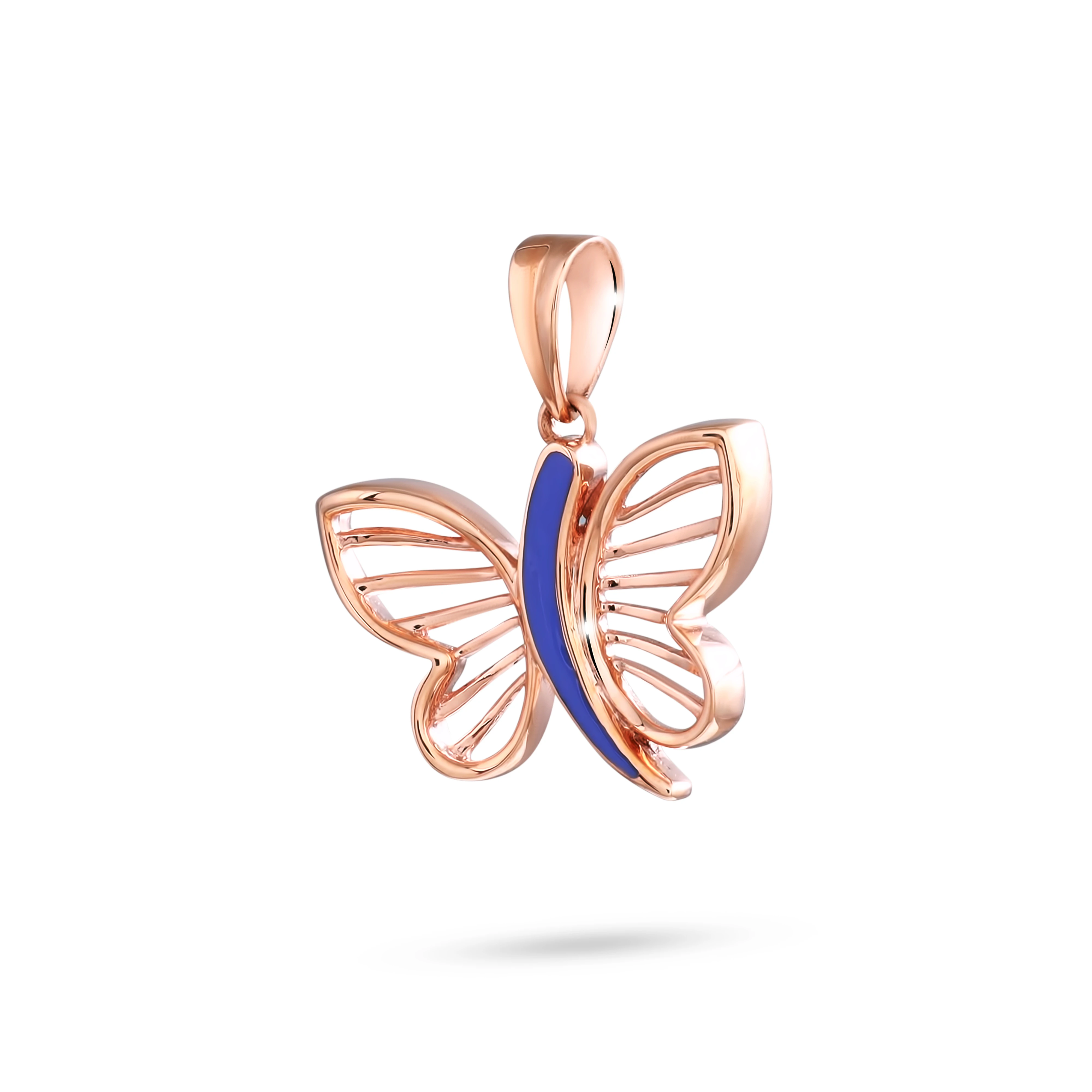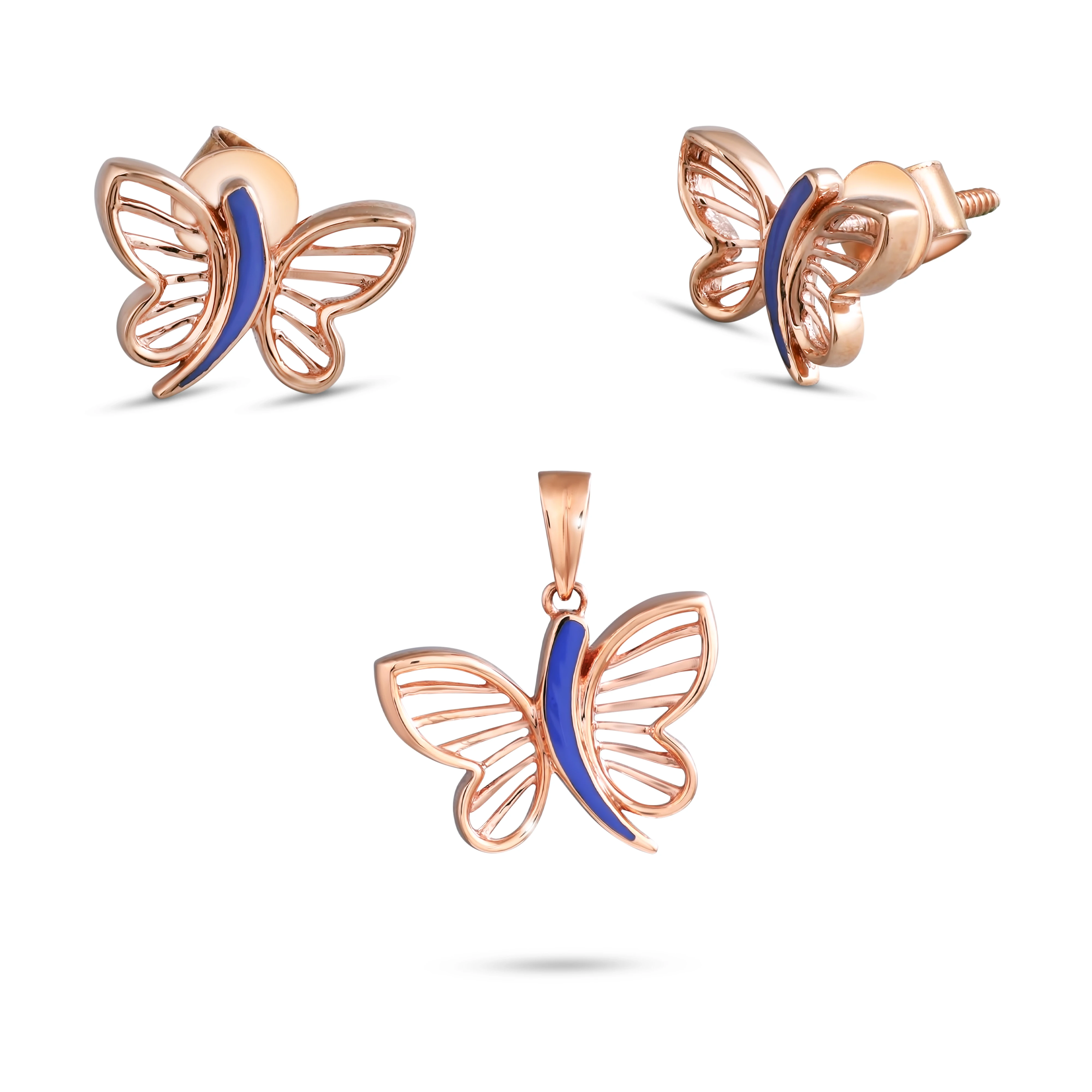 A delicate and enchanting jewelry set consisting of a pendant and matching earrings. The design takes the elegant shape of a butterfly, crafted in lustrous rose gold. Each piece features intricate openwork wings that convey lightness and grace.