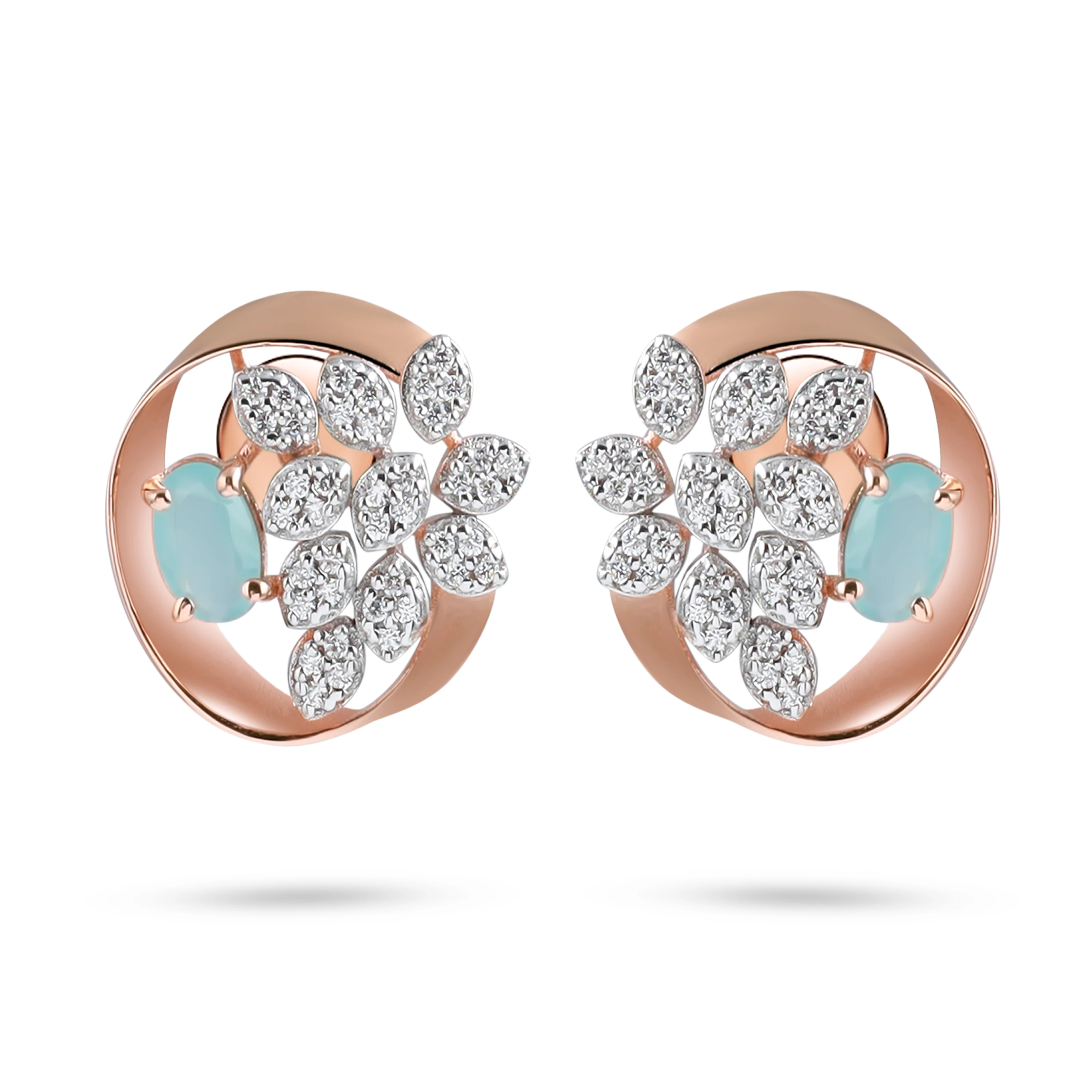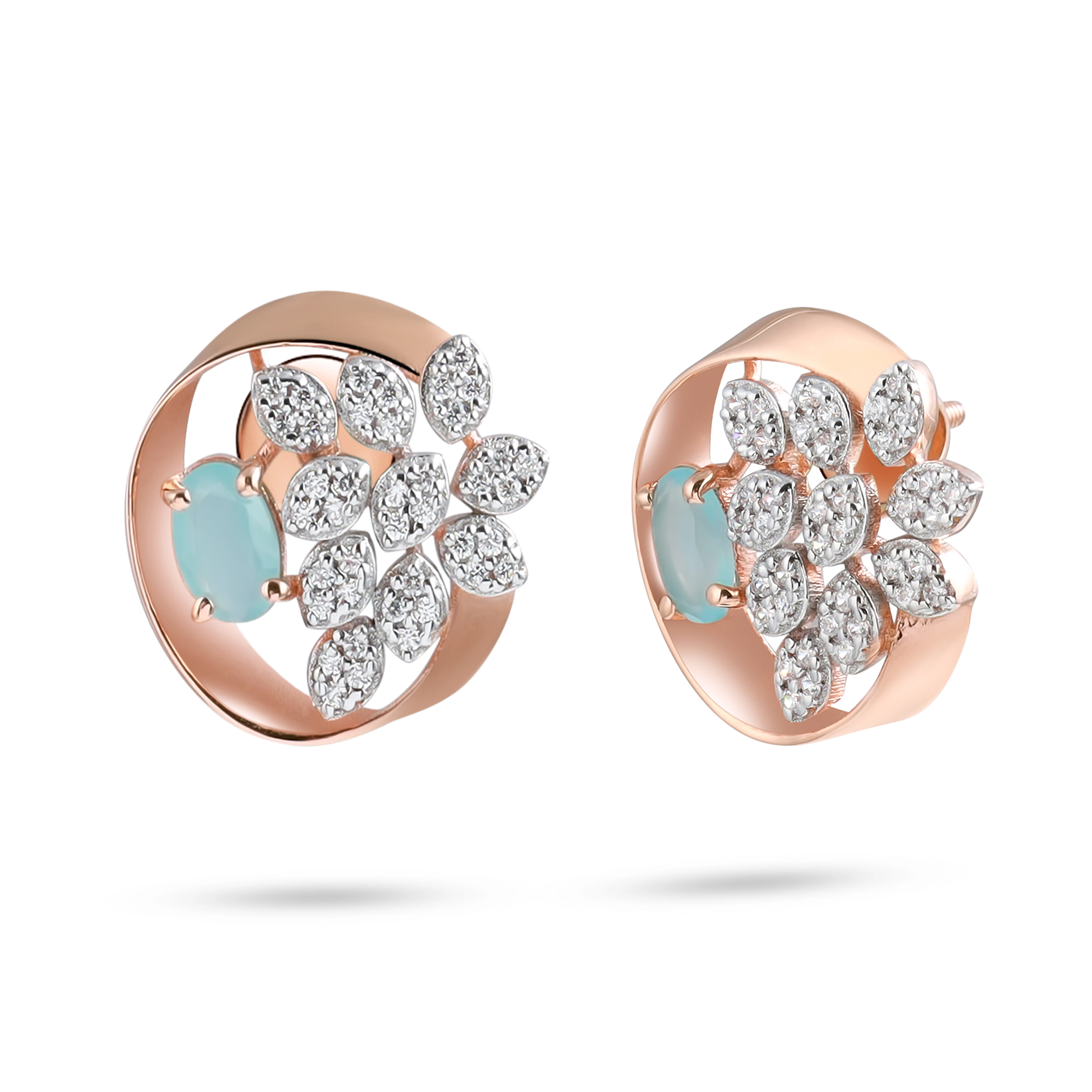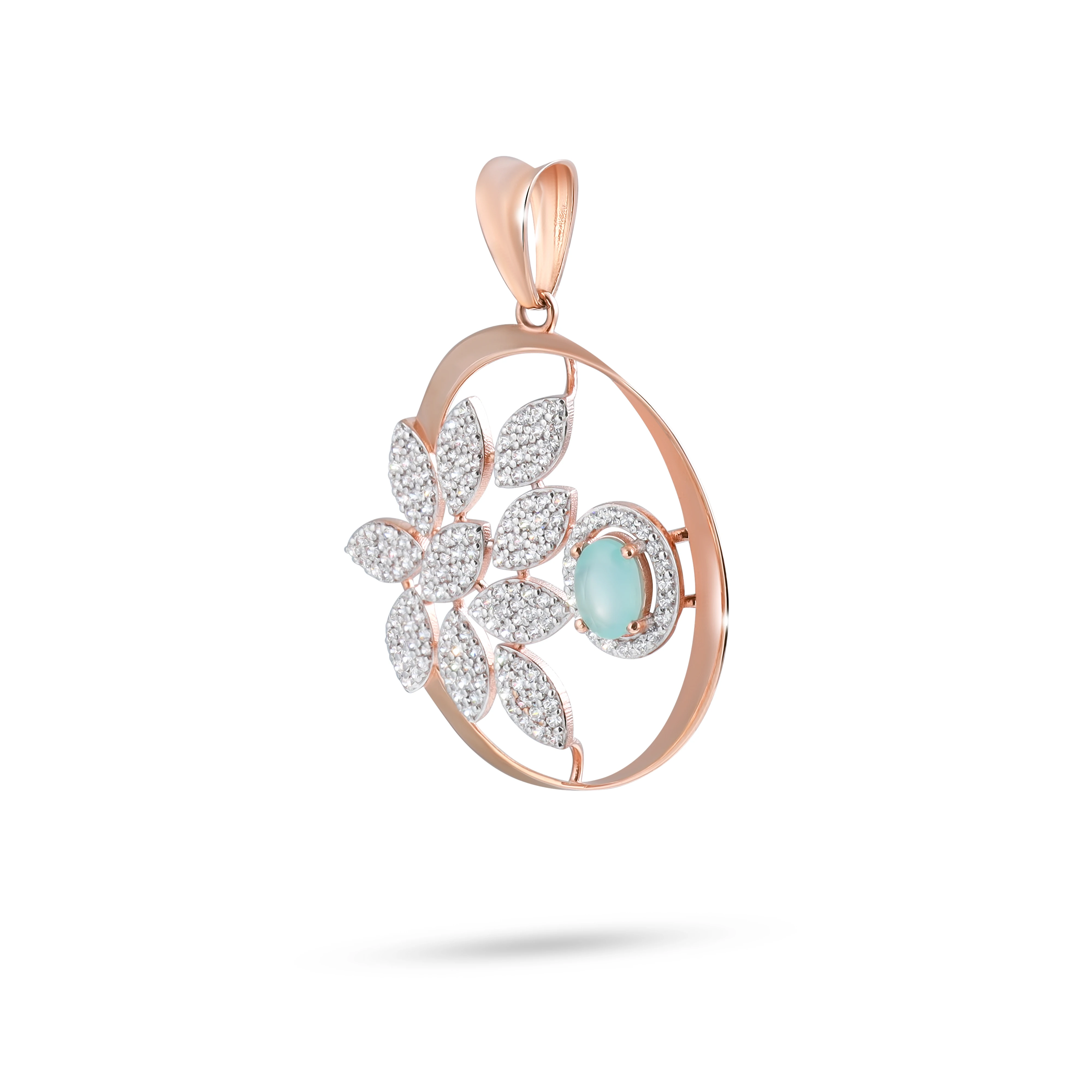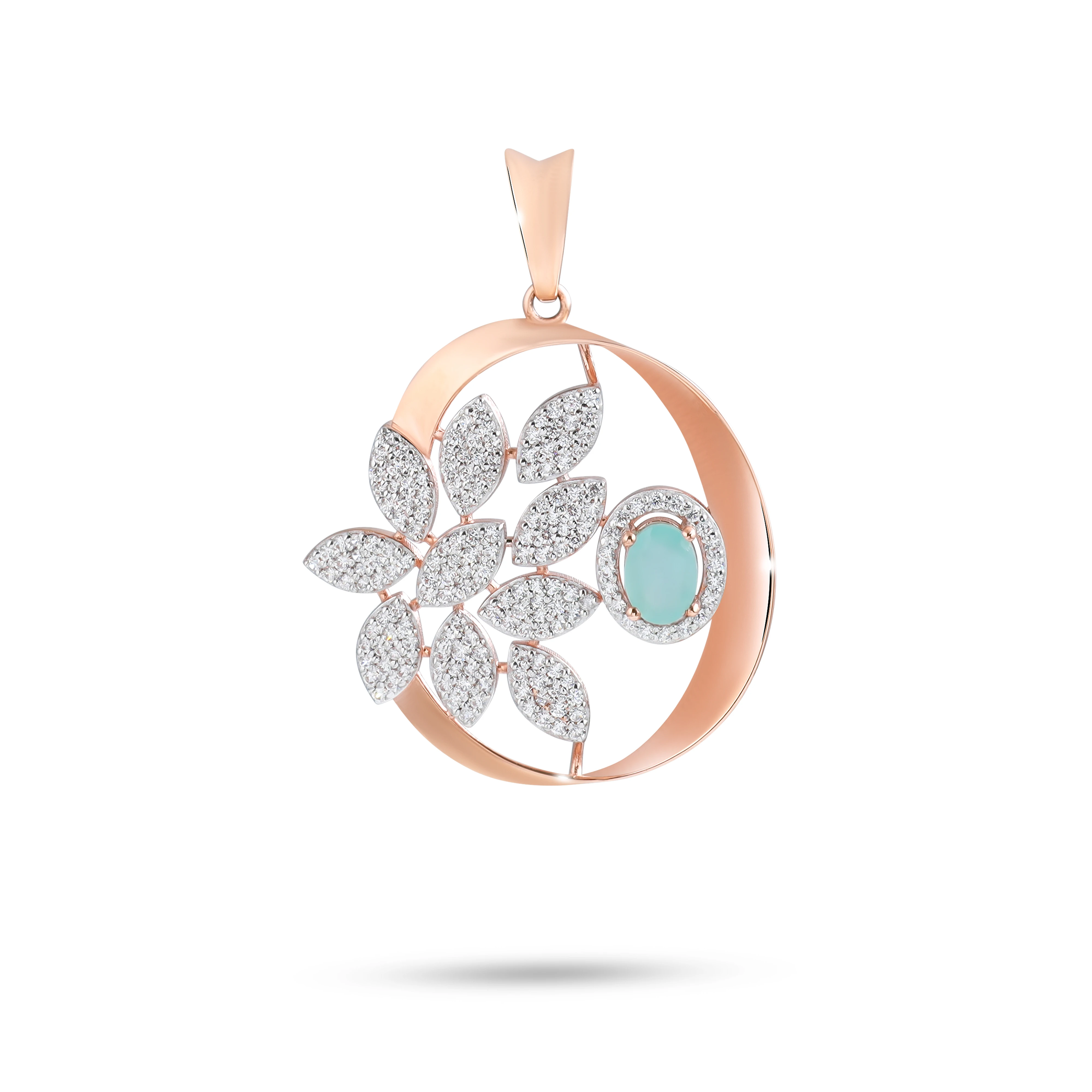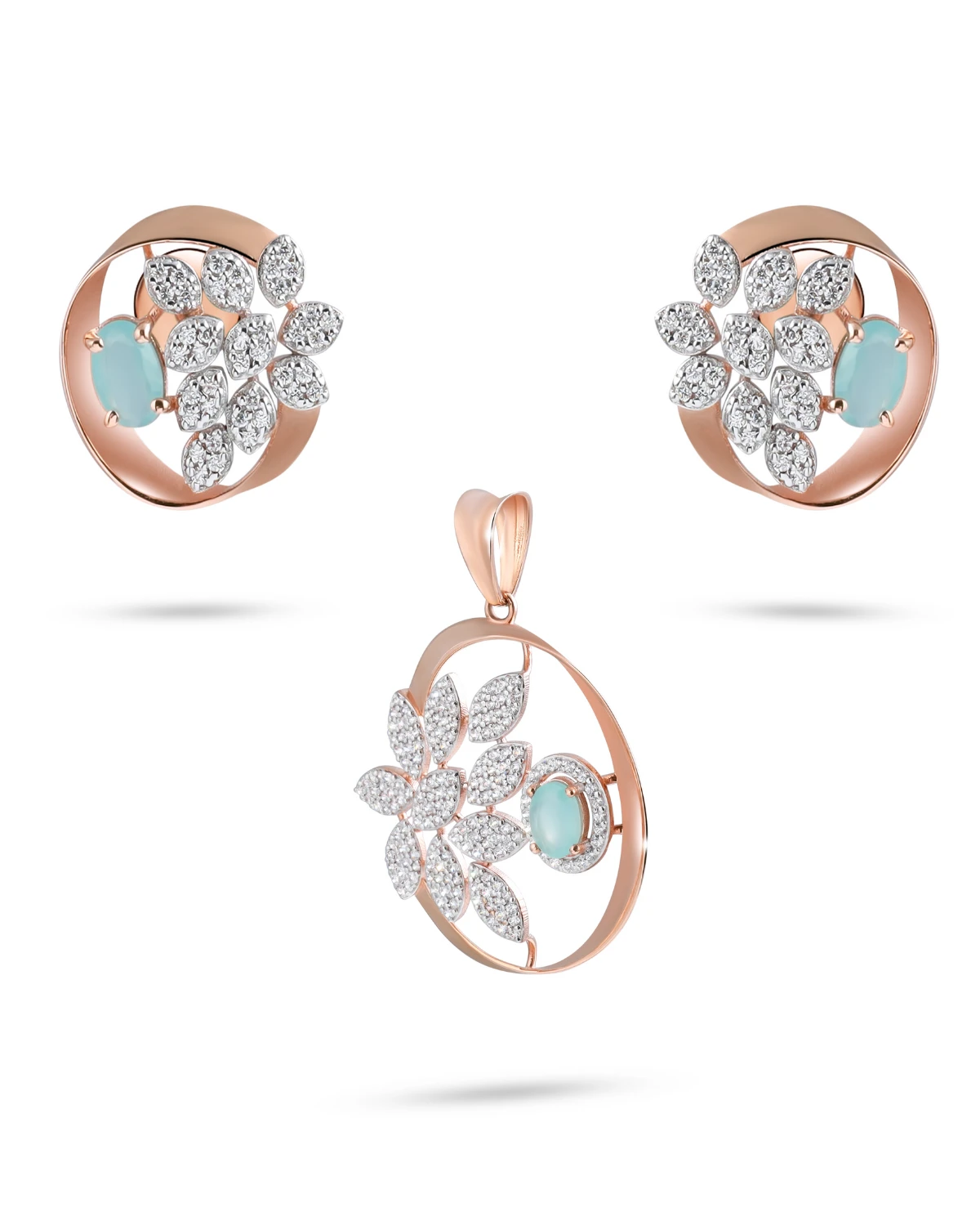 A radiant rose gold pendant set with matching studs featuring a circular halo of sparkling