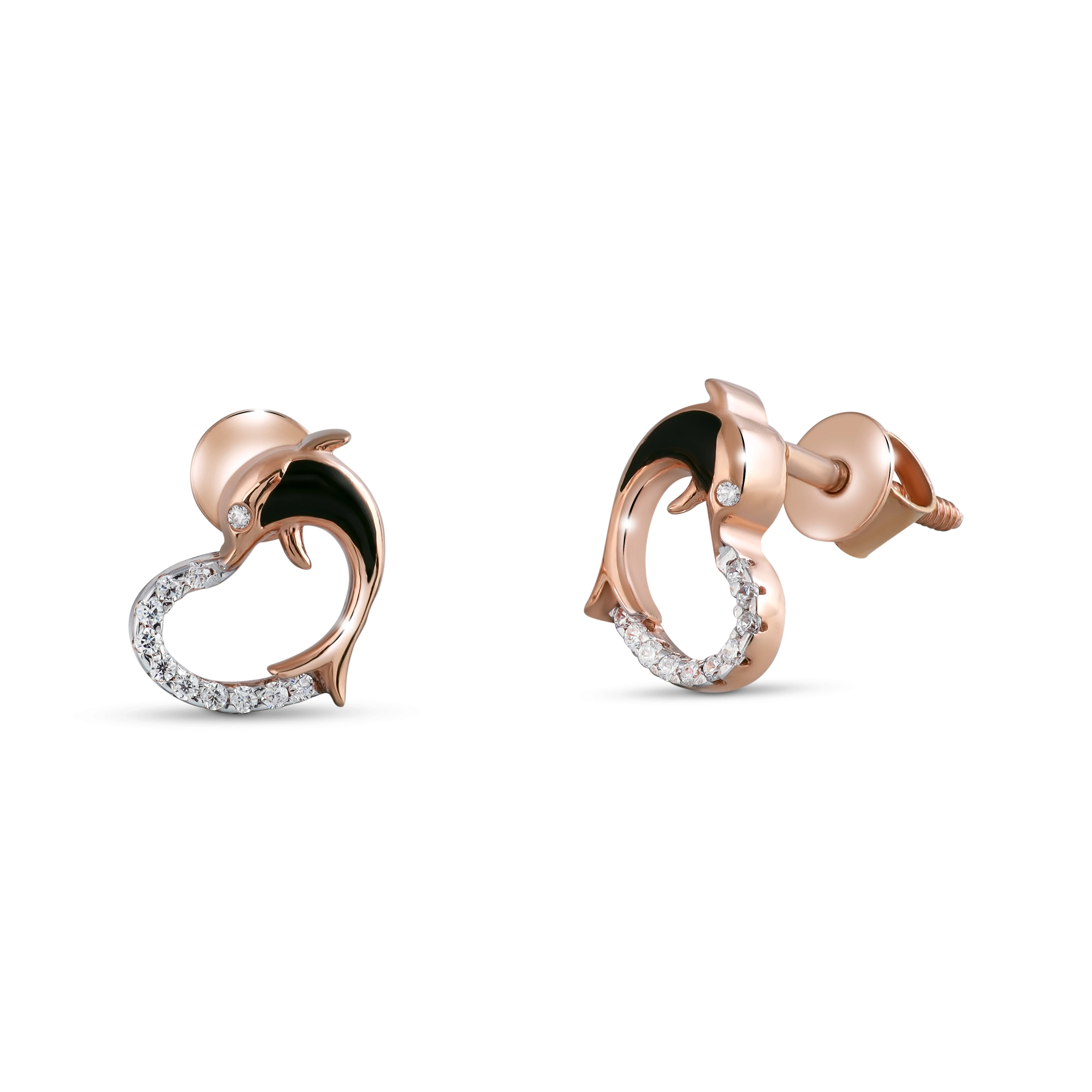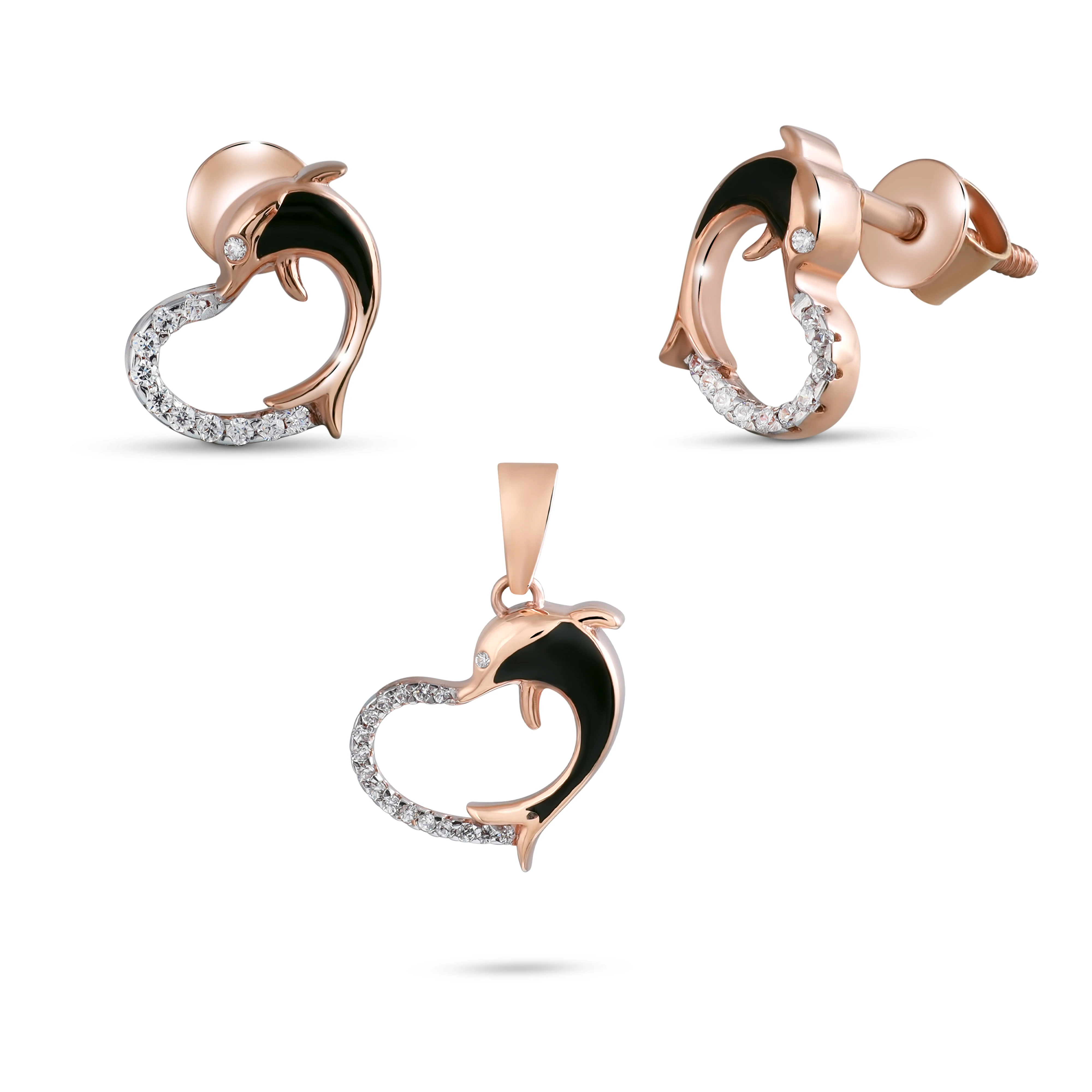 An elegant jewelry set comprising a pendant and a pair of earrings. Each piece features a charming dolphin forming a heart shape with its gracefully curved body. Crafted in a warm rose gold tone, the design is enriched with a sparkling array of white stones embedded along one side of the heart, adding a touch of brilliance.