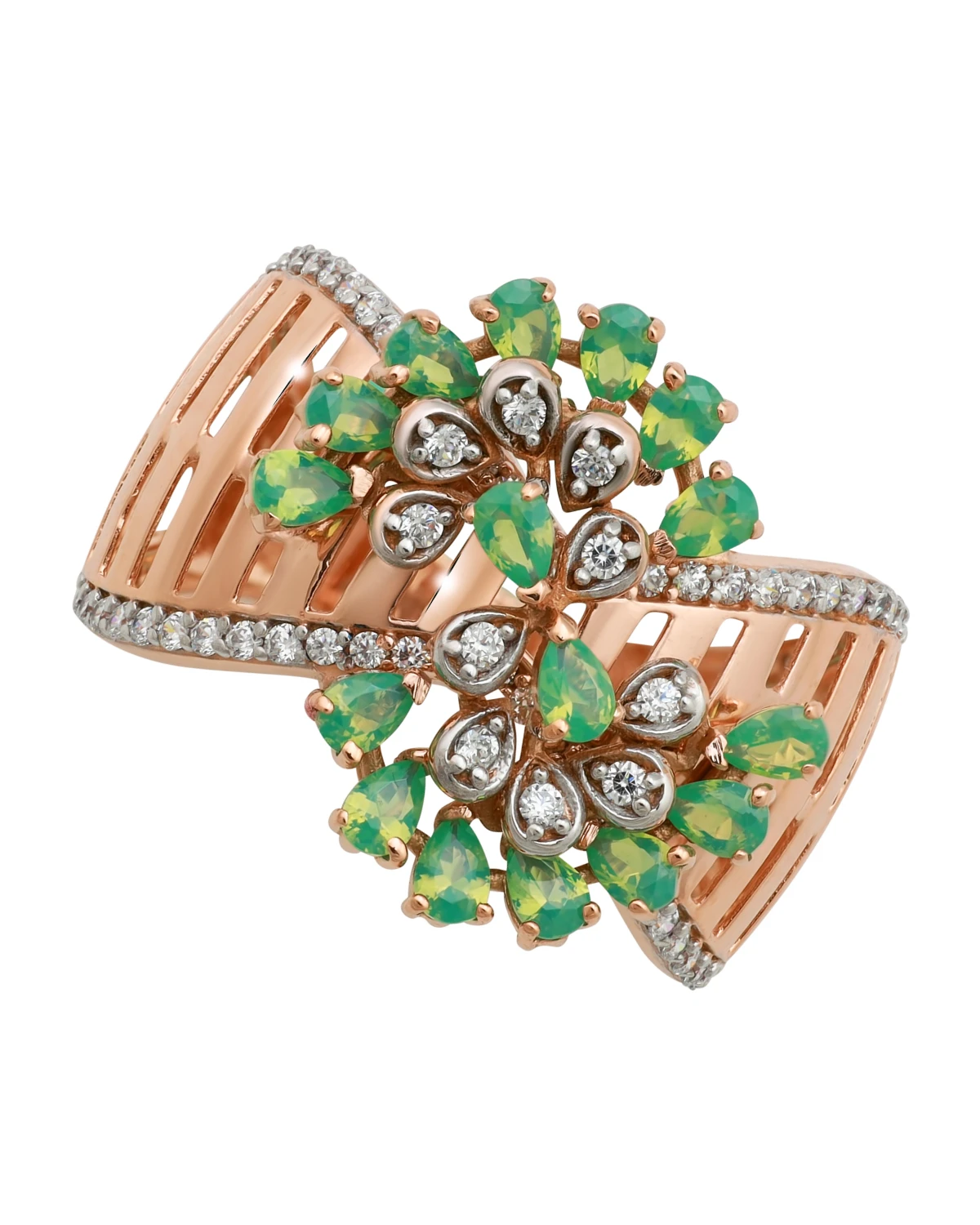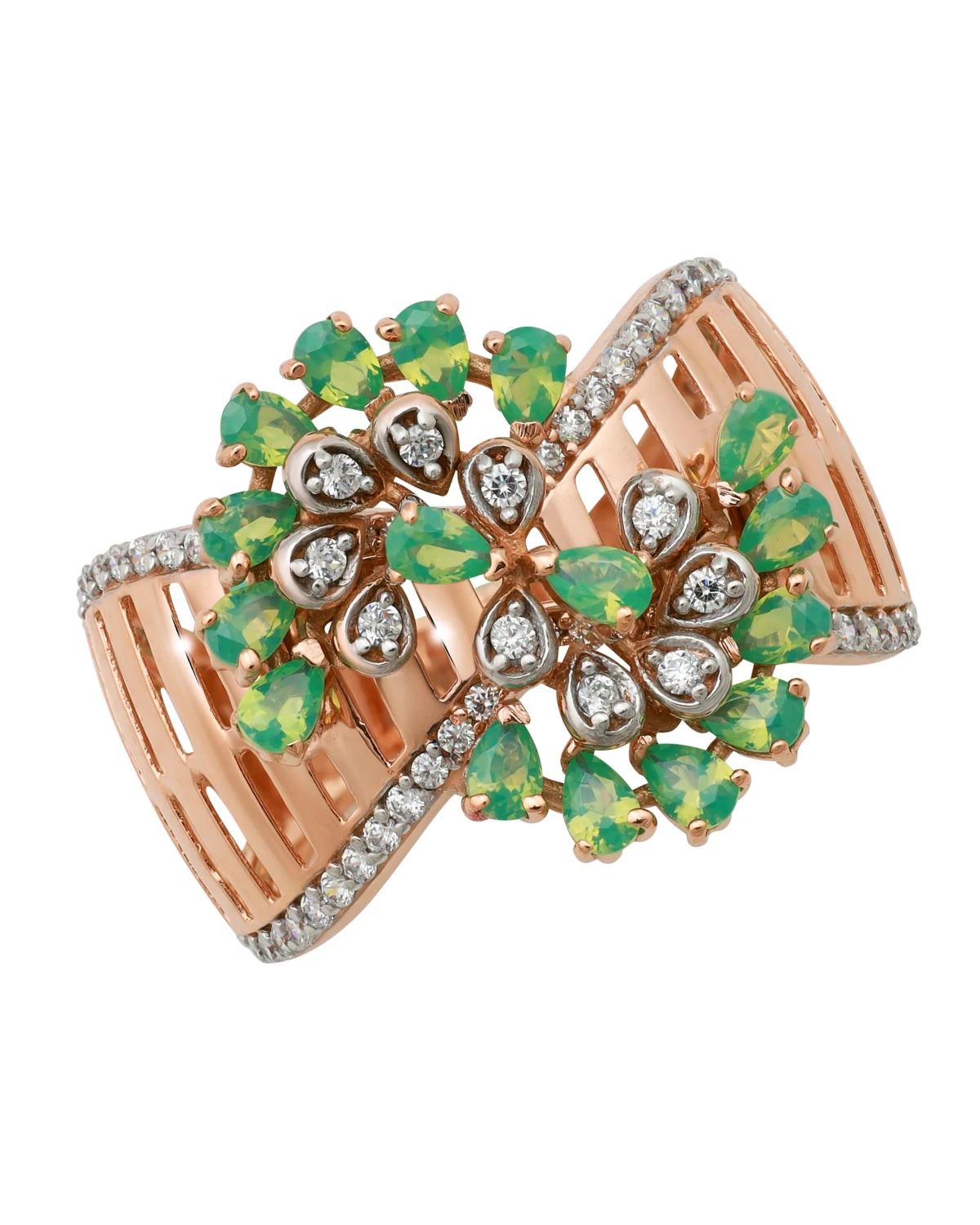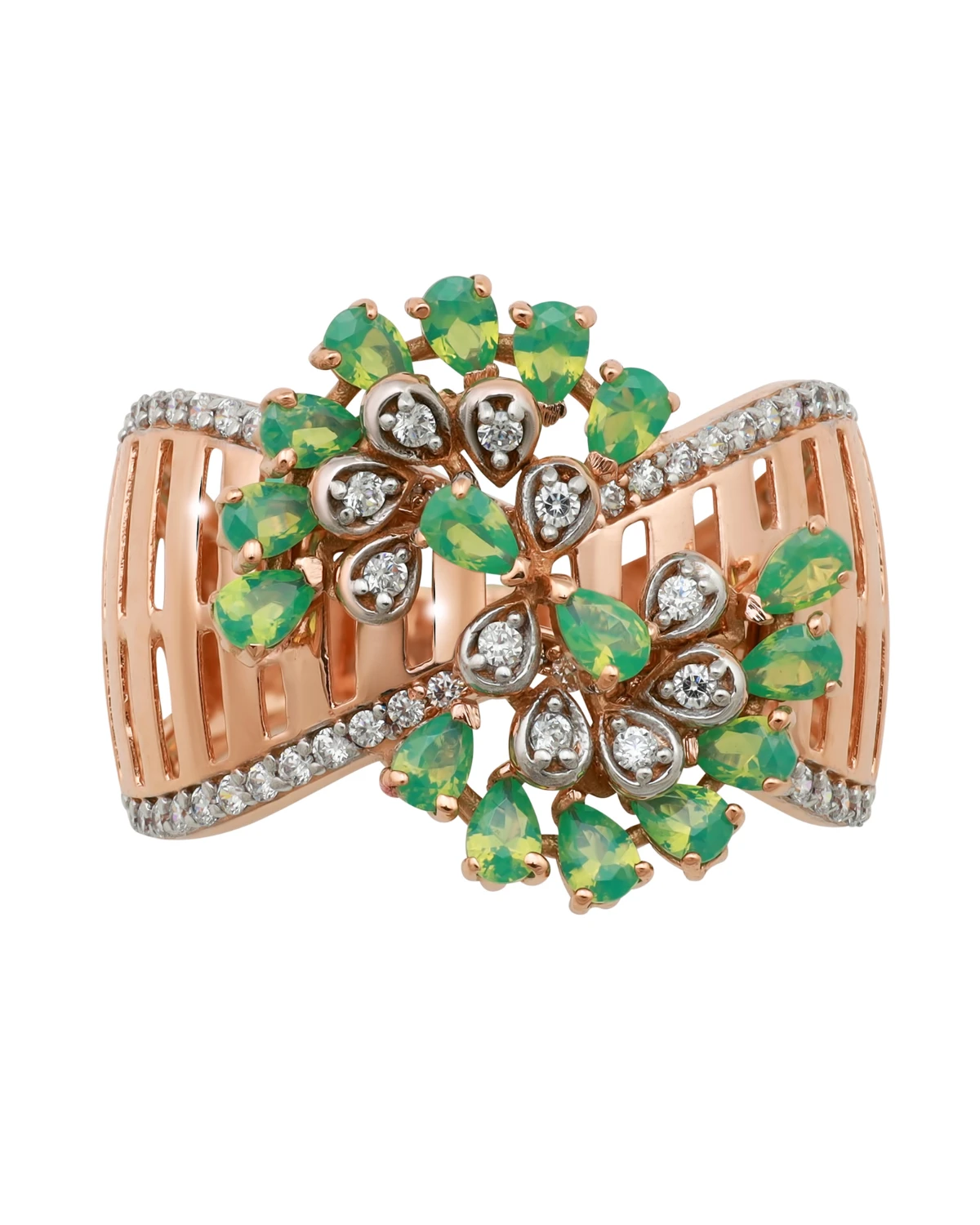 A soft gold band with cz diamonds & color stone that shimmer like soft, tranquil light, perfect for symbolizing peaceful love.