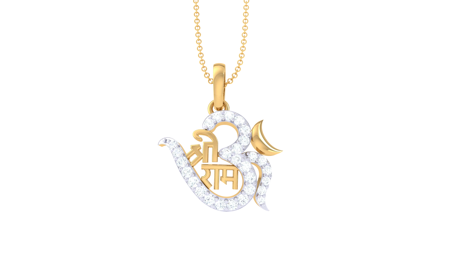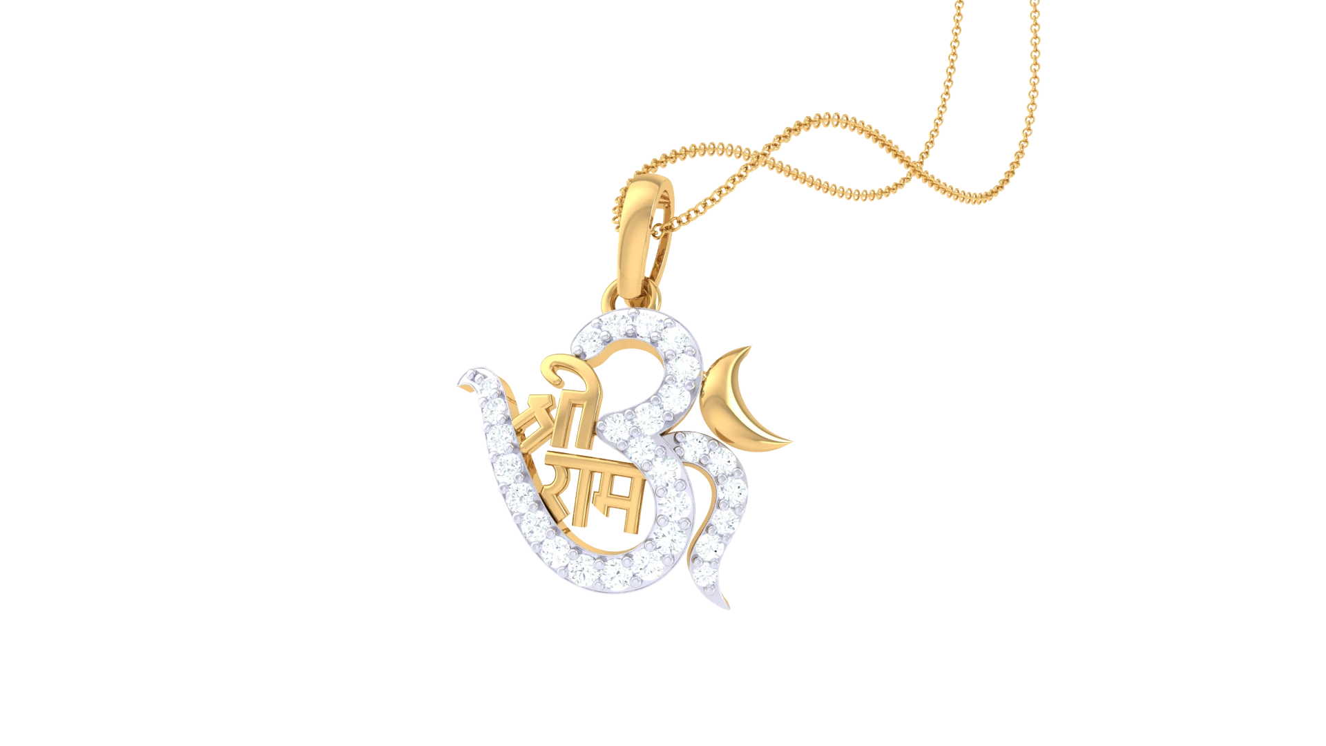 A sleek and elegant gold pendant featuring the name "Ram Chandra" along with intricate diamond accents. This piece represents the purity, righteousness, and virtue that Lord Ram embodies, perfect for anyone seeking to lead a life of moral integrity and devotion.( Chain not included in This product )