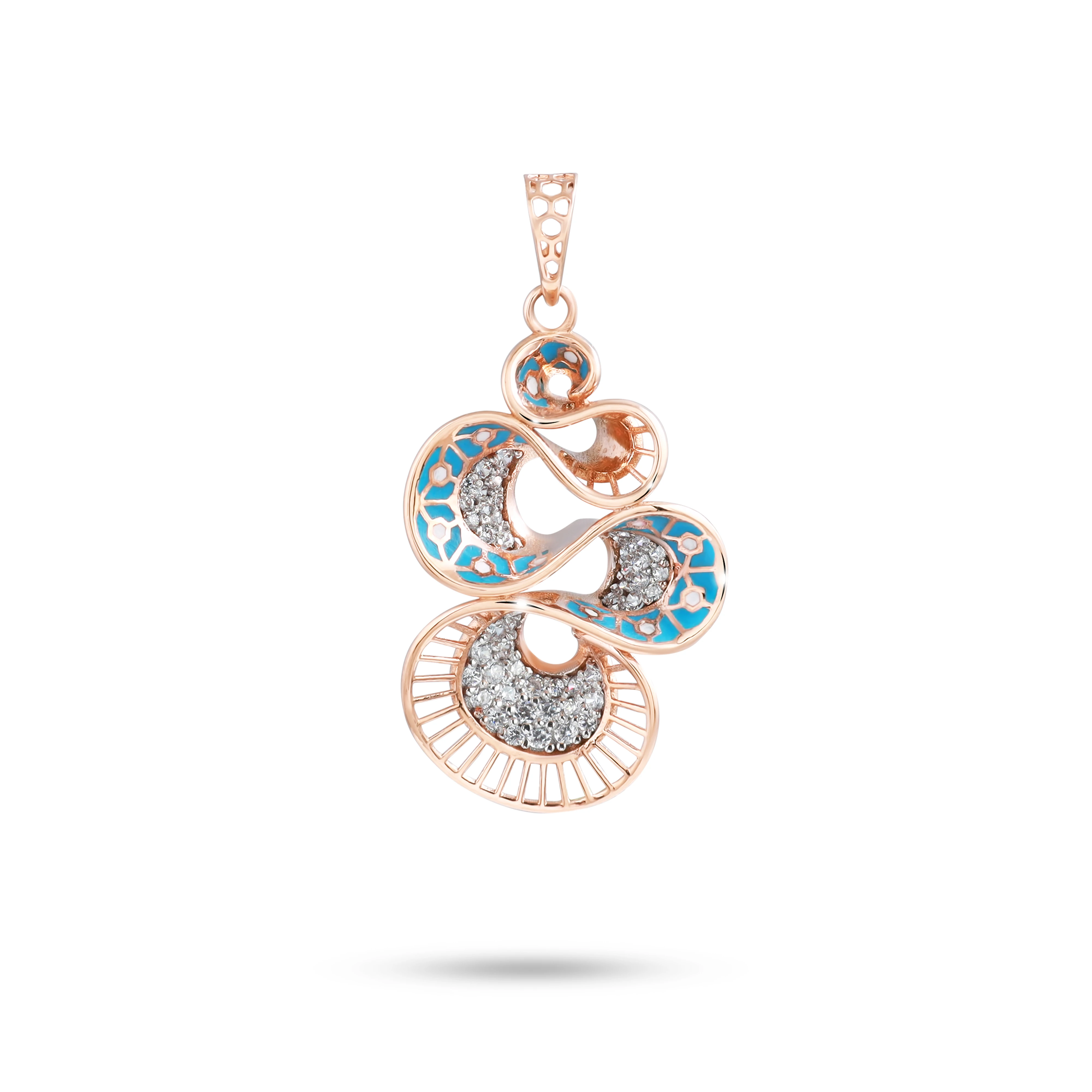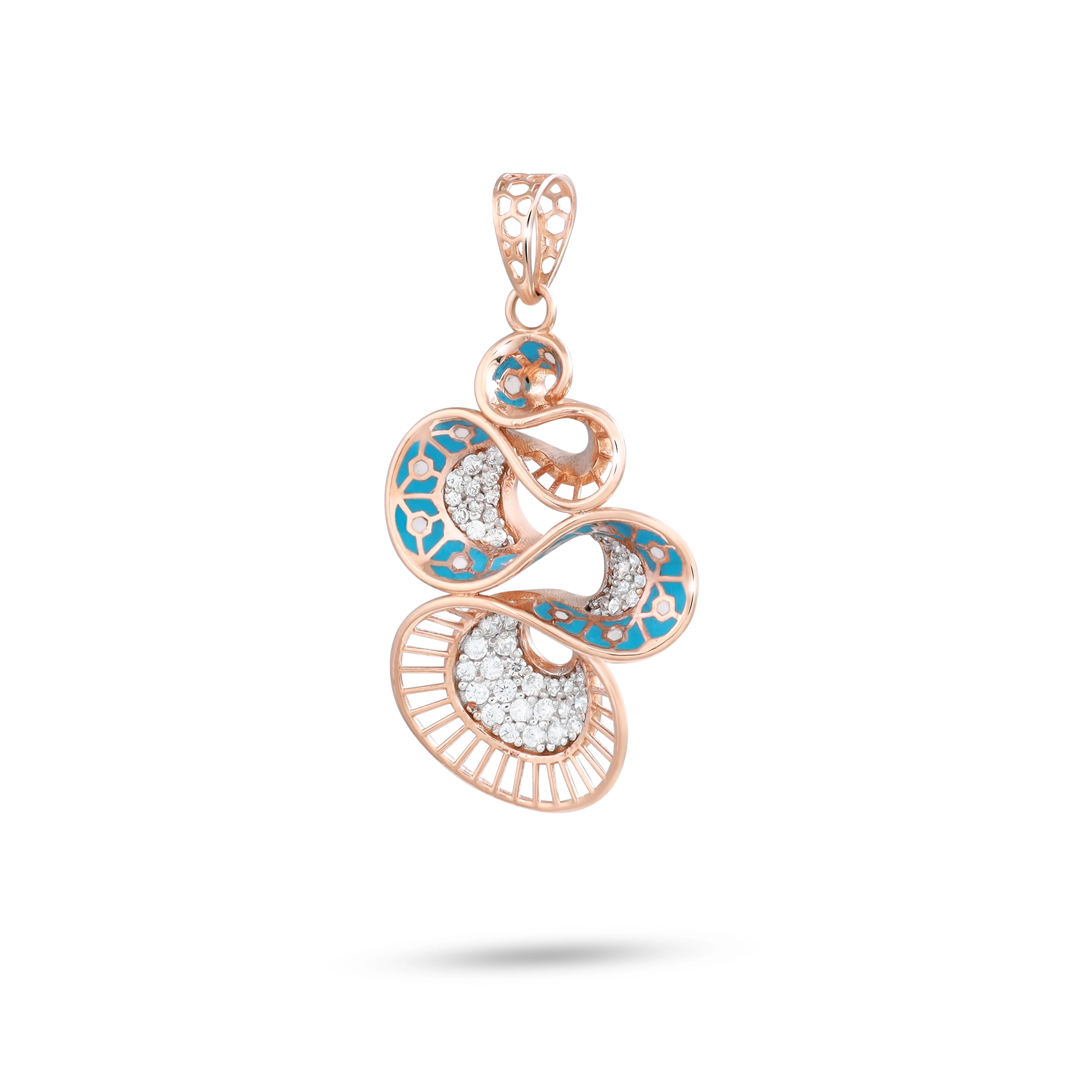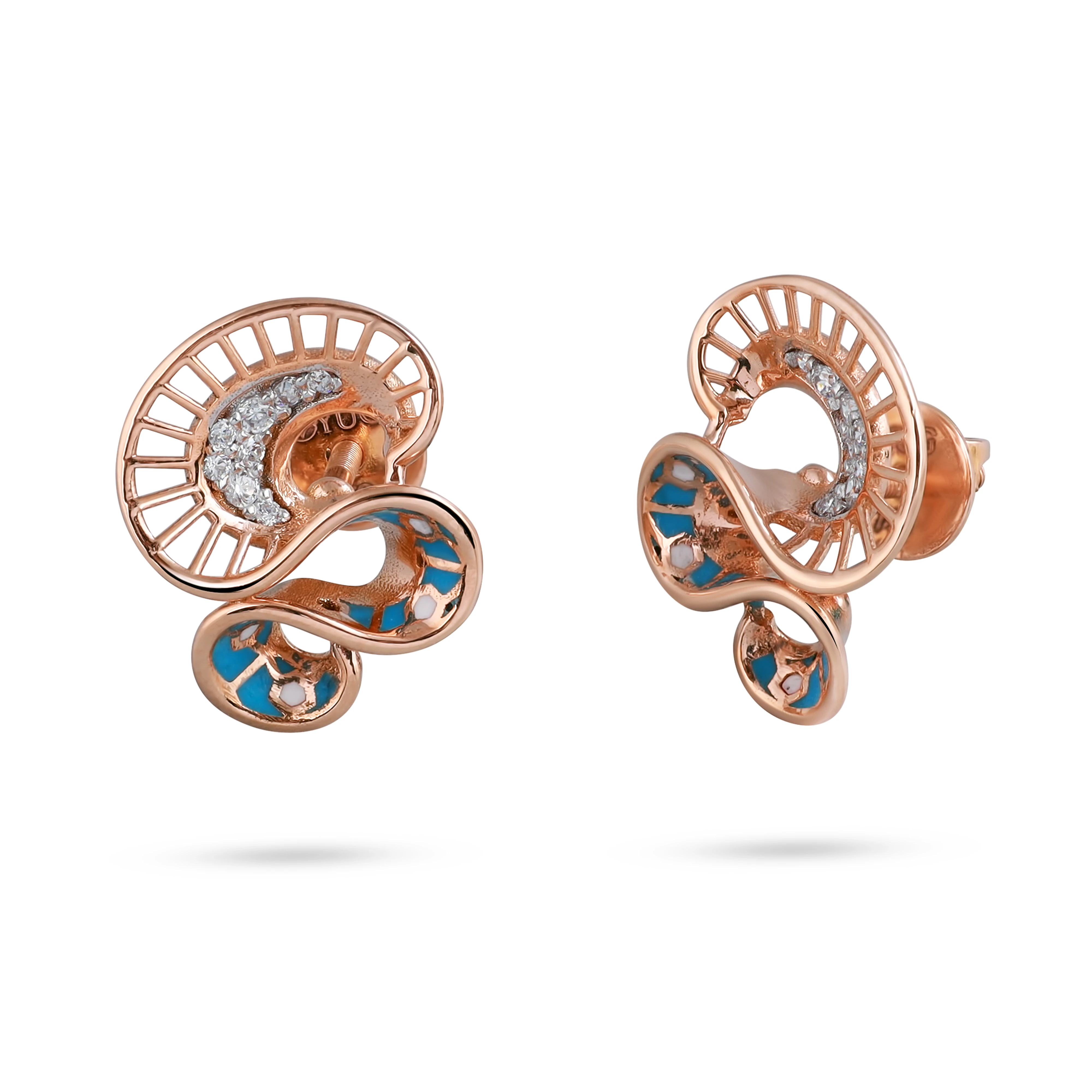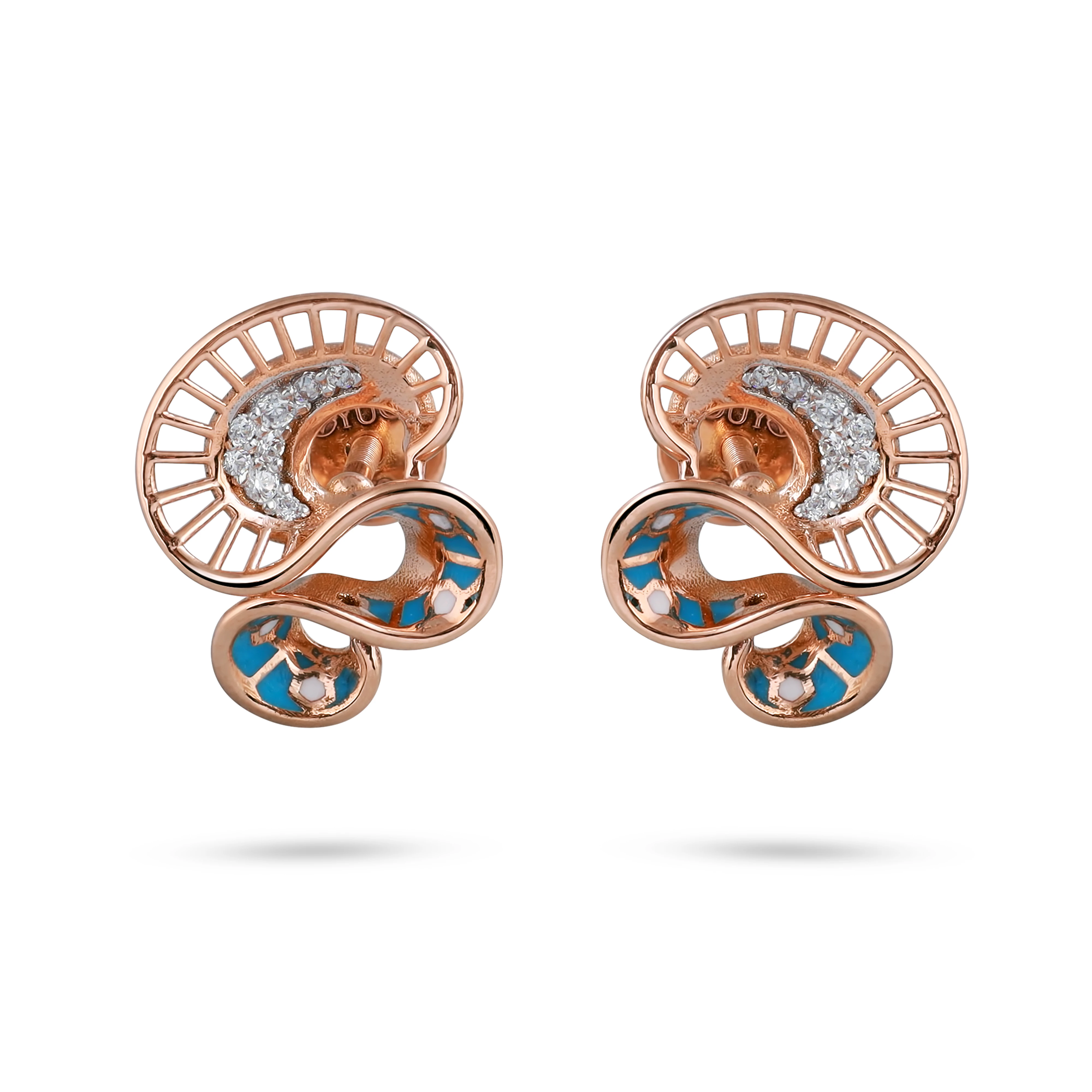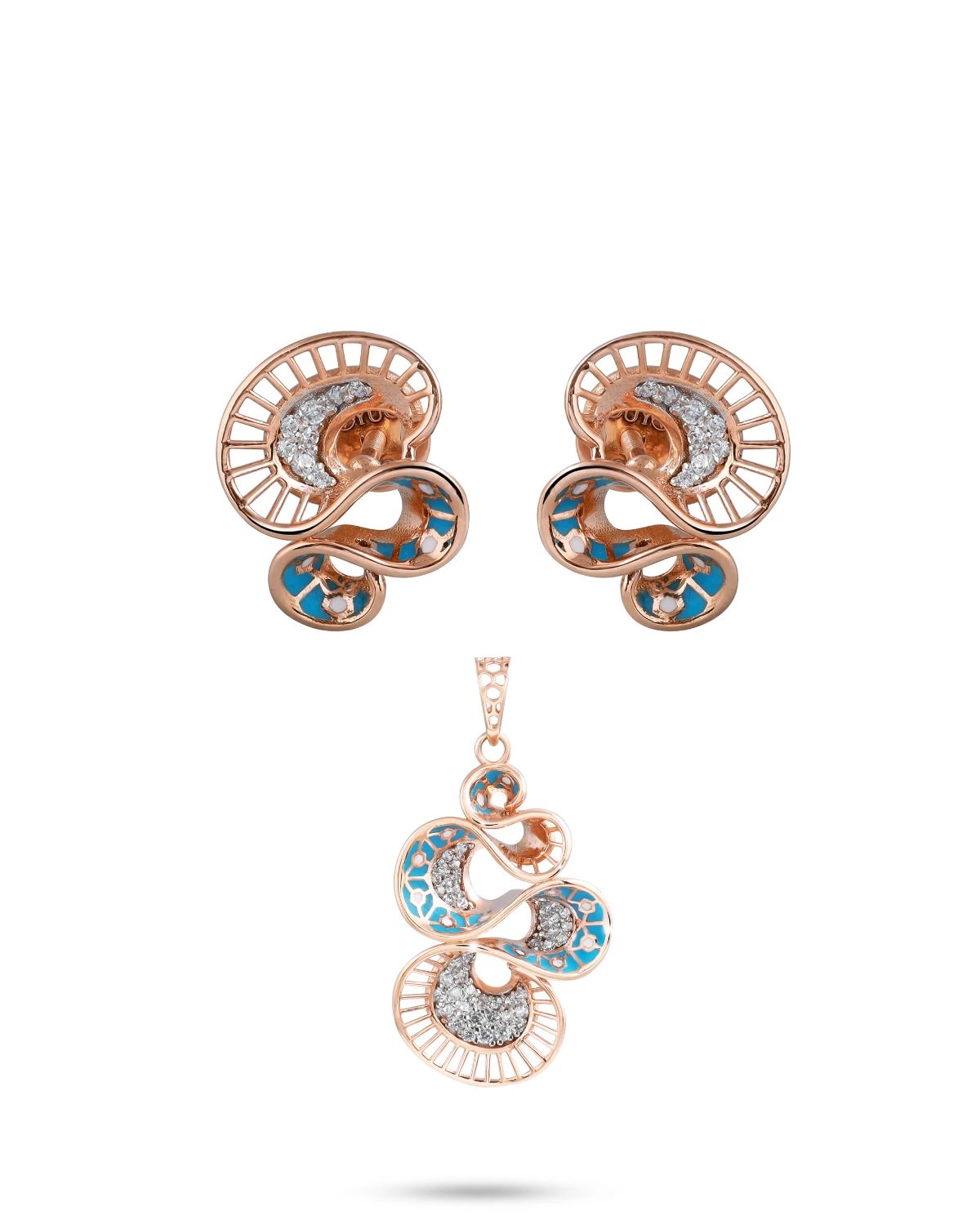 A dainty pendant shaped like angel wings in rose gold, with matching studs accented with