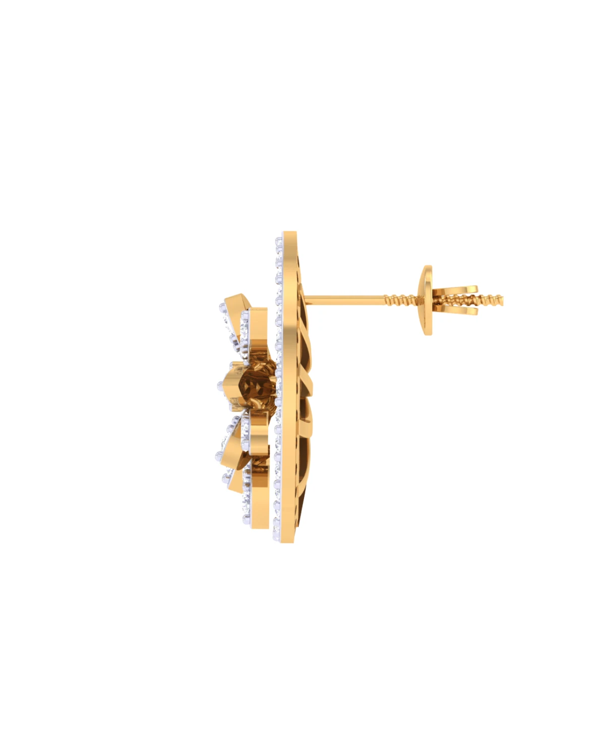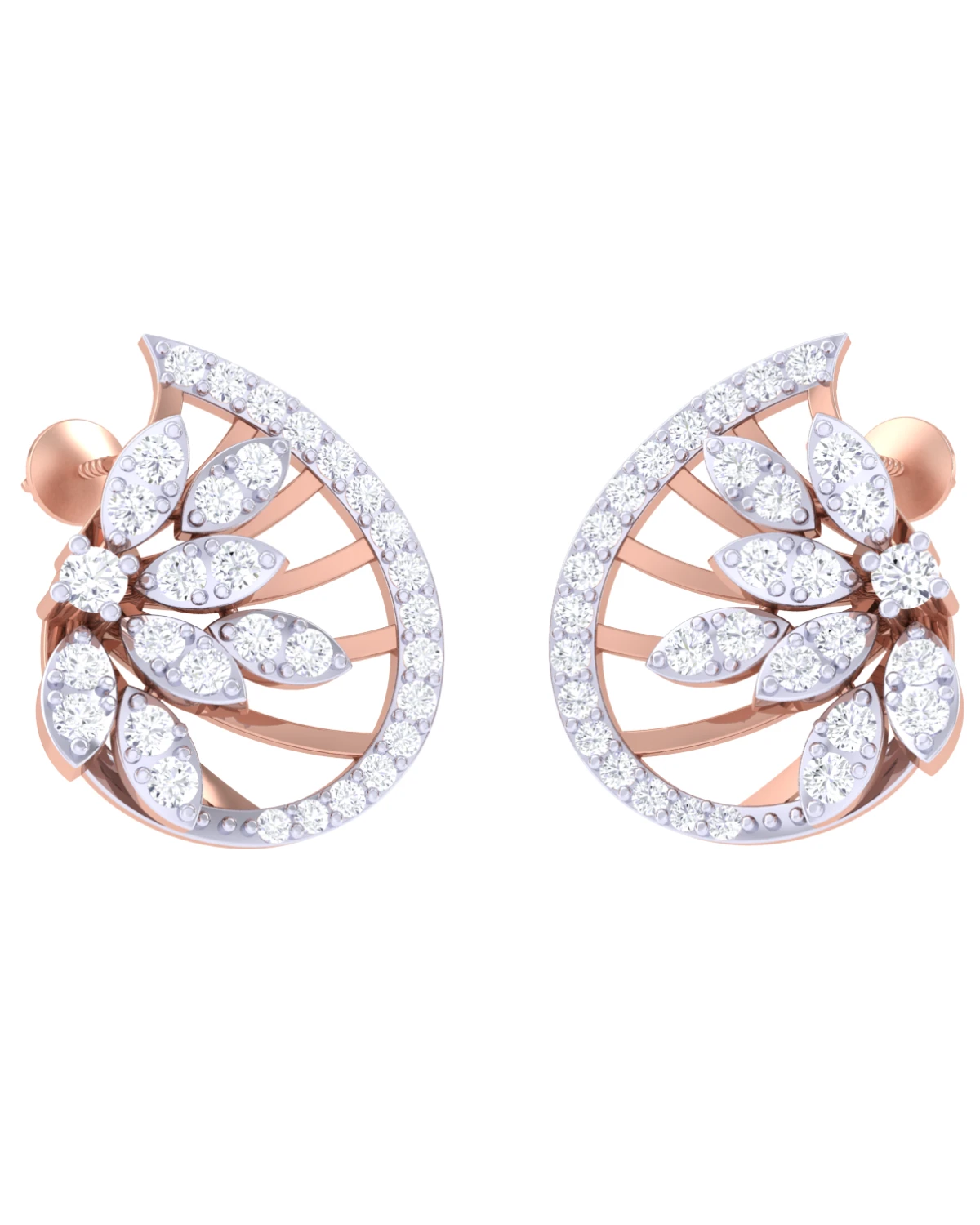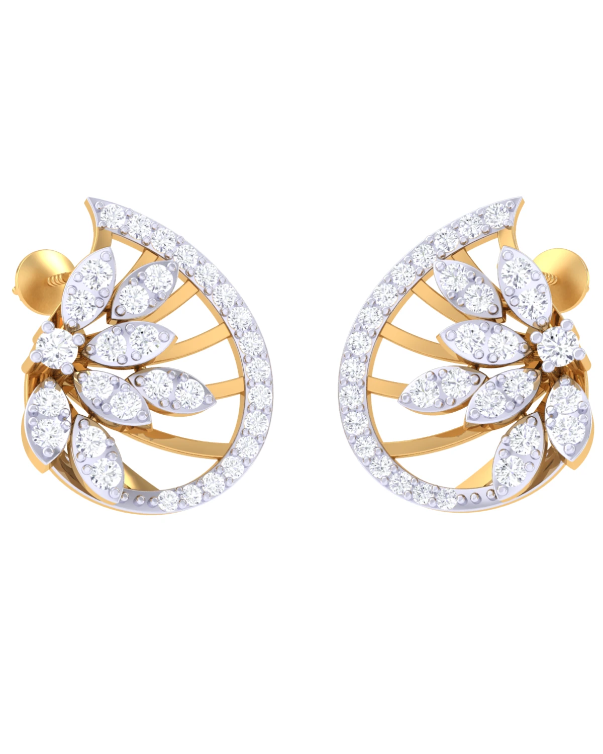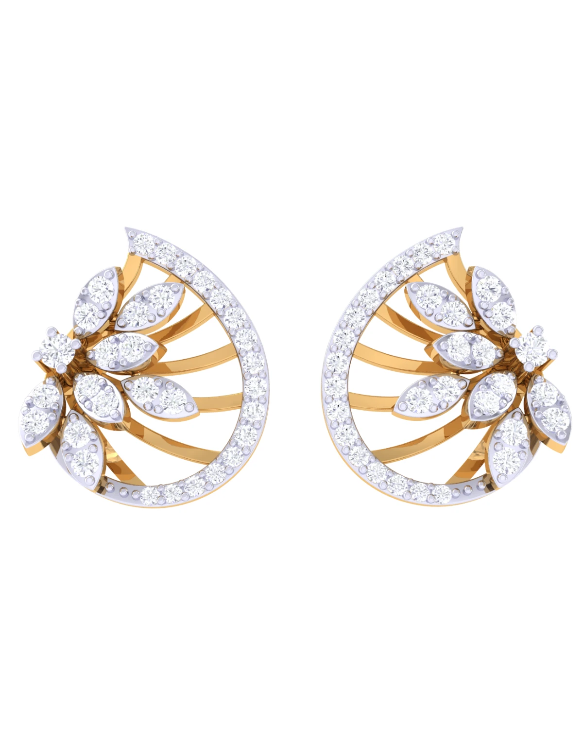 These 18k lab-grown diamond earrings are stud-style with a crescent and floral design. Each earring features a semi-circle frame in 18k gold, encrusted with small, round lab-grown diamonds along its outer edge, creating a sparkling outline.