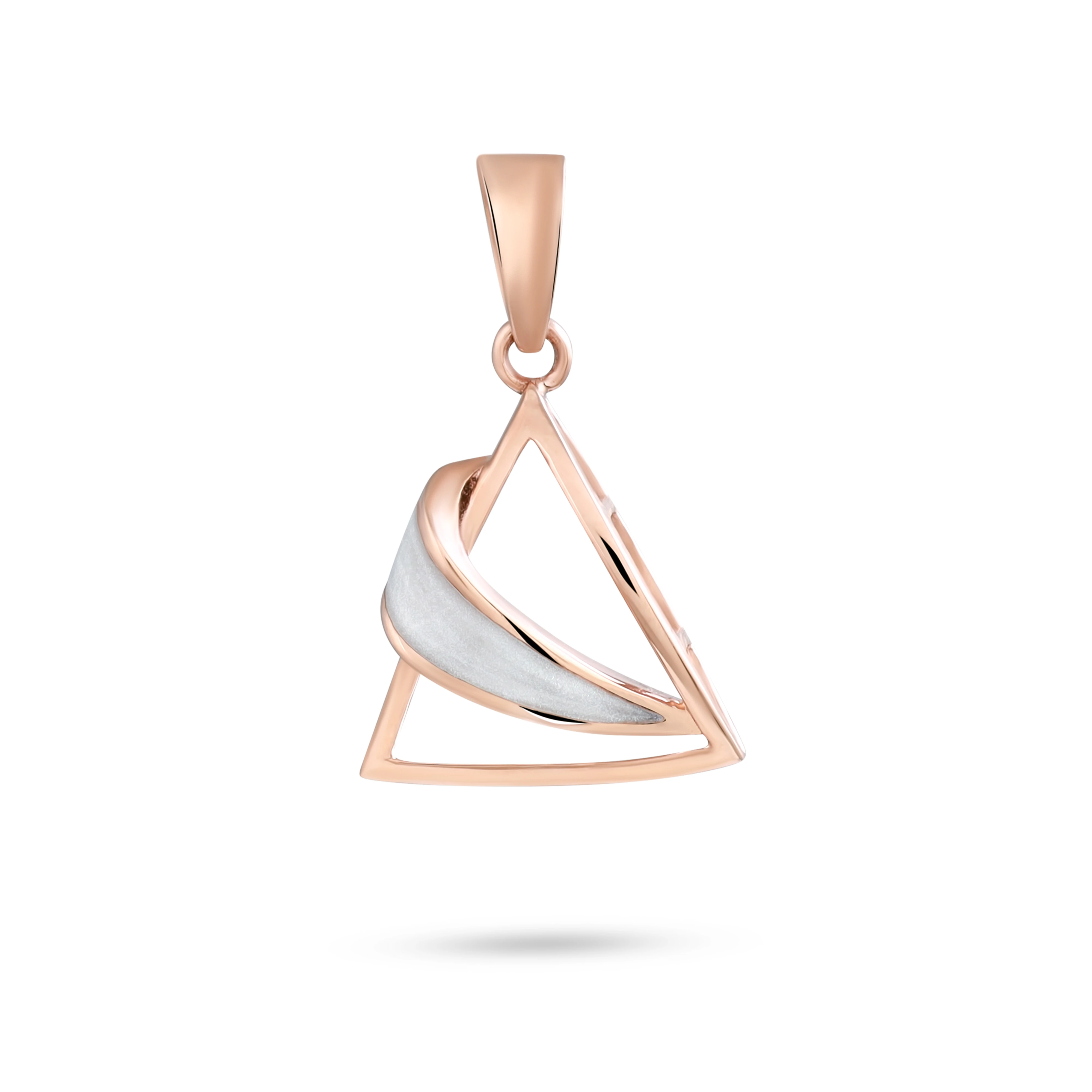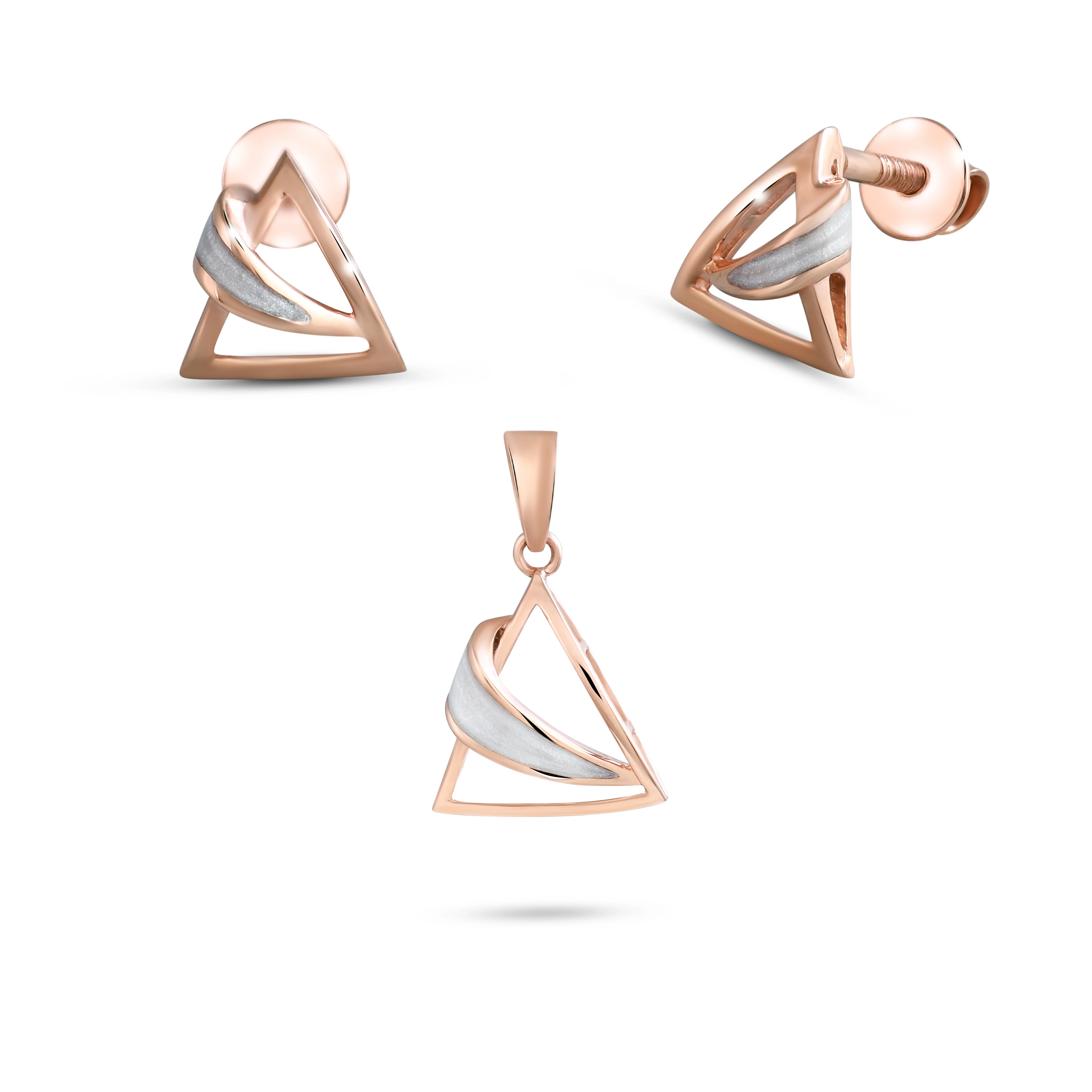 A modern and minimalist jewelry set comprising a pendant and matching earrings. Each piece showcases a sleek, open triangle frame crafted in rose gold, embodying geometric elegance.