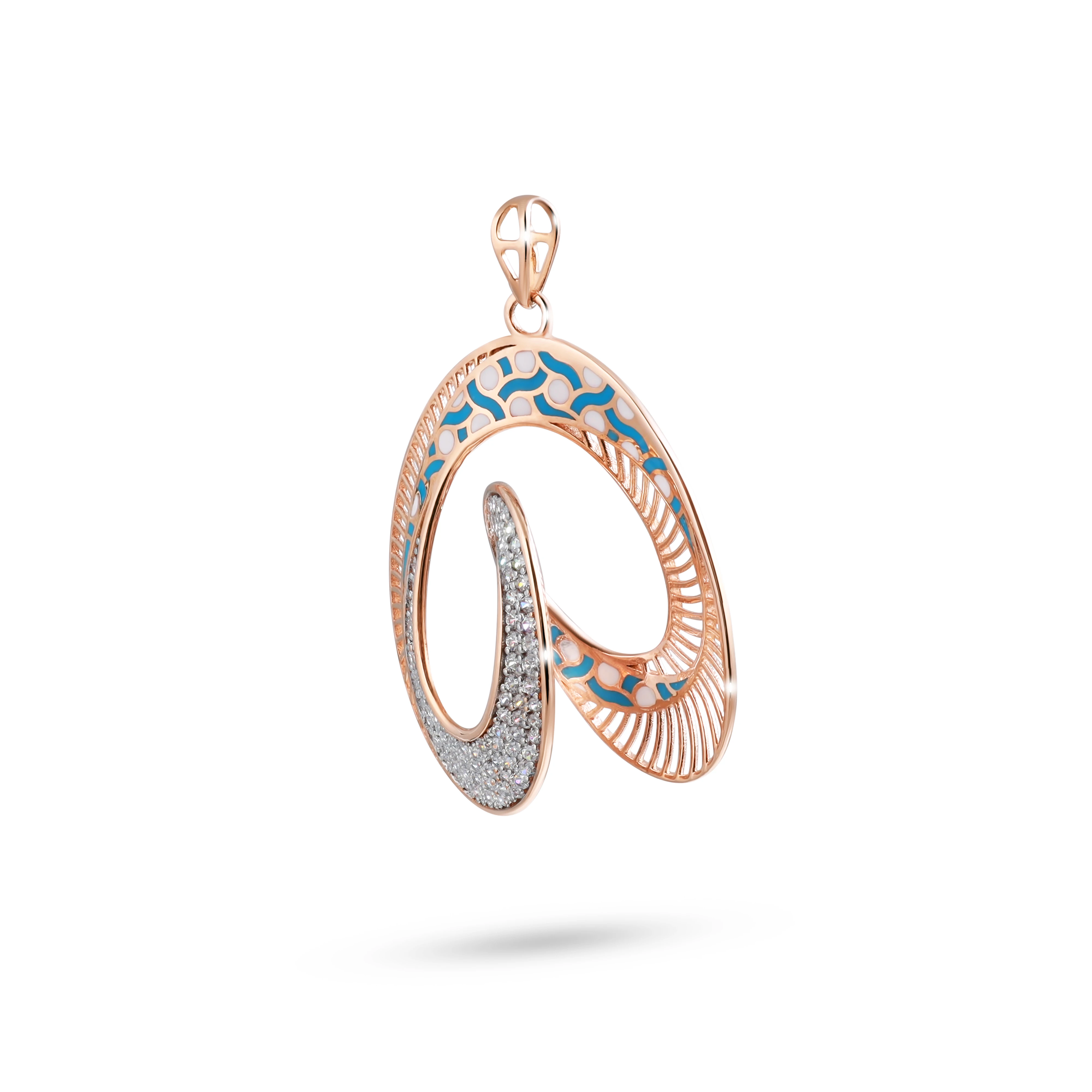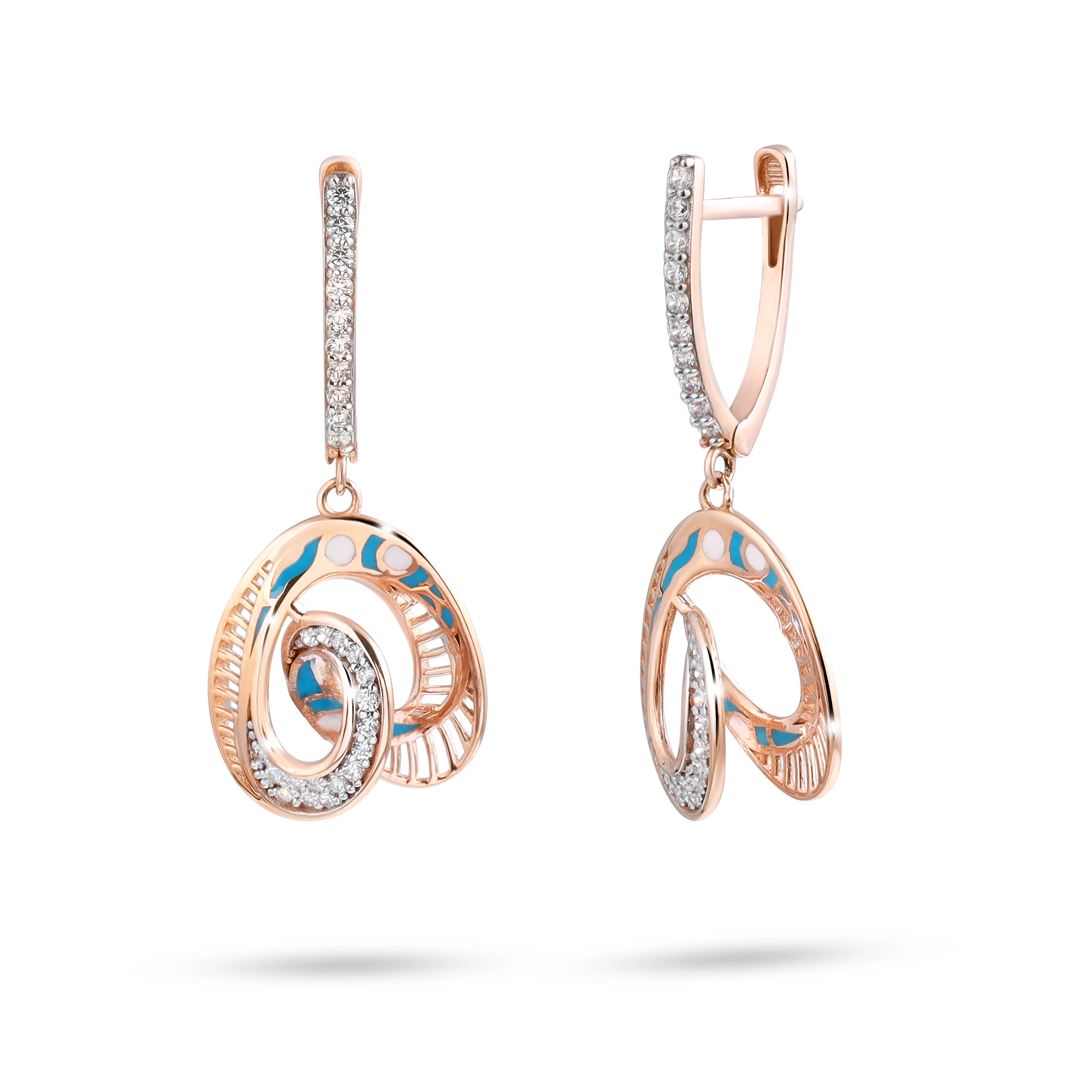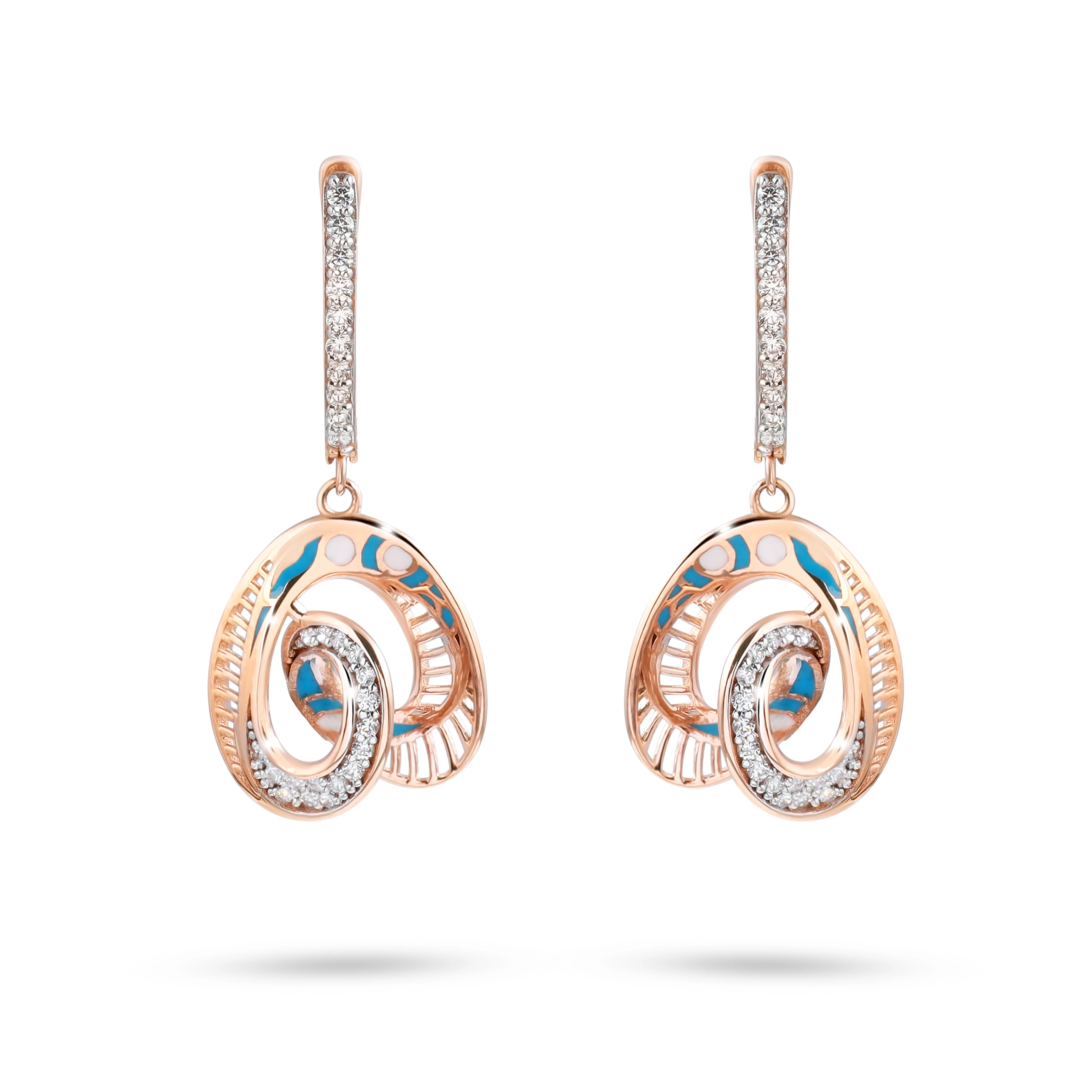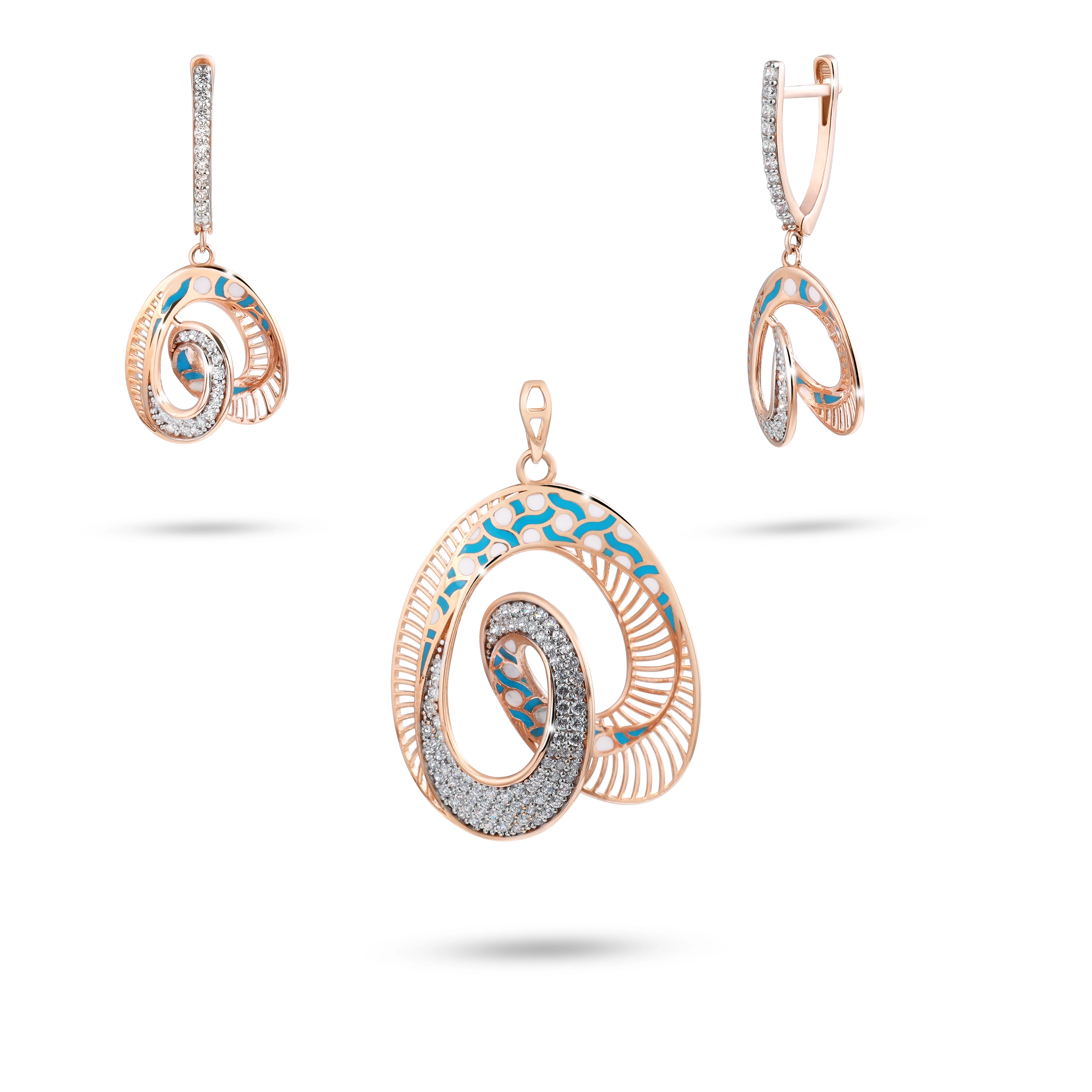 A layered flower motif in dual-toned blue and white enamel, with matching studs capturing